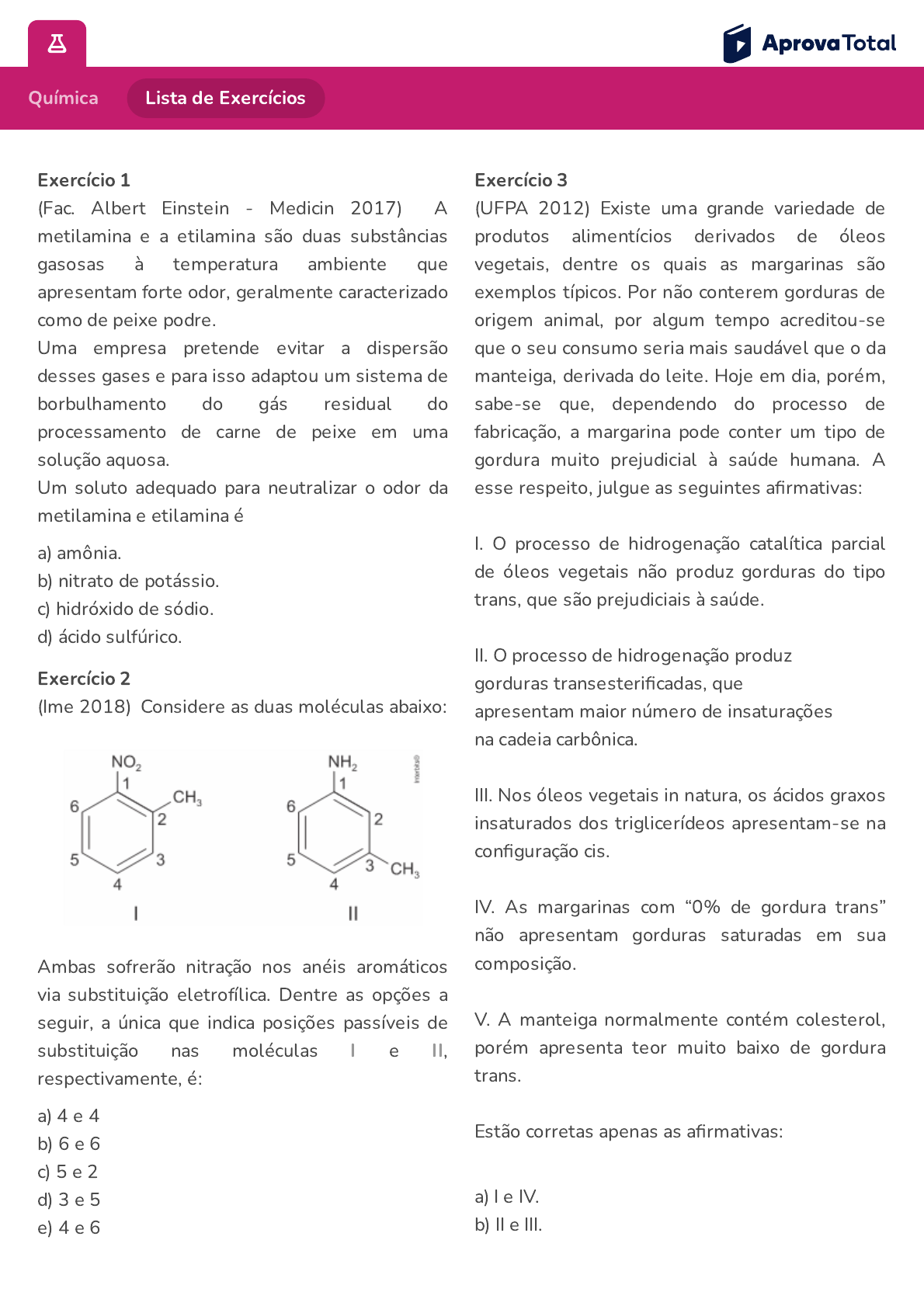 https://aprovatotal.com.br/medio/quimica/exercicios/reacoes-organicas/ex.5-introducao-as-reacoes-organicas 1/58 Química Lista de Exercícios Exercício 1 (Fac. Albert Einstein - Medicin 2017) A metilamina e a etilamina são duas substâncias gasosas à temperatura ambiente que apresentam forte odor, geralmente caracterizado como de peixe podre. Uma empresa pretende evitar a dispersão desses gases e para isso adaptou um sistema de borbulhamento do gás residual do processamento de carne de peixe em uma solução aquosa. Um soluto adequado para neutralizar o odor da metilamina e etilamina é a) amônia. b) nitrato de potássio. c) hidróxido de sódio. d) ácido sulfúrico. Exercício 2 (Ime 2018) Considere as duas moléculas abaixo: Ambas sofrerão nitração nos anéis aromáticos via substituição eletrofílica. Dentre as opções a seguir, a única que indica posições passíveis de substituição nas moléculas I e II, respectivamente, é: a) 4 e 4 b) 6 e 6 c) 5 e 2 d) 3 e 5 e) 4 e 6 Exercício 3 (UFPA 2012) Existe uma grande variedade de produtos alimentícios derivados de óleos vegetais, dentre os quais as margarinas são exemplos típicos. Por não conterem gorduras de origem animal, por algum tempo acreditou-se que o seu consumo seria mais saudável que o da manteiga, derivada do leite. Hoje em dia, porém, sabe-se que, dependendo do processo de fabricação, a margarina pode conter um tipo de gordura muito prejudicial à saúde humana. A esse respeito, julgue as seguintes a�rmativas: I. O processo de hidrogenação catalítica parcial de óleos vegetais não produz gorduras do tipo trans, que são prejudiciais à saúde. II. O processo de hidrogenação produz gorduras transesteri�cadas, que apresentam maior número de insaturações na cadeia carbônica. III. Nos óleos vegetais in natura, os ácidos graxos insaturados dos triglicerídeos apresentam-se na con�guração cis. IV. As margarinas com “0% de gordura trans” não apresentam gorduras saturadas em sua composição. V. A manteiga normalmente contém colesterol, porém apresenta teor muito baixo de gordura trans. Estão corretas apenas as a�rmativas: a) I e IV. b) II e III. https://aprovatotal.com.br/medio/quimica/exercicios/reacoes-organicas/ex.5-introducao-as-reacoes-organicas 2/58 c) III e V. d) I, III e V. e) II, IV e V. Exercício 4 (UEL 2011) Resolva as etapas a seguir. Etapa 1 - Substituir os hidrogênios dos carbonos insaturados do but-2-eno por radicais isopropila e etila. Etapa 2- Submeter a substância resultante da etapa 1 a uma reação de hidrogenaçã catalítica. Etapa 3 - Submeter a substância resultante da etapa 2 a uma reação de monocloração. Considere as a�rmativas a seguir. I. A substância resultante da etapa 1 é o 2,3,4 trimetil hex-3-eno. II. A substância obtida na etapa 2 é um hidrocarboneto de cadeia saturada. III. As substâncias resultantes das etapas 1 e 2 são isômeros de função. IV. Na etapa 3, átomo de cloro substituirá preferencialmente o hidrogênio de carbonos primários. Assinale a alternativa correta. a) Somente as a�rmativas I e II são corretas. b) Somente as a�rmativas I e IV são corretas. c) Somente as a�rmativas III e IV são corretas. d) Somente as a�rmativas I, II e III são corretas. e) Somente as a�rmativas II, III e IV são corretas. Exercício 5 (UFES) O óleo obtido das sementes de diversos vegetais, principalmente da mamona, está sendo usado para a fabricação do biodiesel. Analise as a�rmativas a seguir sobre os óleos vegetais. I - São formados basicamente por ésteres de ácidos graxos saturados com o glicerol. II - É chamada de saponi�cação a reação do óleo com metóxido de sódio em metanol. III - Durante a extração de óleos vegetais, é comum extrair também colesterol, que é uma substância lipossolúvel. IV - São formados por triglicerídeos, que, perante hidrólise alcalina, levam à formação de sais de ácidos carboxílicos de cadeia longa e propano-1,2,3-triol. V - Sofrem reações de hidrogenação catalítica ou adição de Br2. São CORRETAS apenas: a) I e II. b) II e III. c) II e IV. d) III e V. e) IV e V. Exercício 6 (UFJF 2007) O colesterol, cuja estrutura está representada a seguir, é disseminado amplamente no organismo humano e serve como um intermediário na biossíntese de todos os esteroides do corpo, sendo essencial para a vida. Entretanto, altos níveis de colesterol no sangue favorecem o desenvolvimento de arteriosclerose (endurecimento das veias). Os ataques cardíacos podem ocorrer, quando as placas contendo colesterol bloqueiam as artérias do coração. Com relação ao colesterol, assinale a alternativa CORRETA. https://aprovatotal.com.br/medio/quimica/exercicios/reacoes-organicas/ex.5-introducao-as-reacoes-organicas 3/58 a) Na estrutura do colesterol existem quatro átomos de carbono sp2. b) Na estrutura do colesterol existem três átomos de carbono primário. c) O colesterol possui as funções oxigenadas, álcool e fenol. d) O colesterol pode sofrer reações de adição, pois possui uma dupla ligação em sua estrutura. e) O colesterol não possui isômero óptico, pois não possui átomo de carbono assimétrico (carbono quiral). Exercício 7 (UEG 2016) Um mol de uma molécula orgânica foi submetido a uma reação de hidrogenação, obtendo-se ao �nal um mol do cicloalcano correspondente, sendo consumidos 2 g de H2(g) nesse processo. O composto orgânico submetido à reação de hidrogenação pode ser o: Dado: H = 1. a) cicloexeno b) 1,3-cicloexadieno c) benzeno d) 1,4-cicloexadieno e) naftaleno Exercício 8 (UPE 2013) O diálogo apresentado a seguir ocorreu em um supermercado quando uma cliente se aproximou de uma demonstradora de produtos alimentícios. – Senhora, por favor. A senhora não deseja experimentar a nossa margarina? É uma margarina sem gordura trans e sem colesterol! – Oh, amada, cadê? Hummm... Bem, se ela realmente for uma margarina, concordo que não