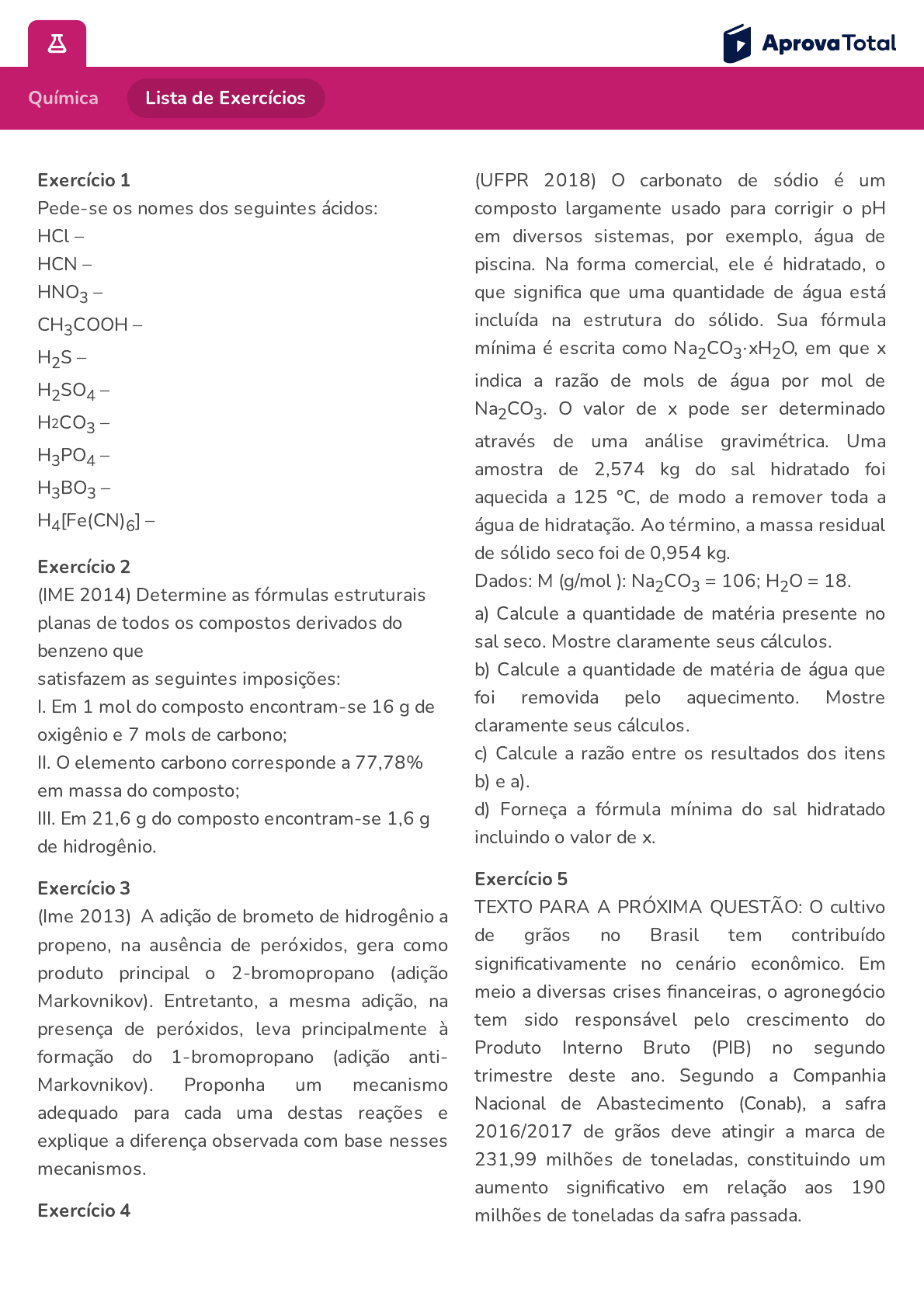 Química Lista de Exercícios