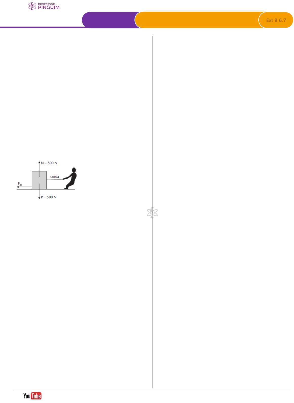 | 3 Extensivo de Física Ext B 6.7 Dinâmica Lista 1 Atrito Resoluções em vídeo ► professorpinguim.com.br /profpinguim 1. (Enem) Uma pessoa necessita da força de atrito em seus pés para se deslocar sobre uma superfície. Logo, uma pessoa que sobe uma rampa em linha reta será auxiliada pela força de atrito exercida pelo chão em seus pés. Em relação ao movimento dessa pessoa, quais são a direção e o sentido da força de atrito mencionada no texto? a) Perpendicular ao plano e no mesmo sentido do movimento. b) Paralelo ao plano e no sentido contrário ao movimento. c) Paralelo ao plano e no mesmo sentido do movimento. d) Horizontal e no mesmo sentido do movimento. e) Vertical e sentido para cima. 2. (UFViçosa-MG) Uma corda de massa desprezível pode suportar uma força tensora máxima de 200 N sem se romper. Um garoto puxa, por meio dessa corda esticada horizontalmente, uma caixa de 500 N de peso ao longo de um piso horizontal. Sabendo que o coeficiente de atrito cinético entre a caixa e o piso é 0,20 e, além disso, considerando a aceleração da gravidade igual a 10 m/𝑠𝑠2, determine: a) a intensidade da força de atrito cinético entre a caixa e o piso; b) a máxima aceleração que se pode imprimir à caixa. 3. (UFSM-RS) Um bloco com um peso de módulo 15 N encontra- se, em repouso, sobre uma superfície horizontal. Sendo 0,4 o coeficiente de atrito estático entre eles, o módulo da força de atrito, enquanto o bloco permanece em repouso, é: a) sempre igual ao módulo da força horizontal aplicada ao bloco, até o valor máximo de 6 N. b) 6 N, para qualquer módulo da força horizontal aplicada ao bloco. c) sempre menor que o módulo da força horizontal aplicada ao bloco, até o valor máximo de 6 N. d) sempre maior que o módulo da força horizontal aplicada ao bloco, com um valor máximo de 6 N. e) 15 N, para qualquer módulo da força horizontal aplicada ao bloco. 4. (Ufla) Um trator utiliza uma força motriz de 2000 N e arrasta, com velocidade constante, um tronco de massa 200 Kg ao longo de um terreno horizontal e irregular. Considerando g = 10 m/s2, é correto afirmar que o coeficiente de atrito cinético cμ entre o tronco e o terreno é: a) 1,0 b) 0,5 c) 0,25 d) zero 5. (UEG) Um guarda-roupa tem massa de 100 kg e está apoiado em um plano horizontal. O coeficiente de atrito estático entre o guarda-roupa e o chão vale 0,60. Adote g = 10 m/𝑠𝑠2. Uma pessoa vai empurrar o guarda-roupa com uma força horizontal de intensidade F. a) Qual a intensidade da força de atrito quando F = 400 N? b) Depois de iniciar o movimento, a pessoa passa a empurrar o guarda-roupa com F = 340 N e ele passa a se mover com velocidade constante. Qual o coeficiente de atrito dinâmico entre o guarda-roupa e o chão? https://professorpinguim.com.br https://youtube.com/profpinguim https://youtube.com/profpinguim https://professorpinguim.com.br https://youtube.com/profpinguim https://professorpinguim.com.br https://professorpinguim.com.br https://youtube.com/profpinguim https://professorpinguim.com.br https://youtube.com/profpinguim https://youtube.com/profpinguim | 3 Extensivo de Física Ext B 6.7 Dinâmica Lista 1 Atrito Resoluções em vídeo ► professorpinguim.com.br /profpinguim 6. (Unicamp) O sistema de freios ABS (do alemão “Antiblockier- Bremssystem”) impede o travamento das rodas do veículo, de forma que elas não deslizem no chão, o que leva a um menor desgaste do pneu. Não havendo deslizamento, a distância percorrida pelo veículo até a parada completa é reduzida, pois a força de atrito aplicada pelo chão nas rodas é estática, e seu valor máximo é sempre maior que a força de atrito cinético. O coeficiente de atrito estático entre os pneus e a pista é µe = 0,80 e o cinético vale µc = 0,60. Sendo g = 10 m/s2 e a massa do carro m = 1200 kg, o módulo da força de atrito estático máxima e a da força de atrito cinético são, respectivamente, iguais a a) 1200 N e 12000 N. b) 12000 N e 120 N. c) 20000 N e 15000 N. d) 9600 N e 7200 N. 7. A figura abaixo representa três blocos de massas 𝑀𝑀1 = 2 kg, 𝑀𝑀2 = 4 kg e 𝑀𝑀3 = 4 kg, respectivamente. Existe atrito somente entre o bloco 3 e o piso horizontal que os apóia, cujos coeficientes cinético e estático são, respectivamente, 0,2 e 0,3, e a aceleração da gravidade vale 10,0 m/𝑠𝑠2. Aplica-se ao bloco M1 uma força F = 40 N horizontal. a) O sistema acelera ou fica em repouso? b) Determine a intensidade da força que o bloco 2 aplica sobre o bloco 3. 8. (Unifor) Sobre um paralelepípedo de granito de massa m 900,0 kg,= apoiado sobre um terreno plano e horizontal, é aplicada uma força paralela ao plano de F 2.900,0 N.= Os coeficientes de atrito dinâmico e estático entre o bloco de granito e o terreno são 0,25 e 0,35, respectivamente. Considere a aceleração da gravidade local igual a 210,0 m / s . Estando inicialmente em repouso, a força de atrito que age no bloco é, em newtons: a) 2.250 b) 2.900 c) 3.150 d) 7.550 e) 9.000 9. (UFRJ-RJ) A figura mostra um bloco A, de 3 kg, apoiado sobre um bloco B de 4 kg. O bloco B, por sua vez, está apoiado sobre uma superfície horizontal muito lisa, de modo que o atrito entre eles é desprezível. O conjunto é acelerado para a direita por uma força horizontal �⃗�𝐹, de módulo igual a 14 N, aplicada no bloco B. a) Determine a direção e o sentido da força de atrito ( �⃗�𝐹at) exercida pelo bloco B sobre o bloco A e calcule seu módulo. b) Determine a direção e o sentido da reação �⃗�𝐹at, calcule seu módulo e indique em que corpo está aplicada. https://professorpinguim.com.br https://youtube.com/profpinguim https://youtube.com/profpinguim https://professorpinguim.com.br https://youtube.com/profpinguim https://professorpinguim.com.br https://professorpinguim.com.br https://youtube.com/profpinguim https://professorpinguim.com.br https://youtube.com/profpinguim https://youtube.com/profpinguim | 3 Ex