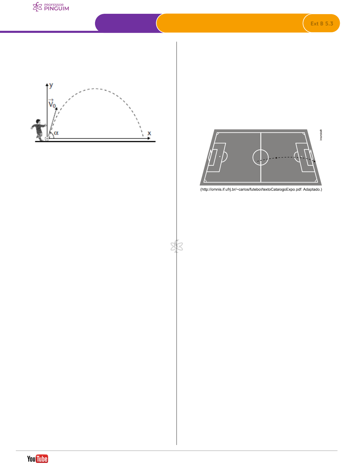 | 4 Extensivo de Física Ext B 5.3 Cinemática Lista 1 Lançamento oblíquo (Balística) Resoluções em vídeo ► professorpinguim.com.br /profpinguim 1. (PUC-SP-modificada) Suponha que em uma partida de futebol, o goleiro, ao bater o tiro de meta, chuta a bola, imprimindo-lhe uma velocidade 𝑉𝑉0���⃗ cujo vetor forma, com a horizontal, um ângulo α. Desprezando a resistência do ar, são feitas as afirmações abaixo: I- No ponto mais alto da trajetória, a velocidade vetorial da bola é nula. II- A velocidade inicial 𝑉𝑉0���⃗ pode ser decomposta segundo as direções horizontal e vertical. III- No ponto mais alto da trajetória é nulo o valor da aceleração da gravidade. IV- No ponto mais alto da trajetória é nulo o valor 𝑉𝑉𝑦𝑦���⃗ da componente vertical da velocidade. V- No ponto mais alto da trajetória é mínimo o módulo da velocidade vetorial. Estão corretas: a) II, III e V. b) I, III e IV. c) II, IV e V. d) III, IV e V. e) I, II. 2. Um projétil é lançado obliquamente segundo um ângulo de tiro θ com a horizontal (sen θ= 0,60; cos θ = 0,80) e velocidade inicial igual a 50 m/s. Adote g = 10 m/s2 e despreze a resistência do ar. Determine: a) o módulo da velocidade mínima do movimento; b) o tempo de vôo do projétil; c) a altura máxima (H) em relação ao nível de lançamento; d) o alcance horizontal (A). 3. (Unesp) O gol que Pelé não fez Na copa de 1970, na partida entre Brasil e Tchecoslováquia, Pelé pega a bola um pouco antes do meio de campo, vê o goleiro tcheco adiantado, e arrisca um chute que entrou para a história do futebol brasileiro. No início do lance, a bola parte do solo com velocidade de 108 km/h (30 m/s), e três segundos depois toca novamente o solo atrás da linha de fundo, depois de descrever uma parábola no ar e passar rente à trave, para alívio do assustado goleiro. Na figura vemos uma simulação do chute de Pelé. Considerando que o vetor velocidade inicial da bola após o chute de Pelé fazia um ângulo de 30° com a horizontal (sen30° = 0,50 e cos30° = 0,85) e desconsiderando a resistência do ar e a rotação da bola, pode-se afirmar que a distância horizontal entre o ponto de onde a bola partiu do solo depois do chute e o ponto onde ela tocou o solo atrás da linha de fundo era, em metros, um valor mais próximo de a) 52,0. b) 64,5. c) 76,5. d) 80,4. e) 86,6. https://professorpinguim.com.br https://youtube.com/profpinguim https://youtube.com/profpinguim https://professorpinguim.com.br https://youtube.com/profpinguim https://professorpinguim.com.br https://professorpinguim.com.br https://youtube.com/profpinguim https://professorpinguim.com.br https://youtube.com/profpinguim https://youtube.com/profpinguim | 4 Extensivo de Física Ext B 5.3 Cinemática Lista 1 Lançamento oblíquo (Balística) Resoluções em vídeo ► professorpinguim.com.br /profpinguim 4. A figura abaixo mostra a trajetória parcial de cinco projéteis lançados no vácuo com a mesma velocidade escalar inicial. As linhas pontilhadas representam a trajetória e as linhas cheias indicam a direção da velocidade inicial de tiro. a) Qual deles obteve maior alcance horizontal? b) Qual deles obteve a maior altura? c) Dois deles obtiveram o mesmo alcance horizontal. Quais são? 5. (UEL-PR) Um corpo é lançado para cima, com velocidade inicial de 50 m/s, numa direção que forma um ângulo de 60° com a horizontal. Desprezando a resistência do ar, pode-se afirmar que no ponto mais alto da trajetória a velocidade do corpo, em m/s, será: a) 5 b) 10 c) 25 d) 40 e) 50 6. (Uece-CE) Uma bola é lançada verticalmente para cima, com velocidade de 18 m/s, por um rapaz situado em carrinho que avança segundo uma reta horizontal, a 5,0 m/s. Depois de atravessar um pequeno túnel, o rapaz volta a recolher a bola, a qual acaba de descrever uma parábola, conforme a figura. Despreza-se a resistência do ar. A altura máxima h alcançada pela bola e o deslocamento horizontal x do carrinho valem, respectivamente: a) 16,2 m e 18,0 m. b) 16,2 m e 9,0 m. c) 8,1 m e 9,0 m. d) 10,0 m e 18,0 m. 7. (Fuvest-SP-modificada) Um gato, de um quilograma de massa, dá um pulo em trajetória parabólica, atingindo uma altura de 1,25 m e caindo a uma distância de 1,5 m do local do pulo. a) Calcule a componente vertical de sua velocidade inicial. b) Calcule a velocidade horizontal do gato. https://professorpinguim.com.br https://youtube.com/profpinguim https://youtube.com/profpinguim https://professorpinguim.com.br https://youtube.com/profpinguim https://professorpinguim.com.br https://professorpinguim.com.br https://youtube.com/profpinguim https://professorpinguim.com.br https://youtube.com/profpinguim https://youtube.com/profpinguim | 4 Extensivo de Física Ext B 5.3 Cinemática Lista 1 Lançamento oblíquo (Balística) Resoluções em vídeo ► professorpinguim.com.br /profpinguim 8. (F. M. Itajubá-MG) Uma bola está parada sobre o gramado de um campo horizontal, na posição A. Um jogador chuta a bola para cima, imprimindo velocidade de módulo 𝑉𝑉0���⃗ de módulo 8,0 m/s fazendo com a horizontal um ângulo de 60º, como mostra a figura. A bola sobe e desce, atingindo o solo novamente, na posição B. Desprezando-se a resistência do ar, qual será a distância entre as posições A e B? 9. (Pucrj) Um projétil é lançado com uma velocidade escalar inicial de 20 m/s com uma inclinação de 30° com a horizontal, estando inicialmente a uma altura de 5,0 m em relação ao solo. Considere a aceleração da gravidade g = 10 m/s2 A altura máxima que o projétil atinge, em relação ao solo, medida em metros, é: a) 5,0 b) 10 c) 15 d) 20 e) 25 10. (Esc. Naval) Conforme mostra a figura abaixo, em um jogo de futebol, no instante em que o jogador situado no ponto A faz um lançamento, o jogador situado no ponto B, que inicialmente estava parado, começa a correr com aceleração constante igual a 23,00 m s , deslocando-se até o ponto