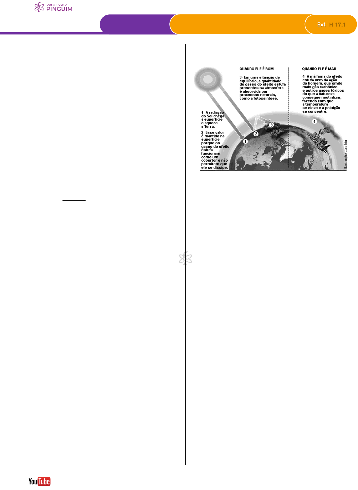 | 3 Extensivo de Física Ext H 17.1 TERMOLOGIA Lista 2 Termometria Resoluções em vídeo ► professorpinguim.com.br /profpinguim 1. (Ufsc) Calor é energia em trânsito, devido a uma diferença de temperatura. No momento em que não existe mais esta diferença de temperatura, o calor deixa de existir. O calor não pode ser armazenado ou contido por um corpo. Em uma situação na qual existe uma diferença de temperatura, o calor surge e, dependendo do meio em que isto ocorre, o calor vai apresentar formas distintas de se propagar. Em relação às formas de propagação do calor, assinale a(s) proposição(ões) CORRETA(S). 01) Na ausência de matéria, o calor se propaga por radiação, ondas eletromagnéticas em que a frequência do calor está na faixa do ultravioleta. 02) O calor também pode se propagar na faixa da radiação de micro-ondas, a mesma usada nos fornos de micro-ondas para aquecer e cozinhar alimentos. 04) O fluxo de calor através de um sólido depende da sua geometria e do material do qual é com posto. 08) O calor se propaga por três processos: na condução a energia é transferida pela interação dos átomos ou moléculas; na convecção a energia é transferida pelo transporte direto de matéria e na radiação a energia é transferida por meio de ondas eletromagnéticas. 16) A garrafa térmica, ou frasco de Dewar, pode ser considerada um recipiente de paredes adiabáticas, pois seu objetivo é evitar qualquer tipo de propagação de calor. 32) O processo de aquecimento de um fluido se dá por convecção, por isso a fonte de calor deve estar preferencialmente localizada na região superior desse fluido. 2. (Ufg) Umidade é o conteúdo de água presente em uma substância. No caso do ar, a água na forma de vapor pode formar um gás homogêneo e incolor se sua concentração no ar estiver abaixo do limite de absorção de vapor de água pelo ar. Este limite é chamado de ponto de orvalho e caracteriza a saturação a partir da qual ocorre a precipitação de neblina ou gotículas de água. O ponto de saturação de vapor de água no ar aumenta com a temperatura. Um fato interessante ligado à umidade do ar é que, em um dia muito quente, o ser humano sente-se termicamente mais confortável em um ambiente de baixa umidade. Esse fato se deve ao calor a) recebido pelo corpo por irradiação. b) cedido para a água por convecção. c) recebido do vapor por condução. d) cedido para o vapor por convecção. e) cedido pelo corpo por condução. 3. (G1 - cftsc) O que é e quais as consequências boas e más do efeito estufa? O efeito estufa é um fenômeno causado por gases (principalmente gás carbônico, clorofluorcarboneto, metano e óxido nitroso) que estão presentes na atmosfera desde a formação da Terra, há cerca de 4 bilhões de anos. São eles os responsáveis por absorver a radiação infravermelha vinda da Terra e permitir que a temperatura na superfície fique na média de 15 °C (veja o infográfico acima). Sem esses gases, a vida só seria viável para micróbios em regiões aquecidas por fontes geotermais. Publicada na Revista Nova Escola, edição 224, agosto de 2009. (adaptado) Considerando a Figura 1 como referência, analise as proposições abaixo: I – O calor vindo do Sol chega à Terra pelo processo de condução. II – O calor que é emitido pela Terra propaga-se pela atmosfera pelos processos de convecção e radiação. III – A radiação infravermelha é mais energética que a radiação visível. Considerando as proposições apresentadas, assinale a alternativa correta. a) Apenas as proposições I e II são verdadeiras. b) Apenas a proposição I é verdadeira. c) Apenas a proposição III é verdadeira. d) Apenas as proposições II e III são verdadeiras. e) Apenas a proposição II é verdadeira. https://professorpinguim.com.br https://youtube.com/profpinguim https://youtube.com/profpinguim https://professorpinguim.com.br https://youtube.com/profpinguim https://professorpinguim.com.br https://professorpinguim.com.br https://youtube.com/profpinguim https://professorpinguim.com.br https://youtube.com/profpinguim https://youtube.com/profpinguim | 3 Extensivo de Física Ext H 17.1 TERMOLOGIA Lista 2 Termometria Resoluções em vídeo ► professorpinguim.com.br /profpinguim 4. (G1 - cftsc) Em nossas casas, geralmente são usados piso de madeira ou de borracha em quartos e piso cerâmico na cozinha. Por que sentimos o piso cerâmico mais gelado? a) Porque o piso de cerâmica está mais quente do que o piso de madeira, por isso a sensação de mais frio no piso cerâmico. b) Porque o piso de cerâmica está mais gelado do que o piso de madeira, por isso a sensação de mais frio no piso cerâmico. c) Porque o piso de cerâmica no quarto dá um tom menos elegante. d) Porque o piso de madeira troca menos calor com os nossos pés, causando-nos menos sensação de frio. e) Porque o piso de cerâmica tem mais área de contato com o pé, por isso nos troca mais calor, causando sensação de frio. 5. (Ufsm) O inverno é caracterizado pela ocorrência de baixas temperaturas, especialmente nas regiões ao sul do Brasil. Por essa razão, é alto o índice de incidência de doenças respiratórias, de modo que a primeira recomendação é manter-se abrigado sempre que possível e agasalhar-se adequadamente. Considerando os aspectos termodinâmicos dos fenômenos envolvidos, analise as afirmações: I. Os aquecedores devem ser mantidos próximos ao piso do ambiente, porque a condutividade térmica do ar é maior quando próxima à superfície da Terra. II. Energia é transferida continuamente entre o corpo e as suas vizinhanças por meio de ondas eletromagnéticas. III. O ato de encolher-se permite às pessoas diminuir sua área exposta ao ambiente e, consequentemente, diminuir a perda de energia. Está(ão) correta(s) a) apenas I. b) apenas II. c) apenas I e III. d) apenas II e III. e) I, II e III. 6. (Unifor) Para diminuir os efeitos da perda