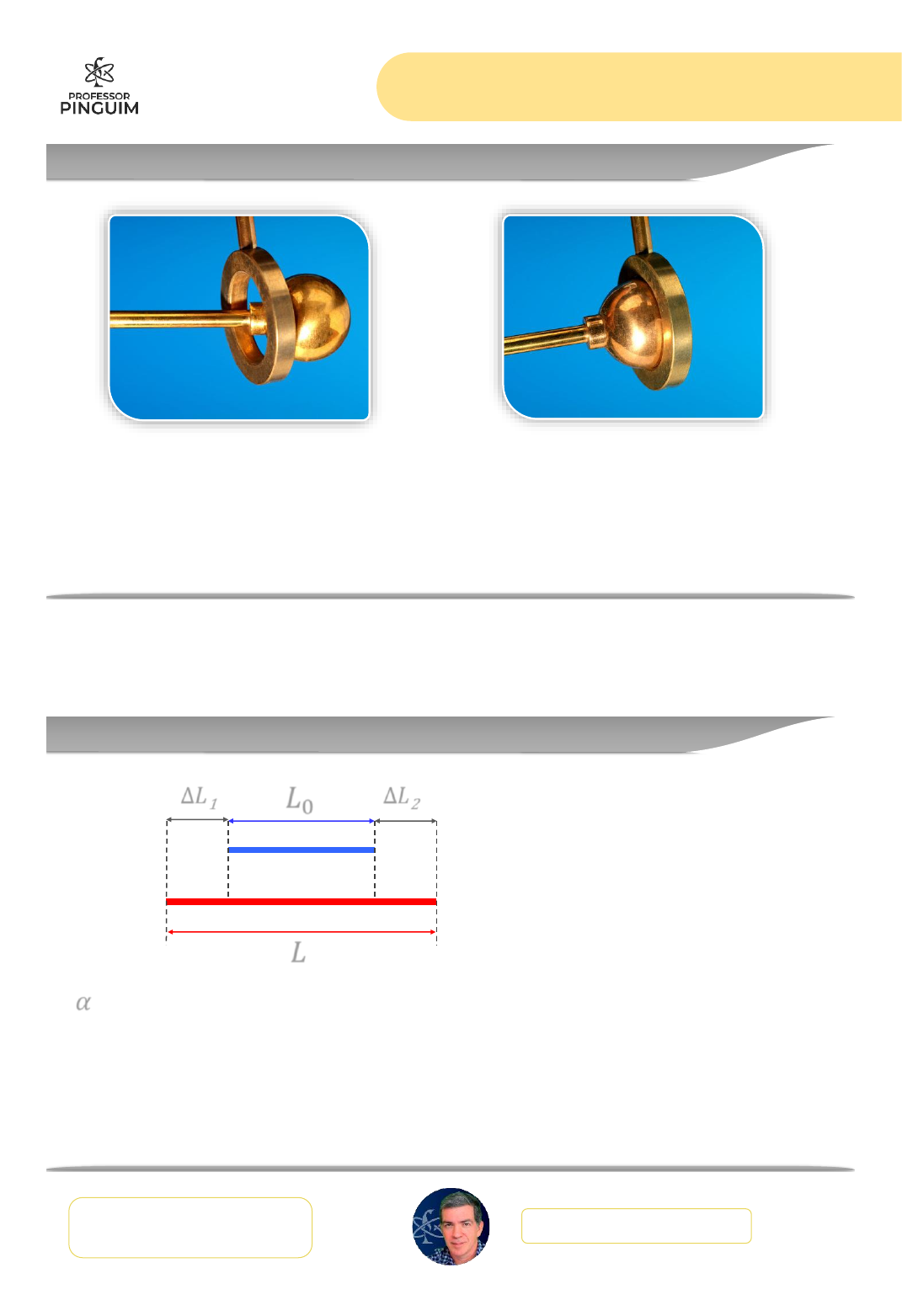 Termologia Ext H 17.3 – Dilatação Térmica dos Sólidos 1professorpinguim.com.brComplete com o VÍDEO da Plataforma Dilatação térmica Maior temperatura Maior agitação térmica Frio Quente Dilatação Térmica Linear 𝛼 : Coeficiente de dilatação linear Frio Quente Variação no comprimento 𝐿 𝐿0∆𝐿1 ∆𝐿2 1 2 Termologia Ext H 17.3 – Dilatação Térmica dos Sólidos 2professorpinguim.com.brComplete com o VÍDEO da Plataforma Exercício: Dilatação Linear Uma barra metálica de um material experimental, à temperatura TA, tem comprimento LA. Quando essa barra é aquecida à temperatura TB, sendo TB > TA, tem comprimento LB = 1,331 LA. Sabe-se que a cada aumento de temperatura de 20K, a barra aumenta seu comprimento em 10%. Então, é CORRETO afirmar que a diferença de temperatura TB – TA é a) 55K b) 50K c) 60K d) 66K Exercício (Fuvest 2014) Uma lâmina bimetálica de bronze e ferro, na temperatura ambiente, é fixada por uma de suas extremidades, como visto na figura abaixo. Nessa situação, a lâmina está plana e horizontal. A seguir, ela é aquecida por uma chama de gás. Após algum tempo de aquecimento, a forma assumida pela lâmina será mais adequadamente representada pela figura: 3 5 Termologia Ext H 17.3 – Dilatação Térmica dos Sólidos 3professorpinguim.com.brComplete com o VÍDEO da Plataforma Dilatação Superficial 𝛽 : Coeficiente de dilatação superficial 𝐴0 Frio 𝐴 Quente Exercício: Dilatação de orifícios (PUC – PR) O coeficiente de dilatação térmica do alumínio é, aproximadamente, o dobro do coeficiente de dilatação térmica do aço. A figura mostra duas peças onde um anel feito de um desses metais envolve um disco feito do outro metal. À temperatura do ambiente, os discos são presos aos anéis. S e as duas peças forem aquecidas uniformemente, é correto afirmar: a) apenas o disco de aço se soltará do anel de alumínio. b) apenas o disco de alumínio se soltará do anel de aço. c) os discos se soltarão dos respectivos anéis. d) os discos permanecerão presos sem soltar por maior que seja o aumento de temperatura. e) os metais entrarão em fusão antes de se soltarem. 6 7 Termologia Ext H 17.3 – Dilatação Térmica dos Sólidos 4professorpinguim.com.brComplete com o VÍDEO da Plataforma Exercício: Dilatação Superficial Um disco de chumbo se encontra a 10 °C quando passa a ser aquecido por uma fonte térmica. Após atingir a temperatura de 20 °C, sua área aumentou em: Dado: coeficiente de dilatação linear do chumbo = 3.10-5 °C-1. a) 0,06 % b) 0,03 % c) 0,003 % d) 0,0006 % e) 0,0003 % Dilatação volumétrica 𝛾 : Coeficiente de dilatação volumétrica 𝑉0 Frio 𝑉 Quente Variação no volume 8 9 Termologia Ext H 17.3 – Dilatação Térmica dos Sólidos 5professorpinguim.com.brComplete com o VÍDEO da Plataforma Exercício: Dilatação Volumétrica (Ufrgs) Duas esferas maciças e homogêneas, X e Y, de mesmo volume e materiais diferentes, estão ambas na mesma temperatura T. Quando ambas são sujeitas a uma mesma variação de temperatura t, os volumes de X e Y aumentam de 1% e 5%, respectivamente. A razão entre os coeficientes de dilatação linear dos materiais de X e Y, é a) 1. b) 1/2. c) 1/4. d) 1/5. e) 1/10. 10