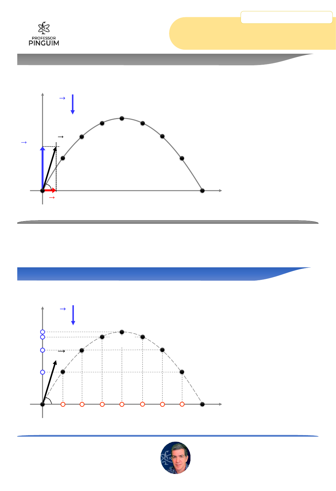 1 Cinemática Ext B 5.3 – Lançamento Oblíquo professorpinguim.com.br Complete com o vídeo da teoria Lançamento oblíquo - Projeções g y x M.U.V. na vertical M.U. na horizontal 𝒗𝟎𝒚 𝒗𝟎𝒙 𝒗𝟎 q Lançamento oblíquo - Características M.U.V. na vertical g y x M.U. na horizontal 𝒗𝟎 q Ԧ𝑣 = Ԧ𝑣𝑥 = Ԧ𝑣𝑚í𝑛 𝒗𝒚 = 0 1 2 2 Cinemática Ext B 5.3 – Lançamento Oblíquo professorpinguim.com.br Complete com o vídeo da teoria Lançamento oblíquo- Equações 𝒗𝒚 𝒗𝒂𝒓𝒊𝒂 𝒔𝒚 = 𝒔𝟎𝒚 + 𝒗𝟎𝒚. 𝒕 − 𝒈 𝟐 . 𝒕𝟐 𝒗𝒚 = 𝒗𝟎𝒚 − 𝒈. 𝒕 𝒗𝒚 𝟐 = 𝒗𝒐𝒚 𝟐 − 𝟐.𝒈. ∆𝒔𝒚 𝒂𝒚 = −𝑔 Movimento uniformemente variado na vertical g y x 𝒗𝟎 q M.U.V. na vertical Lançamento oblíquo ∆𝒔𝒙 = 𝒗𝒙. 𝒕 𝒗𝒙 = 𝒗𝟎𝒙 Movimento uniforme na horizontal g y x M.U. na horizontal 𝒗𝟎 q 3 4 3 Cinemática Ext B 5.3 – Lançamento Oblíquo professorpinguim.com.br Complete com o vídeo da teoria Propriedades g y x 𝒗𝟎 q Exercício No lançamento de um projétil do solo, a velocidade inicial (v0 = 100 m/s) forma com a horizontal um ângulo q tal que senq = 0,80; cos q = 0,60. Despreze a resistência do ar. Determine a) o tempo de subida do projétil; b) a altura máxima atingida e o alcance horizontal; c) o módulo da velocidade mínima do movimento 5 6 4 Cinemática Ext B 5.3 – Lançamento Oblíquo professorpinguim.com.br Complete com o vídeo da teoria (Puccamp-SP) Um projétil é lançado segundo um ângulo de 30° com a horizontal, com uma velocidade de 200 m/s. Supondo a aceleração da gravidade igual a 10 m/𝑠2e desprezando a resistência do ar, o intervalo de tempo entre as passagens do projétil pelos pontos de altura 480 m acima do ponto de lançamento, em segundos, é: a) 2,0 b) 4,0 c) 6,0 d) 8.0 e) 12 7