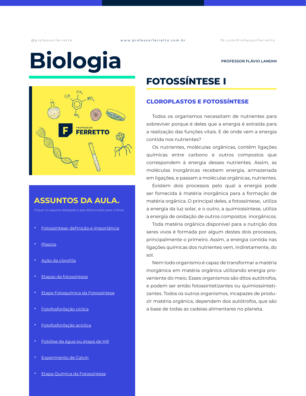 Biologia @ p r o f e s s o r f e r r e t t o w w w . p r o f e s s o r f e r r e t t o . c o m . b r f b . c o m / P r o f e s s o r F e r r e t t o PROFESSOR FLÁVIO LANDIM ASSUNTOS DA AULA. • Fotossíntese: definição e importância • Plastos • Ação da clorofila • Etapas da fotossíntese • Etapa Fotoquímica da Fotossíntese • Fotofosforilação cíclica • Fotofosforilação acíclica • Fotólise da água ou etapa de Hill • Experimento de Calvin • Etapa Química da Fotossíntese FOTOSSÍNTESE I CLOROPLASTOS E FOTOSSÍNTESE Todos os organismos necessitam de nutrientes para sobreviver porque é deles que a energia é extraída para a realização das funções vitais. E de onde vem a energia contida nos nutrientes? Os nutrientes, moléculas orgânicas, contêm ligações químicas entre carbono e outros compostos que correspondem à energia desses nutrientes. Assim, as moléculas inorgânicas recebem energia, armazenada em ligações, e passam a moléculas orgânicas, nutrientes. Existem dois processos pelo qual a energia pode ser fornecida à matéria inorgânica para a formação de matéria orgânica. O principal deles, a fotossíntese, utiliza a energia da luz solar, e o outro, a quimiossíntese, utiliza a energia de oxidação de outros compostos inorgânicos. Toda matéria orgânica disponível para a nutrição dos seres vivos é formada por algum destes dois processos, principalmente o primeiro. Assim, a energia contida nas ligações químicas dos nutrientes vem, indiretamente, do sol. Nem todo organismo é capaz de transformar a matéria inorgânica em matéria orgânica utilizando energia pro- veniente do meio. Esses organismos são ditos autótrofos, e podem ser então fotossintetizantes ou quimiossinteti- zantes. Todos os outros organismos, incapazes de produ- zir matéria orgânica, dependem dos autótrofos, que são a base de todas as cadeias alimentares no planeta. Clique no assunto desejado e seja direcionado para o tema. Tome nota: 2 BIOLOGIA w w w.professor ferretto.com.br FOTOSSÍNTESE: DEFINIÇÃO E IMPORTÂNCIA A fotossíntese é o processo anabólico que utiliza a energia da luz para a produção de matéria orgânica, na forma de carboidratos, principalmente, a partir de matéria inorgânica, na forma de água e gás carbônico. - produzir a matéria orgânica que é a base da nutrição da imensa maioria dos ecossistemas da biosfera; - liberar gás oxigênio, utilizado por todos os organismo aeróbicos no planeta (inclusive, acredita se que o oxigênio só passou a existir na atmosfera a partir do surgimento da fotossíntese). Combustíveis fósseis são restos orgânicos de seres pré-históricos, submetidos a transformações químicas por milhões de anos e altíssimas pressões. Pode-se argumentar também que a fotossíntese é um processo de redução do gás carbônico. É também um processo de conversão de energia luminosa em energia química nas ligações entre os átomos das moléculas orgânicas. Os organismo capazes de realizar tal processo, os autótrofos fotossintetizantes, correspondem aos vege- tais, algas e cianobactérias (algas azuis, antigamente chamadas cianofíceas), além de algumas bactérias. A importância da fotossíntese consiste em: Estas duas funções são realizadas na natureza quase que só pela fotossíntese, uma vez que a quimiossín- tese contribui de modo irrisório. Relação entre fotossíntese e combustíveis fósseis Mesmo moléculas orgânicas como as do petróleo têm uma origem indireta na fotossíntese. Petróleo, assim como carvão mineral e gás natural, são combustíveis fósseis. Isso quer dizer que as moléculas orgânicas dos combustíveis fósseis são derivadas das moléculas orgâni- cas de animais e plantas, que foram produzidas pela fotossíntese. Assim, a energia dos combustíveis fósseis é uma energia química proveniente da luz, que foi assim transformada pela ação de seres fotossintetizantes. Tome nota: 3 w w w.professor ferretto.com.br PROFESSOR L ANDIM PLASTOS Quando um plasto se auto-duplica, origina um pró-plasto ou proplastídeo. Este pode originar leuco- plastos ou cromoplastos. Os leucoplastos (do grego leukós, ‘branco’) não possuem pigmentos fotossinteti- zantes e têm função de armazenamento. Os cromoplastos (do grego kromos, ‘cor’) possuem pigmentos fotossintetizantes e realizam a fotossíntese. Se os proplastídeos estiverem num ambiente sem contato com a luz, originarão leucoplastos. Se estiver- em num iluminado, acumularão pigmentos fotossintetizantes e originarão cromoplastos. Um leucoplasto colocado no claro adquirirá pigmentos fotossintetizantes e passará a cromoplasto. Da mesma maneira, um cromoplasto colocado no escuro perderá seus pigmentos fotossintetizantes e passará a leucoplasto. Presentes apenas em células vegetais e de al- gas eucarióticas, os plastos são organelas normal- mente ovaladas, relacionadas ao armazenamento de substâncias ou à fotossíntese. Como a mitocôndria, o plasto é formado por duas membranas, uma externa e outra interna, com um espaço intermembrana entre elas. A membrana interna sofre invaginações denomina- das lamelas. Estas lamelas sofrem dobramentos que originam sacos achatados denominados ti- lacóides, semelhantes a moedas. Estes tilacóides se empilham e originam conjuntos chamados gra- na (singular: granum). Nos plastos relacionados à fotossíntese, a membrana interna contém em sua organização, além dos fosfolipídios, clorofila, principal pig- mento fotossintetizante. A clorofila é um lipídio carotenoide, tendo uma estrutura anfipática: uma longa cauda apolar e uma cabeça polar com um átomo de magnésio. Esta característica anfipática explica a localização da clorofila no cloroplasto: ela é um componente da bicamada lipídica, se locali- zando junto aos fosfolipídios. Como lamelas e tila- coides se formam a partir da membrana interna, eles também possuem em sua estrutura a cloro