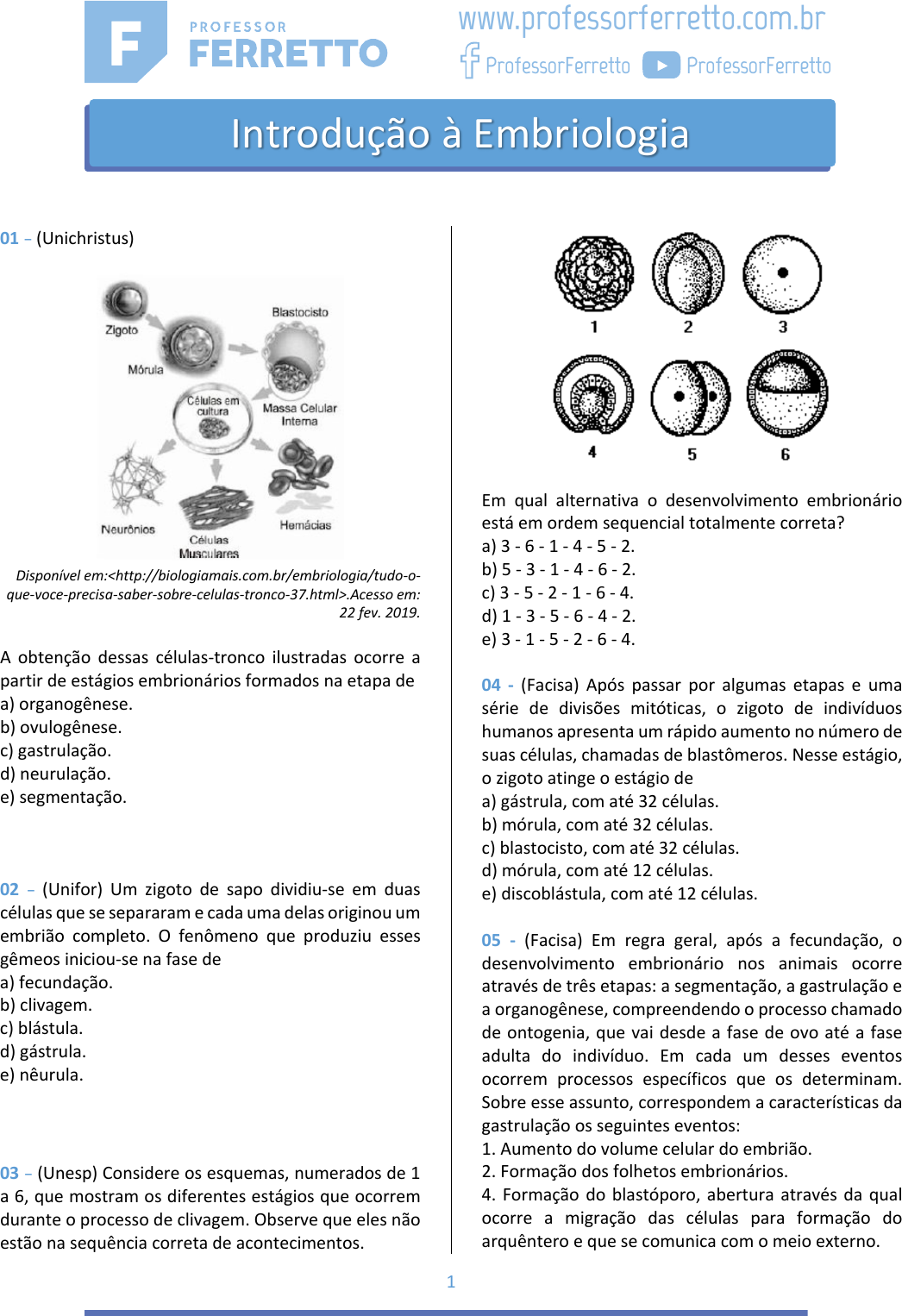 1 01 – (Unichristus) Disponível em:<http://biologiamais.com.br/embriologia/tudo-o- que-voce-precisa-saber-sobre-celulas-tronco-37.html>.Acesso em: 22 fev. 2019. A obtenção dessas células-tronco ilustradas ocorre a partir de estágios embrionários formados na etapa de a) organogênese. b) ovulogênese. c) gastrulação. d) neurulação. e) segmentação. 02 – (Unifor) Um zigoto de sapo dividiu-se em duas células que se separaram e cada uma delas originou um embrião completo. O fenômeno que produziu esses gêmeos iniciou-se na fase de a) fecundação. b) clivagem. c) blástula. d) gástrula. e) nêurula. 03 – (Unesp) Considere os esquemas, numerados de 1 a 6, que mostram os diferentes estágios que ocorrem durante o processo de clivagem. Observe que eles não estão na sequência correta de acontecimentos. Em qual alternativa o desenvolvimento embrionário está em ordem sequencial totalmente correta? a) 3 - 6 - 1 - 4 - 5 - 2. b) 5 - 3 - 1 - 4 - 6 - 2. c) 3 - 5 - 2 - 1 - 6 - 4. d) 1 - 3 - 5 - 6 - 4 - 2. e) 3 - 1 - 5 - 2 - 6 - 4. 04 - (Facisa) Após passar por algumas etapas e uma série de divisões mitóticas, o zigoto de indivíduos humanos apresenta um rápido aumento no número de suas células, chamadas de blastômeros. Nesse estágio, o zigoto atinge o estágio de a) gástrula, com até 32 células. b) mórula, com até 32 células. c) blastocisto, com até 32 células. d) mórula, com até 12 células. e) discoblástula, com até 12 células. 05 - (Facisa) Em regra geral, após a fecundação, o desenvolvimento embrionário nos animais ocorre através de três etapas: a segmentação, a gastrulação e a organogênese, compreendendo o processo chamado de ontogenia, que vai desde a fase de ovo até a fase adulta do indivíduo. Em cada um desses eventos ocorrem processos específicos que os determinam. Sobre esse assunto, correspondem a características da gastrulação os seguintes eventos: 1. Aumento do volume celular do embrião. 2. Formação dos folhetos embrionários. 4. Formação do blastóporo, abertura através da qual ocorre a migração das células para formação do arquêntero e que se comunica com o meio externo. www.professorferretto.com.br ProfessorFerretto ProfessorFerretto Introdução à Embriologia 2 8. Formação do arquêntero, que surge com a migração de células para o interior da blastocele. 32. Desenvolvimento da nêurula. O somatório das afirmativas corretas é a) 40. b) 34. c) 13. d) 15. e) 36. 06 - (Fcm-jp) Pesquisas sobre a teratogênese do álcool demonstrou que o cérebro é o órgão do corpo mais vulnerável aos efeitos da exposição pré–natal ao álcool, dependendo do tipo de célula cerebral e o estágio de desenvolvimento do embrião ou feto, podendo provocar morte celular, interferir com a produção de neurotransmissores e causar a formação anormal de sinapses nervosas. O desenvolvimento embrionário tem inicio com a primeira divisão mitótica do zigoto e pode ser dividido em três etapas: segmentação, gastrulação e organogênese, representando períodos de maior vulnerabilidade para agentes teratogênicos. Sobre estas etapas coloque V para as alternativas verdadeiras e F para as falsas, e em seguida marque a alternativa correta. I. A fase de segmentação ou clivagem é o período que vai desde a primeira divisão do óvulo até a formação da blástula. II. Na gastrulação as células embrionárias continuam a se multiplicar e se organizam formando a gástrula. III. A organogênese é a fase em que, a partir dos três folhetos germinativos, diferenciam-se os diversos tecidos e órgãos que existirão no organismo adulto. IV. A gástrula é caracterizada pela presença de um primeiro esboço do tubo digestório e pela diferenciação dos três folhetos embrionários. V. Na organogênese ocorre a diferenciação dos três folhetos embrionários: ectoderma, mesoderma e endoderma. a) FVVFV. b) FVVVF. c) VFFVV. d) FFFVF. e) VFVFV. 07 - (Fps) A gastrulação é uma fase do desenvolvimento embrionário marcada pela formação: a) da boca e do ânus. b) da nêurula. c) dos órgãos. d) da notocorda. e) da endoderma. 08 - (Fip) A última fase do desenvolvimento embrionário, onde ocorre a diferenciação dos tecidos e órgãos, denomina-se: a) Gastrulação. b) Neurulação. c) Organogênese. d) Clivagem. e) Segmentação. 09 - (Uel) Disponível em: <http://xicosa.blogfolha.uol.com.br/files/2014/02/AngeliIdeologia .gif>. Acesso em: 20 abr. 2016. Na charge, existe a dúvida do que é esquerda e do que é direita, porém um dos mais importantes fenômenos do processo embrionário dos animais é o desenvolvimento dos três eixos corporais, entre os quais o eixo direito-esquerdo. Com raras exceções, todo embrião animal desenvolve esses eixos embrionários, que definem a estrutura corporal do futuro organismo. Assinale a alternativa que apresenta, corretamente, em que momento, nos seres humanos, o eixo direito-esquerdo é definido durante o desenvolvimento embrionário. a) Durante a fase de clivagem. b) Durante a formação da blástula. c) Na gastrulação. d) Na histogênese. e) No estágio de mórula. 10 - (Unipê) O fator que proporciona a diferenciação entre ovos oligolécitos e telolécito irá influenciar a) na presença ou não do celoma. b) na presença ou não da notocorda. c) no modo de formação do tubo neural. d) no tipo de segmentação que o ovo irá sofrer. e) no número de folhetos embrionários formados, durante a embriogênese. 3 11 - (Unifor) Os esquemas abaixo representam embriões nas fases de 4 e 8 células. Sabendo-se que os zigotos que originaram esses embriões têm a mesma quantidade de vitelo, conclui- se que em I o vitelo a) distribui-se uniformemente e em II há mais vitelo no polo animal. b) distribui-se uniformemente e em II há mais vitelo no polo vegetativo. c) concentra-se mais no polo vegetativo e em II distribui-se uniformemente. d) concentra-se mais no polo animal e em II distribui- 