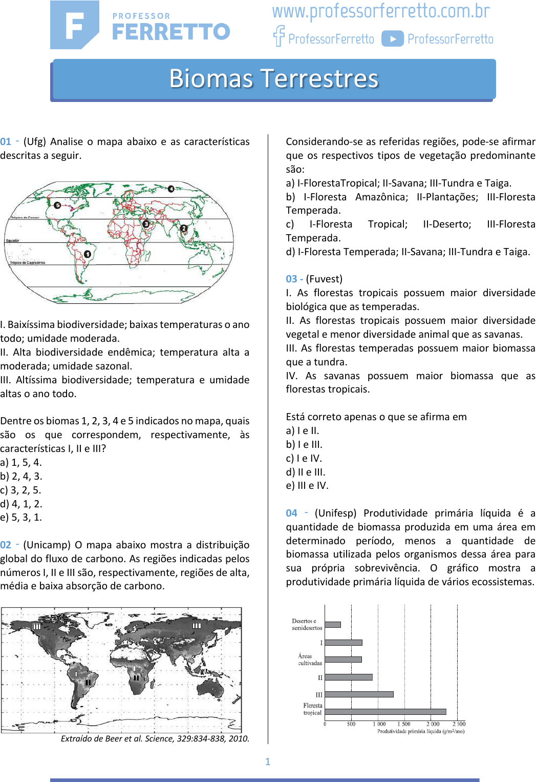 1 01 - (Ufg) Analise o mapa abaixo e as características descritas a seguir. I. Baixíssima biodiversidade; baixas temperaturas o ano todo; umidade moderada. II. Alta biodiversidade endêmica; temperatura alta a moderada; umidade sazonal. III. Altíssima biodiversidade; temperatura e umidade altas o ano todo. Dentre os biomas 1, 2, 3, 4 e 5 indicados no mapa, quais são os que correspondem, respectivamente, às características I, II e III? a) 1, 5, 4. b) 2, 4, 3. c) 3, 2, 5. d) 4, 1, 2. e) 5, 3, 1. 02 - (Unicamp) O mapa abaixo mostra a distribuição global do fluxo de carbono. As regiões indicadas pelos números I, II e III são, respectivamente, regiões de alta, média e baixa absorção de carbono. Extraído de Beer et al. Science, 329:834-838, 2010. Considerando-se as referidas regiões, pode-se afirmar que os respectivos tipos de vegetação predominante são: a) I-FlorestaTropical; II-Savana; III-Tundra e Taiga. b) I-Floresta Amazônica; II-Plantações; III-Floresta Temperada. c) I-Floresta Tropical; II-Deserto; III-Floresta Temperada. d) I-Floresta Temperada; II-Savana; III-Tundra e Taiga. 03 - (Fuvest) I. As florestas tropicais possuem maior diversidade biológica que as temperadas. II. As florestas tropicais possuem maior diversidade vegetal e menor diversidade animal que as savanas. III. As florestas temperadas possuem maior biomassa que a tundra. IV. As savanas possuem maior biomassa que as florestas tropicais. Está correto apenas o que se afirma em a) I e II. b) I e III. c) I e IV. d) II e III. e) III e IV. 04 - (Unifesp) Produtividade primária líquida é a quantidade de biomassa produzida em uma área em determinado período, menos a quantidade de biomassa utilizada pelos organismos dessa área para sua própria sobrevivência. O gráfico mostra a produtividade primária líquida de vários ecossistemas. www.professorferretto.com.br ProfessorFerretto ProfessorFerretto Biomas Terrestres 2 Nesse gráfico, I, II e III correspondem, respectivamente, a: I II III a) Campos Savanas Florestas decíduas temperadas b) Campos Florestas decíduas temperadas Savanas c) Savanas Campos Florestas decíduas temperadas d) Florestas decíduas temperadas Savanas Campos e) Florestas decíduas temperadas Campos Savanas 05 - (Uncisal) Os gráficos indicam a produtividade primária em diversos ecossistemas do planeta. A análise dos gráficos indica que a) os ambientes tropicais possuem produtividade primária mais equilibrada, pois existe um equilíbrio entre a população de vegetais (produtores) e animais (consumidores). b) a floresta temperada possui os maiores índices de produtividade primária, pois apresentam as maiores árvores do planeta, como as grandes sequoias. c) a região ártica possui maior produtividade primária nos meses de junho a setembro, pois, no inverno, as algas e os vegetais acumulam reserva energética. d) a produtividade primária dos ecossistemas está diretamente relacionada com a quantidade de luz solar e a produção de biomassa pelos produtores. e) a floresta temperada tem maior produtividade primária que a floresta tropical, pois os invernos são mais longos e a biomassa maior. 06 - (Enem) O deserto é um bioma que se localiza em regiões de pouca umidade. A fauna é, predominantemente, composta por animais roedores, aves, répteis e artrópodes. Uma adaptação, associada a esse bioma, presente nos seres vivos dos grupos citados é o (a) a) existência de numerosas glândulas sudoríparas na epiderme. b) eliminação de excretas nitrogenadas de forma concentrada. c) desenvolvimento do embrião no interior de ovo com casca. d) capacidade de controlar a temperatura corporal. e) respiração realizada por pulmões foliáceos. 07 - (Unesp) Observe a figura. O bioma apresentado é conhecido como a) mata atlântica. b) tundra. c) taiga. d) cerrado. e) floresta decídua temperada. 08 - (Uece) Com relação aos ecossistemas terrestres, correlacione as colunas abaixo: (_) Presente em regiões de clima seco com baixa pluviosidade, altas temperaturas de dia e baixas temperaturas de noite. As plantas e animais são adaptados a este tipo de ambiente (_) Apresenta pouca energia e pouca chuva. Tem uma vegetação composta pôr pequenos arbustos e plantas rasteiras, havendo a predominância de musgos e liquens (_) Floresta de Coníferas – situada em regiões de inverno rigoroso e prolongado. Tem fauna pouco diversificada (_) Dispõe de grande quantidade de energia, muita chuva, grande diversidade biológica e solo pobre, pouco iluminado e coberto de folhas I. Tundra II. Taiga III. Floresta Tropical IV. Deserto 3 A sequência correta, de cima para baixo, é: a) I, II, III, IV. b) IV, III, II, I. c) IV, I, II, III. d) IV, I, III, II. 09 - (Uece) Existem diversos tipos de formações florestais, porém as florestas tropicais úmidas se destacam, por serem consideradas os ecossistemas de maior produtividade primária líquida. Com relação às florestas tropicais úmidas, é correto dizer que a) possuem solo rico em nutrientes, o que garante a exuberância das formações vegetais. b) são representadas exclusivamente pela Amazônia; são privilégio da América do Sul. c) sua elevada produtividade está diretamente relacionada ao clima quente e úmido e à grande quantidade de luz solar disponível. d) as raízes das árvores são sempre muito profundas e, por isso, dificilmente são derrubadas, o que reduz os desmatamentos. 10 - (Enem) Apesar da riqueza das florestas tropicais, elas estão geralmente baseadas em solos inférteis e improdutivos. Grande parte dos nutrientes é armazenada nas folhas que caem sobre o solo, não no solo propriamente dito. Quando esse ambiente é intensamente modificado pelo ser humano, a vegetação desaparece, o ciclo dos nutrientes é alterado e a terra se torna rapidamente infértil. CORSON, Walter H. Manual Global de Ecologia, 1993 No texto anterior, pode parecer uma contradição a existência de florestas tropicais exuberantes sobre so