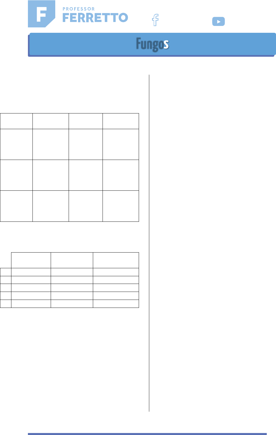 1 01 - (Fuvest) O quadro abaixo lista características que diferenciam os reinos dos fungos, das plantas e dos animais, quanto ao tipo e ao número de células e quanto à forma de nutrição de seus integrantes. Caracterís tica I II III Tipo de célula Exclusivam ente procariótic os Maioria eucariótic os Exclusivam ente eucariótico s Número de células Exclusivam ente unicelulare s Unicelular es ou pluricelula res Exclusivam ente pluricelular es Forma de nutrição Exclusivam ente heterotrófi cos Autotrófic os ou heterotróf icos Exclusivam ente autotrófico s Com relação a essas características, os seres vivos que compõem o reino dos fungos estão indicados em: Tipo de célula Número de células Forma de nutrição a) I III II b) II III I c) III II I d) III I II e) II II III 02 - (Unesp) No sistema de classificação de Lineu, os fungos eram considerados vegetais inferiores e compunham o mesmo grupo do qual faziam parte os musgos e as samambaias. Contudo, sistemas de classificação modernos colocam os fungos em um reino à parte, reino Fungi, que difere dos vegetais não apenas por não realizarem fotossíntese, mas também porque os fungos a) são procariontes, uni ou pluricelulares, enquanto os vegetais são eucariontes pluricelulares. b) são exclusivamente heterótrofos, enquanto os vegetais são autótrofos ou heterótrofos. c) não apresentam parede celular, enquanto todos os vegetais apresentam parede celular formada por celulose. d) têm o glicogênio como substância de reserva energética, enquanto nos vegetais a reserva energética é o amido. e) reproduzem-se apenas assexuadamente, enquanto nos vegetais ocorre reprodução sexuada ou assexuada. 03 - (Uece) O Reino Fungi compreende seres particulares, dentre os quais o mofo que ataca os alimentos, os cogumelos comestíveis utilizados em diversas receitas culinárias e o Penicilium associado à produção de antibióticos. Com relação aos fungos, analise as proposições abaixo. I. São organismos eucariontes, unicelulares ou pluricelulares, exclusivamente heterotróficos. II. Nos fungos pluricelulares, o glicogênio é o material de reserva, mas nos unicelulares o amido é que cumpre essa função energética. III. Realizam sua nutrição através de digestão extracorpórea, liberando, no ambiente, enzimas digestivas que transformam macromoléculas em moléculas menores. IV. Reproduzem-se, apenas, assexuadamente por meio de esporos, formados em estruturas denominadas esporângios, ascos e basídios. Está correto o que se afirma somente em a) I e IV. b) II e IV. c) II e III. d) I e III. 04 - (Unp) Os fungos são seres vivos de grande importância ecológica por serem, juntamente com as bactérias, os principais responsáveis pela decomposição da matéria orgânica. Usualmente diz-se que “os fungos crescem sobre o alimento”. A frase, embora pareça trivial, revela algumas características peculiares desses organismos, pois outros seres, como os animais e as plantas de modo geral, não estabelecem relação tão próxima com a sua fonte de www.professorferretto.com.br ProfessorFerretto ProfessorFerretto Fungos 2 alimento. Com base neste texto, pode-se afirmar que a característica dos fungos que está por trás da frase citada é: a) a presença de hifas e micélios, que, aos se desenvolverem, envolvem as fontes nutricionais. b) o seu tamanho microscópico, o qual só permite que seja notado após grande crescimento, possível somente em locais ricos em alimentos. c) a sua capacidade de realizar fotossíntese, que demanda fonte fixa de nutrientes. d) a reprodução por esporos, que germinam sobre suas fontes de alimento, permitindo ao fungo que se alimente por meio da absorção de nutrientes. 05 - (Fps) Fungos possuem papel ecológico como decompositores na cadeia alimentar, mas também podem causar micoses, particularmente na pele. Esses organismos: a) produzem pigmentos fotossintetizantes. b) armazenam amido como reserva energética. c) possuem parede celular constituída por lignina. d) realizam digestão extracelular. e) reproduzem-se sexuadamente por gemulação. 06 - (Unp) A membrana celular é impermeável à sacarose. No entanto, culturas de levedos conseguem crescer em meio com água e sacarose. Isso é possível porque a) a célula de levedo fagocita as moléculas de sacarose e as digere graças às enzimas dos lisossomos. b) as células de levedo cresceriam mesmo sem a presença desse carboidrato ou de seus derivados. c) a célula de levedo elimina enzimas digestivas para o meio e absorve o produto da digestão. d) as células de levedo têm enzimas que carregam a sacarose para dentro da célula, onde ocorre a digestão. 07 - (Unifor) Os levedos são fungos unicelulares que constituem o conhecido “fermento de padaria”. Com base no que se conhece do seu metabolismo conclui- se corretamente que, dos fatores abióticos abaixo, o único que não influi diretamente no crescimento de uma população desses organismos em laboratório é a) o teor de glicose. b) a temperatura. c) o teor de O2. d) a luz. e) o pH. 08 - (Cesmac) O Pano-Branco é uma micose de pele comum, causada pela levedura Malassezia furfur. Sobre este organismo, é correto afirmar que: a) pode ser uni ou multicelular. b) é formado por hifas e micélios. c) realiza fotossíntese. d) possui digestão extracelular. e) utiliza flagelos para locomoção. 09 - (Fsm) O reino dos fungos abrange uma enorme diversidade e táxons, com ecologias, estratégias de ciclos de vida e morfologia variadas. Contudo, pouco se sabe da verdadeira biodiversidade do Reino Fungi, que se estima incluir 1,5 milhão de espécies, com apenas cerca de 5% destas formalmente classificadas. Sobre as características dos fungos e ainda, de acordo com a figura abaixo, marque a opção correta: a) As hifas representadas na figura acima são classificadas como hifas septadas (a) e hifas cenocíticas (b). b) O conjunto de hifas é chamado de corpos de frutificação.