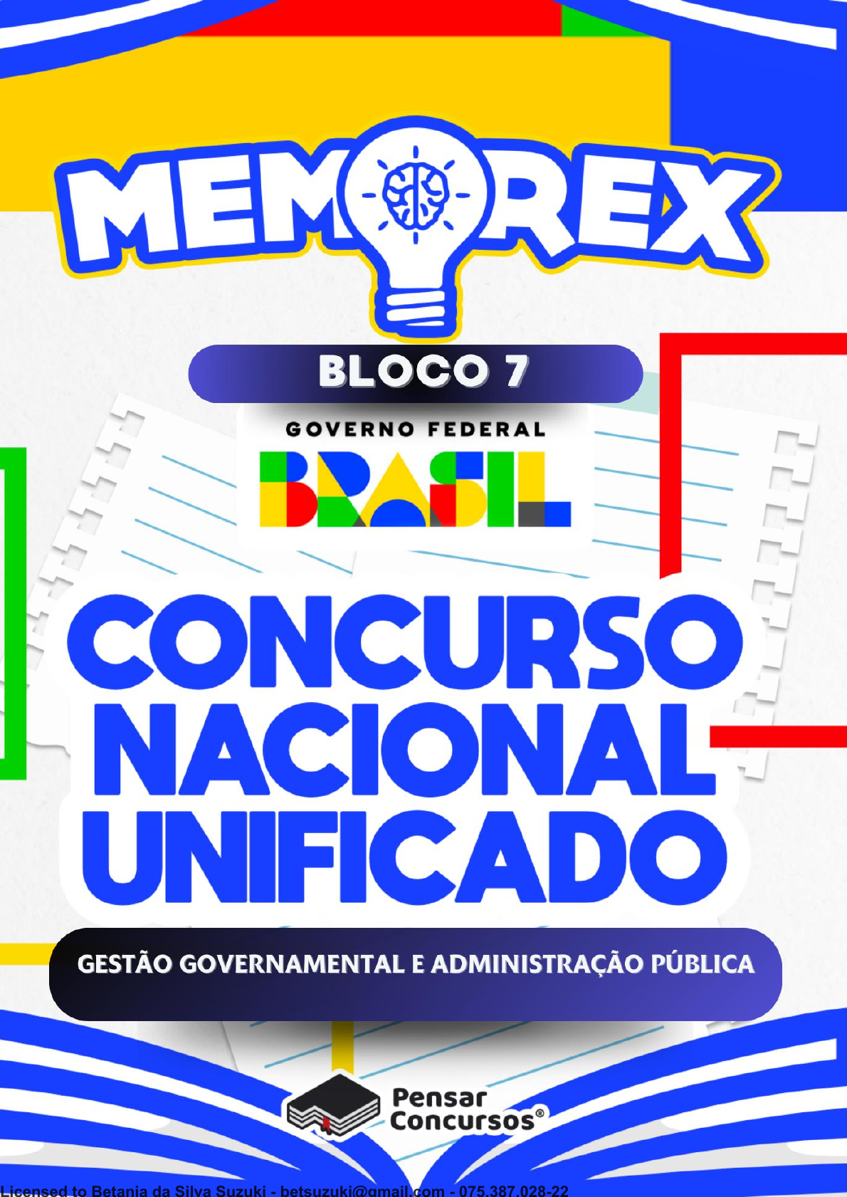 MEMOREX CNU (BLOCO 07) – RODADA 05 Todos os direitos reservados. Proibida cópia, plágio ou comercialização. Pensar Concursos. 1 Licensed to Betania da Silva Suzuki - betsuzuki@gmail.com - 075.387.028-22 MEMOREX CNU (BLOCO 07) – RODADA 05 Todos os direitos reservados. Proibida cópia, plágio ou comercialização. Pensar Concursos. 2 Parabéns por ter dado esse passo importante na sua preparação, meu amigo (a). Temos TOTAL certeza de que este material vai te fazer ganhar muitas questões e garantir a sua aprovação. Você está tendo acesso agora à Rodada 05. A última rodada será disponibilizada na sua área de membros conforme o cronograma abaixo: Material Data Rodada 01 Disponível imediatamente Rodada 02 Disponível imediatamente Rodada 03 Disponível imediatamente Rodada 04 Disponível imediatamente Rodada 05 Disponível imediatamente Rodada 06 19/02/2024 Convém mencionar que todos que adquirirem o material completo irão receber TODAS AS RODADAS já disponíveis, independente da data de compra. Nesse material focamos também nos temas mais simples e com mais DECOREBA, pois, muitas vezes, os deixamos de lado e isso pode, infelizmente, custar inúmeras posições no resultado f inal. Lembre-se: uma boa revisão é o segredo da APROVAÇÃO. Portanto, utilize o nosso material com todo o seu esforço, estudando e aprofundando cada uma das dicas. Se houver qualquer dúvida, você pode entrar em contato conosco enviando suas dúvidas para: atendimento@pensarconcursos.com Licensed to Betania da Silva Suzuki - betsuzuki@gmail.com - 075.387.028-22 MEMOREX CNU (BLOCO 07) – RODADA 05 Todos os direitos reservados. Proibida cópia, plágio ou comercialização. Pensar Concursos. 3 ÍNDICE POLÍTICAS PÚBLICAS ............................................................................. 4 DESAFIOS DO ESTADO DE DIREITO: DEMOCRACIA E CIDADANIA ........... 6 ÉTICA E INTEGRIDADE ........................................................................... 9 DIVERSIDADE E INCLUSÃO NA SOCIEDADE .......................................... 11 ADMINISTRAÇÃO PÚBLICA FEDERAL .................................................... 14 FINANÇAS PÚBLICAS............................................................................ 17 GESTÃO GOVERNAMENTAL E GOVERNANÇA PÚBLICA: ESTRATÉGIA, PESSOAS, PROJETOS E PROCESSOS ...................................................... 19 GESTÃO GOVERNAMENTAL E GOVERNANÇA PÚBLICA: RISCOS, INOVAÇÃO, PARTICIPAÇÃO, LOGÍSTICA E PATRIMÔNIO ...................... 22 POLÍTICAS PÚBLICAS E NOÇÕES DE ESTARTÍSTICA ............................. 25 ADMINISTRAÇÃO FINANCEIRA E ORÇAMENTÁRIA, CONTABILIDADE PÚBLICA E COMPRAS NA ADMINISTRAÇÃO PÚBLICA ............................ 27 COMUNICAÇÃO, GESTÃO DOCUMENTAL, TRANSPARÊNCIA E PROTEÇÃO DE DADOS ............................................................................................ 29 Licensed to Betania da Silva Suzuki - betsuzuki@gmail.com - 075.387.028-22 MEMOREX CNU (BLOCO 07) – RODADA 05 Todos os direitos reservados. Proibida cópia, plágio ou comercialização. Pensar Concursos. 4 POLÍTICAS PÚBLICAS DICA 01 PROCESSOS DE DECISÃO A implementação de políticas públicas é um processo complexo que engloba muitas etapas, e os processos de decisão desempenham um papel crucial em todas elas. O primeiro passo no processo de decisão na implementação de políticas públicas é a identificação de um problema ou necessidade que requer intervenção do governo. Isso pode ser feito por meio de pesquisas, análises de dados, consultas públicas e envolvimento de especialistas. DICA 02 PROCESSOS DE DECISÃO Uma vez identif icado o problema, é preciso definir os objetivos da política pública que será implementada. Essa etapa engloba a definição de metas específ icas que a política pretende alcançar, bem como a identif icação dos grupos ou comunidades que serão afetados por ela. SISTEMATIZANDO: DICA 03 PROCESSOS DE DECISÃO Em momento posterior a definição dos objetivos, é preciso que haja a formulação da política pública. Isso envolve a elaboração de propostas, a análise de alternativas e a avaliação dos possíveis impactos. IMPORTANTE: No decorrer desta fase, os tomadores de decisão devem considerar uma série de fatores, como a viabilidade política, econômica e social da política, bem como seus efeitos potenciais sobre a equidade e a justiça social. DICA 04 PROCESSOS DE DECISÃO A próxima etapa é sua implementação. Neste estágio, as decisões sobre como a política será colocada em prática são cruciais. Isso engloba a alocação de recursos, a definição de responsabilidades e a elaboração de planos de ação. Os processos de decisão nesta fase devem levar em consideração as capacidades do governo. DICA 05 MONITORAMENTO DE UMA POLÍTICA PÚBLICA O monitoramento de uma política pública é um processo fundamental para garantir a eficácia, a transparência e o fornecimento de contas das ações governamentais. Identificação do problema/necessidade Definição dos objetivos 1º PASSO 2º PASSO Licensed to Betania da Silva Suzuki - betsuzuki@gmail.com - 075.387.028-22 MEMOREX CNU (BLOCO 07) – RODADA 05 Todos os direitos reservados. Proibida cópia, plágio ou comercialização. Pensar Concursos. 5 É por meio desse acompanhamento sistemático que se torna possível avaliar se os objetivos propostos estão sendo práticos, se os recursos estão sendo utilizados de maneira ef iciente e se as necessidades da população estão sendo atendidas de forma adequada. DICA 06 MONITORAMENTO DE UMA POLÍTICA PÚBLICA O monitoramento das políticas públicas interessa a muitos setores sociais, como os cidadãos, os agentes públicos, os órgãos de controle, as instituições da sociedade civil organizada, grupos da iniciativa privada entre outros. IMPORTANTE: os direitos sociais são efetivados por intermédio das políticas públicas, as quais apresentam