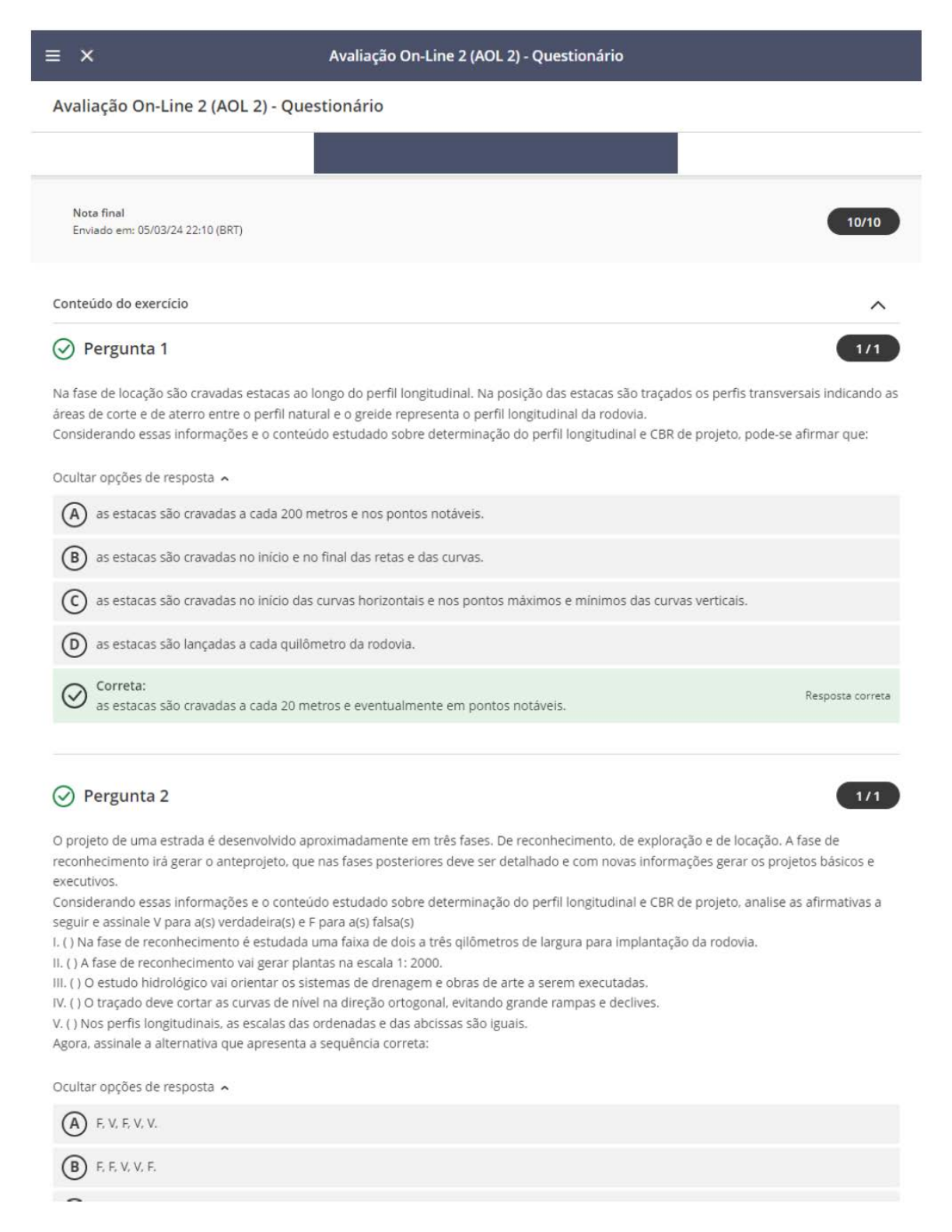 = X Avaliação On-line 2 (AOL 2) - Questionário Ava liação On-line 2 (AOL 2)- Questionário No1a final Enviado em: 05/03124 22:10 (BRT) @j,ijj,j Conteúdo do exercício 0 Pergunta 1 +u+ Na fase de locação são cravadas estacas ao longo do perfil longitudinal. Na posição das estacas são traçados os perfis transversais indicando as áreas de corte e de aterro entre o perfil natural e o greide representa o perfil longitudinal da rodovia. Considerando essas informações e o conteúdo estudado sobre determinação do perfil longitudinal e CBR de projeto. pode-se afirmar que: Ocultar opções de resposta ,. @ as estacas são cravadas a cada 200 metros e nos pontos notáveis. @ as estacas são cravadas no início e no final das retas e das curvas. @ as estacas são cravadas no início das curvas horizontais e nos pontos máximos e mínimos das curvas verticais. @ as estacas são lançadas a cada quilômetro da rodovia. Correta: as estacas são cravadas a cada 20 metros e eventualmente em pontos notáveis. 0 Pergunta 2 Resposta correta +u+ o projeto de uma estrada é desenvolvido aproximadamente em três fases. De reconhecimento. de exploração e de locação. A fase de reconhecimento irá gerar o anteprojeto. que nas fases posteriores deve ser detalhado e com novas informações gerar os projetos básicos e executivos. Considerando essas informações e o conteúdo estudado sobre determinação do perfil longitudinal e CBR de projeto. analise as afirmativas a seguir e assinale V para a(s) verdadeira(s) e F para a(s) falsa(s) 1. ( ) Na fase de reconhecimento é estudada uma faixa de dois a três qilõmetros de largura para implantação da rodovia. li. () A fase de reconhecimento vai gerar plantas na escala 1: 2000. Ili. ( ) O estudo hidrológico vai orientar os sistemas de drenagem e obras de arte a serem executadas. IV. ( ) o traçado deve cortar as curvas de nível na direção ortogonal. evitando grande rampas e declives. V. () Nos perfis longitudinais, as escalas das ordenadas e das abcissas são iguais. Agora. assinale a alternativa que apresenta a sequência correta: Ocultar opções de resposta ,. @ F,V,F,V,V. ® F,F,V,V,F. (0 F, V, F, V, F. 0 Correta: V, F, V, F, F. Resposta correta © V, V, F, F, V. 0 Pergunta 3 *"* O CAP (Cimento Asfáltico de Petróleo) é um material com alto teor de betume e dos mais nobres aplicados na pavimentação. O CAP é derivado do petróleo bruto e tem propriedades importantes principa lmente relacionados a impermeabilidade e poder aglutinante. Considerando essas informações e o conteúdo estudado sobre materia is para execução dos pavimentos das estradas, pode-se afirmar que: Ocultar opções de resposta A uma das desvantagens do CAP é o contrassenso da utilização de polímeros, melhorando suas qualidades. ® © mesmo ambientalmente correta, a incorporação de borracha triturada de pneus leva a um maior consumo de CAP no concreto asfáltico. a propriedade do CAP tomada como referência para sua classificação no Brasil é a viscosidade. Correta: 0 o CAP de forma diluída pode ser utilizado em imprimações entre as camadas como impermeabi lizante ou como elemento de ligação entre elas. © uma das vantagens do asfalto é sua inércia química em relação a combustíveis e lubrificantes. 0 Pergunta 4 Resposta correta *"* Os pavimentos podem ser classificados como flexíveis, rígidos ou semirrígidos. Os pavimentos flexíveis são aqueles que admitem certo nível de deformação sem atingir a ruptu ra e os rígidos são aqueles pouco deformáveis, tendo sua base normalmente executada com concreto de cimento Portland. Os semirrígidos possuem camadas estabilizadas com aglomerantes e o revestimento com material flexível, como o asfá ltico. Considerando essas informações e o conteúdo estudado sobre classificação de pavimentos, pode-se afirmar que: Ocultar opções de resposta A @ um pavimento executado com bloquetes de concreto sobre uma base de areia é classificado como semirrígido. @ o pavimento rígido rompe normalmente por fad iga enquanto que o flexível por tração. ® © Correta: um pavimento com base em materia l granular e revestimento asfáltico é classificado como flexível. Resposta correta um pavimento com subleito estabil izado com materia l granular e base executada com placas de concreto é classificado como sem irrígido. um pavimento com revestimento asfáltico e base executada com solo compactado enriquecido com cimento Portland é classificado como flexível. 0 Pergunta 5 *"* A partir de um solo com características inadequadas para execução das camadas do pavimento, pode-se obter um material de qualidade melhorada adicionando a esse solo agregados e promovendo a mistura desses materia is. A esse produto dá-se o nome de Solo-Brita (SB) ou Solo-Agregado (AS). Considerando essas informações e o conteúdo estudado sobre bases estabi lizadas granulometricamente, é correto afirmar que: Ocultar opções de resposta A o solo brita tem uso indicado para reforço do subleito, e restrições severas para uso em bases e sub-bases. ® ® a mistura de um solo local de ba ixa qualidade com pedregu lho não caracteriza o materia l resultante como solo brita ou solo agregado. © ® apesar do baixo custo dos materiais incorporados ao solo-brita, a execução da mistura deve ser feita em usina, encarecendo a operação. na confecção do solo brita, a proporção da brita é t radicionalmente limitada a 25%. Correta: a mistura solo brita ou solo agregado deve ser compactado com rolos vibratórios. Resposta correta 0 Pergunta 6 *"* No traçado das estradas, uma especial atenção deve ser dada às curvas horizontais. Os seus parâmetros geométricos estão atrelados à Classe Funcional da Rodovia e a Classe de Projeto que são classificadas de acordo com sua função, com o volume de t ráfego e a dificu ldade de imp lantação devido a características locais como sua topografia. Considerando essas informações e o c