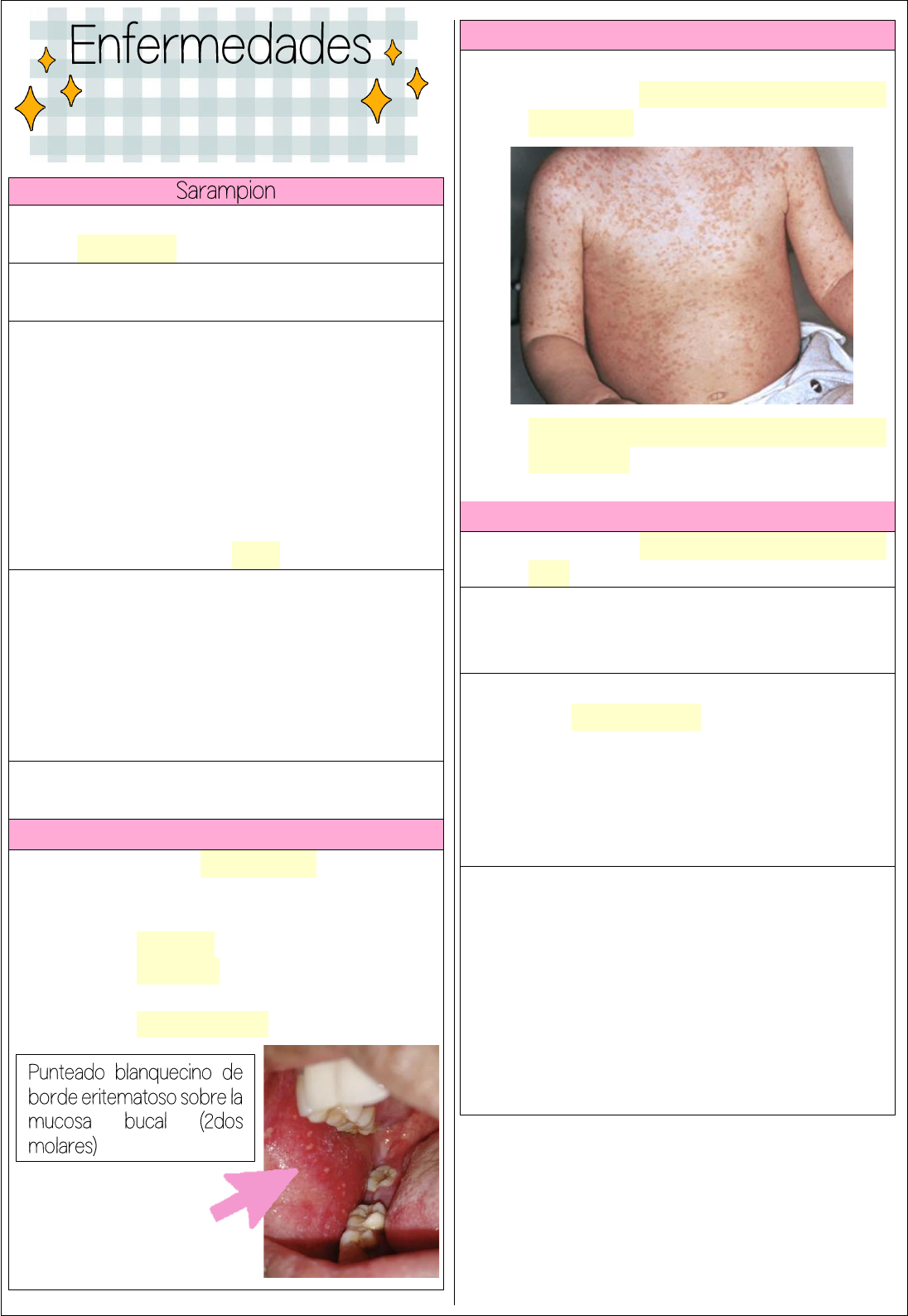 Etiología: Paramixovirus, género morbilivirus. Características: Circular, 200-250 mu, virus ARN, termolábil. Epidemiología: > incidencia en países subdesarrollados, donde la cobertura de vacunación no es la adecuada. Niño crece con anticuerpos maternos (IGG transplacentarios) que lo protegen por 6 meses. Frecuente en escolares y preescolares no inmunizados. Más pequeño > riesgo de gravedad y muerte. Contacto directo por gotitas. Patogenia: Ingreso del virus por conjuntivas principalmente y en < escala por nasofaringe. Se multiplican en la mucosa respiratoria., luego se dirigen a los ganglios regionales (1era replicación), por sangre se diregen al RES (2da replicación), se produce viremia masiva (inicio de síntomas) Clínica: Incubación de 8 a 12 días. Etapa catarral: Dura 4 a 5 días, máximo contagio. - Rinorrea, estornudos, tos. - Lagrimeo intenso, fotofobia. - Fiebre alta. - Conjuntivitis. - Síntomas digestivos. - Manchas de koplik. Etapa eruptiva Dura aproximadamente 1 semana, exantema morbiliforme: Maculo papulo eritematoso de bordes difusos. Extensión céfalo caudal (afecta cara, tronco y extremidades), < contagio que la etapa anterior. Afectación palmo-plantar. Etapa descamativa Dura 5-8 días. Desaparece erupción en el mismo orden. Descamación fina, desaparecen síntomas. Inmunidad: Durante el primer mes → IGM Después del primer mes → IGG. Vacunación: Edad: 1 año. Vacuna SPR (se recomienda refuerzo a los 4 años) Contraindicaciones: Niños con enfermedades inmunosupresoras, en tratamiento con corticoides, TBC activa sin tratamiento y mujer gestante en 1er trimestre. Tratamiento: Educación al paciente: Aislarlo durante el periodo contagioso (desde la aparición de los síntomas respiratorios hasta el cese de la erupción cutánea) Hidratación Vitamina "A" dosis única: - <1 año: 100,000 UI por 2 días. - >1 año: 200,000 UI por 2 días. Fiebre: paracetamol. Eruptivas Etiología: Togavirus, familia: Togaviridae, género: rubivirus. Clínica: Incubación: 10-21 días. Etapa prodrómica: Duración (24 a 48 horas) - Fiebre moderada. - Adenopatía retroauricular dolorosa. Etapa eruptiva: Duración (72 horas) Exantema maculopapular rosáceo descendente (cara, tronco y extremidades) de rápida progresión, a veces con prurito. No es confluente. Enantema: Punteado petequial en paladar blando (signo de Forschheimer) < contagiosa que sarampión. Contagio: 7 días antes y 7 días después. No afectación palmo-plantar. Etapa descamativa: Muy discreta. Inmunidad: La enfermedad produce inmunidad permanente (IGG). Transferencia transplacentaria de anticuerpos protectores al niño cuando la madre ha tenido rubeola o ha sido vacunada. Vacunación: Se administra al año. Vacuna SPR. Etiología: Virus varicela zoster, familia: herpetoviridae, virus ADN. Enzima principal: Timidinaquinasa (esencial para la activación de agentes antivirales como el aciclovir) Clínica: Incubación de 14 a 21 días. Etapa prodrómica: Duración de 24-48 hrs. Fiebre moderada, compromiso general leve. Etapa eruptiva: Duración de 5-7 días. Exantema papulo-vesicular. Prurito. Erupción empieza en tórax y espalda, y se extiende en forma centrífuga hacia la cara, cuero cabelludo y extremidades. Afectación palmoplantar. Etapa de convalecencia: Duración de 5 a 7 días. Costras, lesiones hipopigmentadas. Las vesículas se rompen, y forman costras que dan un aspecto umbilicado sobre base eritematosa. Tratamiento: Prurito: Apósito húmedos, baños calmantes, Opción: Clorfenamina 0.35 mg/kg/ día. Control de la fiebre. Aislamiento hasta que lesiones presenten costra (5-6 días). Etiología: Estreptococo B-hemolítico grupo A. Epidemiología: Se trasmite al estornudar o toser. Se asocia a infecciones faríngeas, heridas o quemaduras infectadas por estreptococos. Raro en <2 años, por presencia de anticuerpos maternos. Clínica: Período de incubación: 1-7 días. Inicio brusco. Etapa prodrómica: Fiebre > 39.5 º, dura 2 a 4 días (síntoma inicial). Facie rubicunda “Signo de Filatov” (cara roja con palidez perioral) Lengua en fresa (lengua seca con papilas rojas e hipertrofiadas) Etapa eruptiva: Después de 12-48 hrs de la fiebre. Eritema difuso con puntos rojos intensos que desaparecen a presión. Afecta tórax, cuello y extremidades, de textura áspera (piel de lija). Líneas de Pastia (petequias lineales en fosa antecubital y líneas axilares). Durante 1 o 2 días después de la erupción. Etapa descamativa: Descamación de la piel: axilas, ingle, puntas de dedos de pies y manos, después de la resolución de los exantemas. No hay vacuna. Pruebas diagnósticas: Cultivo de exudado faríngeo. Tratamiento: Penicilina V (Fenoximetilpenicilina) Amoxicilina. Penicilina G benzatínica (una sola dosis) - Administración por 10 días. - Azitromicina por 5 días. Etiología: Parvovirus B19, ADN. Epidemiología: Frecuente en edad escolar (5-15 años). Se transmite por vía respiratoria: 7 días previos a la erupción hasta su aparición. Viremia que termina a los 7 días con la aparición de anticuerpo IgM anti-B19. Clínica: Periodo de incubación: 4-14 días Etapa prodrómica: Fiebre, cefalea y rinorrea. Etapa eruptiva: A la 3era semana junto con artralgias. No se consideran infecciosos. 1º fase exantema maculo papular: Signo de la bofetada; aparece a los 2 o 3 días de los síntomas prodrómicos. 2º fase: Exantema maculo difuso tronco y extremidad. 3º fase Exantema reticulado "como encaje" sobre el tronco y las extremidades; puede haber prurito. Exantema desaparece y vuelve a aparecer ante un estímulo como la luz solar, con temperatura ambiental alta y a la actividad física. Dura hasta 3 ss más. No descama. Roséola infantil. La fiebre de los 3 días. Etiología: VHH 6, VHH 7. Epidemiología: Se transmite por vía respiratoria. Incubación 1 semana. Etapa prodrómica: Fiebre alta 39º - 40º de 3 días de duración. Etapa eruptiva: Aparece una vez desaparecida la fiebre. Lesiones maculop