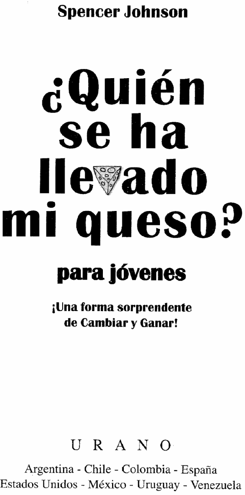 Sobre el autor Spencer Johnson es uno de los autores más respetados y queridos en todo el mundo. Con sus penetrantes relatos, que hablan directamente al corazón y al alma de la gente, ha entretenido e inspirado a millones de personas. A menudo se le menciona como el mejor a la hora de tomar temas complejos y presentar soluciones sencillas que funcionan. El doctor Johnson es el autor de numerosos éxitos publicados por The New York Times, incluyendo los bestsellers ¿Quién se ha llevado mi queso?, Cómo adaptarnos a un mundo en constante cambio y El ejecutivo al minuto®, el método más popular del mundo para la gestión, escrito con Kenneth Blanchard. Su formación académica incluye una licenciatura en Psicología por la Universidad de California del Sur y un doctorado en Medicina por el Royal College of Surgeons, además de haber formado parte de los equipos médicos de la Harvard Medical School y de la Clínica Mayo. El doctor Johnson ha trabajado como director médico de Comunicaciones de Medtronic, compañía inventora del marcapasos; como médico investigador en el think tank del Institute for Inter-Disciplinary Studies; como consultor para el Center for the Study of the Person, y para la Escuela de Medicina de la Universidad de California, y, además, como profesor de Liderazgo invitado en la Harvard Business School. Sus libros han aparecido a menudo en los medios de comunicación, incluyendo la CNN, The Today Show, Larry King Live, Business Week, The New York Times, Wall Street Journal, Fortune, USA Today, Associated Press y United Press International. Los libros de Spencer Johnson están disponibles en veintiséis idiomas en todo el mundo. NOTA DEL AUTOR Muchas personas de todo el mundo que han leído la versión inicial de ¿Quién se ha llevado mi queso? explican que les hubiera gustado conocer la «Historia del queso» cuando eran más jóvenes, pues se dan cuenta de que, de haber sido así, muchas cosas les habrían resultado más fáciles. Como adolescente, lo más probable es que te encuentres con muchos más cambios en tu vida de los que experimentaran tus padres o tus abuelos. ¿No te parecería fenomenal saber, ya desde esta etapa temprana de tu vida, cómo adaptarte al cambio… ¡y salir ganando!? En el relato que sigue descubrirás cómo percibir los cambios que se avecinan antes que la mayor parte de quienes te rodean, cómo no tomarte a ti mismo demasiado en serio y cómo adaptarte con rapidez — cómo ¡ moverte con el queso! —, de modo que logres que cualquier cambio se convierta en una ventaja para ti. Sea cual sea la situación de cambio en que te encuentres, deseo que puedas utilizar lo que aprendas en este relato para encontrar tu propio «Queso Nuevo» — aquello que realmente te importa— ¡y que lo disfrutes! SPENCER JOHNSON, DOCTOR EN MEDICINA El fenómeno «¿Quién se ha llevado mi queso?» El relato de «¿Quién se ha llevado mi queso?» fue creado por el doctor Spencer Johnson para que le ayudara a hacer frente a una difícil situación de cambio en su vida. Le mostró el modo de tomarse el cambio con seriedad, pero sin tomarse a sí mismo demasiado en serio. Cuando sus amistades se dieron cuenta de hasta qué punto su vida había mejorado y le preguntaron el secreto, él les contó su «Historia del queso». Algunas de aquellas personas relataron, incluso años más tarde, cómo aquel cuento les había ayudado a conservar el sentido del humor, a cambiar y a mejorar. Ken Blanchard, que escribió con él El ejecutivo al minuto, lo animó para que diera al relato forma de libro para así ayudar a muchas más personas. El libro ¿Quién se ha llevado mi queso? aparecía finalmente dos décadas después de que la historia fuera creada. El boca a boca lo convirtió rápidamente en un número uno internacional en ventas, con un millón de ejemplares en tapa dura vendidos en los primeros dieciséis meses, y más de diez millones vendidos en los dos años siguientes. Numerosas personas afirman que lo que descubrieron en ese relato mejoró sus carreras, sus negocios, su salud y sus matrimonios. La «Historia del queso» se ha introducido en hogares, empresas, escuelas, iglesias, instituciones militares y equipos deportivos. Se ha ido extendiendo por todo el mundo en numerosos idiomas. Su atractivo es universal. Sus críticos, por otra parte, no comprenden la razón por la que tantas personas consideran la historia tan valiosa. Aseguran que es tan simple que hasta un niño la entendería, que es un insulto a su inteligencia porque no es más que simple sentido común. Evidentemente, no sacan nada en claro del relato. Algunos incluso llegan a temer que sugiere que cualquier cambio es bueno, por lo que la gente debería conformarse, sin reflexionar, con los cambios impuestos por otros, aunque eso no se diga en la historia. El autor ha comentado que tanto entusiastas como detractores tienen «razón» a su modo. El valor de la historia de ¿Quién se ha llevado mi queso? no está en lo que cuenta, sino en el modo en que cada cual lo interpreta y lo aplica a su propia situación. Espero que el modo en que tú interpretes ¿Quién se ha llevado mi queso? en esta edición especial para adolescentes y cómo lo pongas en práctica en tu vida te ayude a encontrar ese «Queso Nuevo» que mereces. — — — He aquí lo que algunos líderes dicen sobre la edición original de ¿Quién se ha llevado mi queso? «De vez en cuando aparece un libro que abre una puerta al futuro. Ése es el efecto que me ha causado este libro.» —David A. Heenari, miembro del consejo de administración PETER F. DRUCKER MANAGEMENT CENTER «En cuanto terminé de leerlo, pedí más ejemplares como instrumentos de ayuda para los cambios incesantes a los que nos enfrentamos, cada vez que modificamos un equipo para abrir nuevos mercados.» —Joan Banks, especialista en rendimiento y eficacia WHIRLPOOL CORPORATION «Me puedo ver a mí mismo leyendo esta magnífica historia a mis hijos y 
