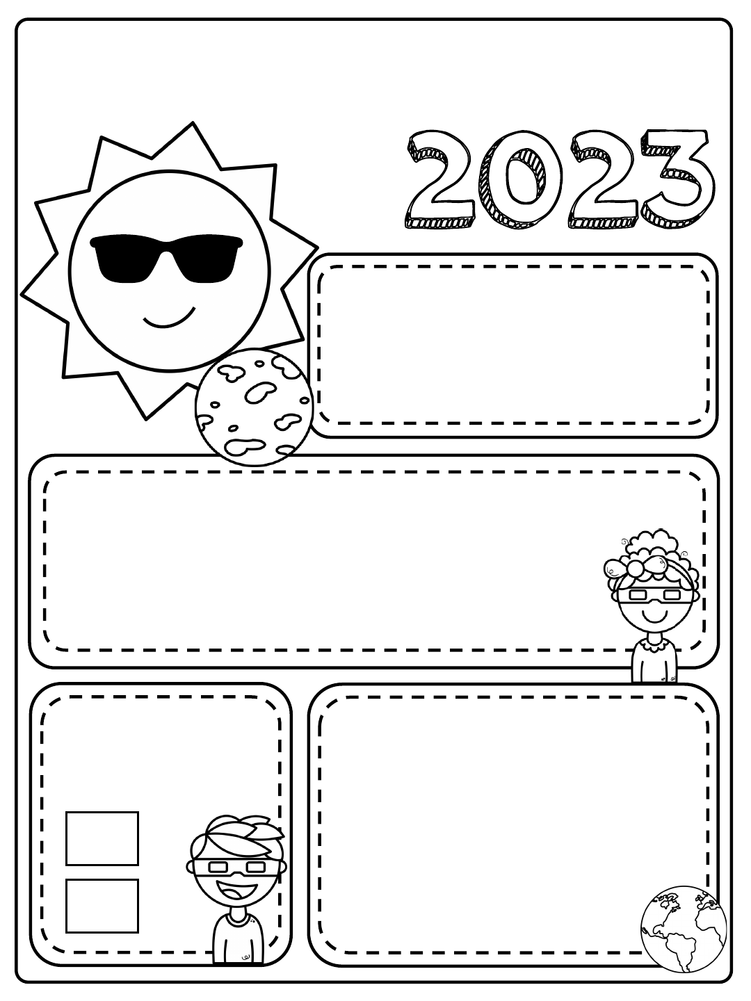 ECLIPSE SOLAR Nombre:____________ Edad: _____________ Grado y grupo:_______ v Mi parte favorita del eclipse: v Cuando pasó, yo estaba… v ¿Se oscureció por completo? Si No @M un do d e let ra s, Ma te ria l E du ca tiv o ECLIPSE SOLAR Un eclipse solar ocurre cuando la Luna pasa entre la Tierra y el Sol, bloqueando parcial o totalmente la luz solar. Esto crea un oscurecimiento temporal en ciertas áreas de la Tierra. Durante el eclipse, la umbra representa la parte más oscura y central de la sombra de un eclipse. Aquí es donde se puede ver la totalidad durante un eclipse solar. Por su parte la penumbra representa la parte más clara y periférica de la sombra de un eclipse. Aquí es donde se puede observar un eclipse parcial. penumbraumbra eclipse totaleclipse parcial corta y pega @M un do d e let ra s, Ma te ria l E du ca tiv o EC LIP SE S OL A R D ur an te u n ec lip se s ol ar , la L un a pa sa e nt re la T ie rr a y el So l, bl oq ue an do p ar ci al o t ot al m en te la lu z so la r. E st o cr ea un o sc ur ec im ie nt o te m po ra l e n ci er ta s ár ea s de la T ie rr a. pe nu m br a um br a ec lip se t ot al ec lip se pa rc ia l @M un do d e let ra s, Ma te ria l E du ca tiv o ECLIPSE SOLAR Durante un eclipse solar, la Luna pasa entre la Tierra y el Sol, bloqueando parcial o totalmente la luz solar. Esto crea un oscurecimiento temporal en ciertas áreas de la Tierra. @M un do d e let ra s, Ma te ria l E du ca tiv o ECLIPSE SOLAR ANULAR Anillo de fuego El "anillo de fuego" es un fenómeno que ocurre durante un eclipse solar anular. Durante este tipo de eclipse, la Luna no cubre completamente el disco del Sol, dejando un anillo de luz visible alrededor de la Luna. Esto crea la apariencia de un anillo brillante alrededor de la Luna, de ahí el nombre "anillo de fuego". Cuando la Luna está en su punto más alejado de la Tierra en su órbita elíptica, parece más pequeña en comparación con el Sol y no puede cubrirlo por completo durante un eclipse. Entonces, se forma un anillo de luz solar alrededor de la Luna, lo que crea este espectacular fenómeno que se conoce como el anillo de fuego. @M un do d e let ra s, Ma te ria l E du ca tiv o ECLIPSE SOLAR tierrasol lunasombra corta y pega v @M un do d e let ra s, Ma te ria l E du ca tiv o s o l l u n a t i e r r a s o m b r a @M un do d e let ra s, Ma te ria l E du ca tiv o ECLIPSE SOLAR corta y pega ECLIPSE SOLAR Repasamos la letra S-S-S-S-S-S-S-S-S-S- s-s-s-s-s-s-s-s-s-s-s-s-s Repasa Colorea los círculos que tengan la letra “S” s d s r t s m s Traza la palabra” _sol_ @M un do d e let ra s, Ma te ria l E du ca tiv o ECLIPSE SOLAR Repasamos la letra L-L-L-L-L-L-L-L-L-L-L l-l-l-l-l-l-l-l-l-l-l-l-l- Repasa Colorea los círculos que tengan la letra “ l ” o p l r l s n l Traza la palabra” _luna_ @M un do d e let ra s, Ma te ria l E du ca tiv o ECLIPSE SOLAR Repasamos la letra T-T-T-T-T-T-T-T-T-T-T t-t-t-t-t-t-t-t-t-t-t-t-t-t Repasa Colorea los círculos que tengan la letra “ l ” t e g t t a t w Traza la palabra” tierra @M un do d e let ra s, Ma te ria l E du ca tiv o ECLIPSE SOLAR Durante un eclipse solar, la Luna pasa entre la Tierra y el Sol, bloqueando parcial o totalmente la luz solar. Esto crea un oscurecimiento temporal en ciertas áreas de la Tierra. Durante un eclipse solar total, la Luna cubre completamente el disco del Sol, lo que resulta en un oscurecimiento total del cielo durante unos minutos. Solo las regiones que se encuentran en la trayectoria de la sombra proyectada por la Luna pueden experimentar un eclipse solar total. Durante un eclipse solar parcial, la Luna no cubre completamente el Sol, pero todavía bloquea parte de su luz. Por lo tanto, solo algunas áreas de la Tierra experimentarán un oscurecimiento parcial. Durante un eclipse solar, la temperatura ambiente puede disminuir y la visibilidad se ve afectada. Es importante tomar precauciones al observar un eclipse solar, ya que mirar directamente al Sol sin protección puede dañar los ojos de manera permanente. Se deben utilizar gafas de eclipse o métodos de observación seguros para disfrutar del evento de manera segura. Los eclipses solares son fenómenos astronómicos fascinantes y relativamente raros. Pueden capturar la atención de muchas personas y brindan la oportunidad de estudiar y aprender sobre el sistema solar y la alineación de los cuerpos celestes. lectura @Mundo de letras, Material Educativo ECLIPSE SOLAR ¿Qué efectos crees que causa el bloqueo parcial o total de la luz solar durante un eclipse solar? _____________________________________________________________________________ __________________________________________________________________________________________________ 2. ¿Por qué crees que solo algunas áreas de la Tierra experimentan un oscurecimiento parcial durante un eclipse solar? _____________________________________ __________________________________________________________________________________________________ 3. ¿Cuál crees que es la importancia de tomar precauciones al observar un eclipse solar? _________________________________________________________________________________ __________________________________________________________________________________________________ 4. ¿Qué podemos aprender sobre el sistema solar y la alineación de los cuerpos celestes a través del estudio de los eclipses solares? __________________________________________________________________________________________________ __________________________________________________________________________________________________ 5. ¿Qué tipo de impacto crees que tiene un eclipse solar en la temperatura ambiente y la visibilidad? __________________________________________________________________ __________________________________________________________________________________________________ 6. ¿Cuál es tu opinión personal sobre los eclipses solares y por qué crees que capturan la atención de tantas personas? _________