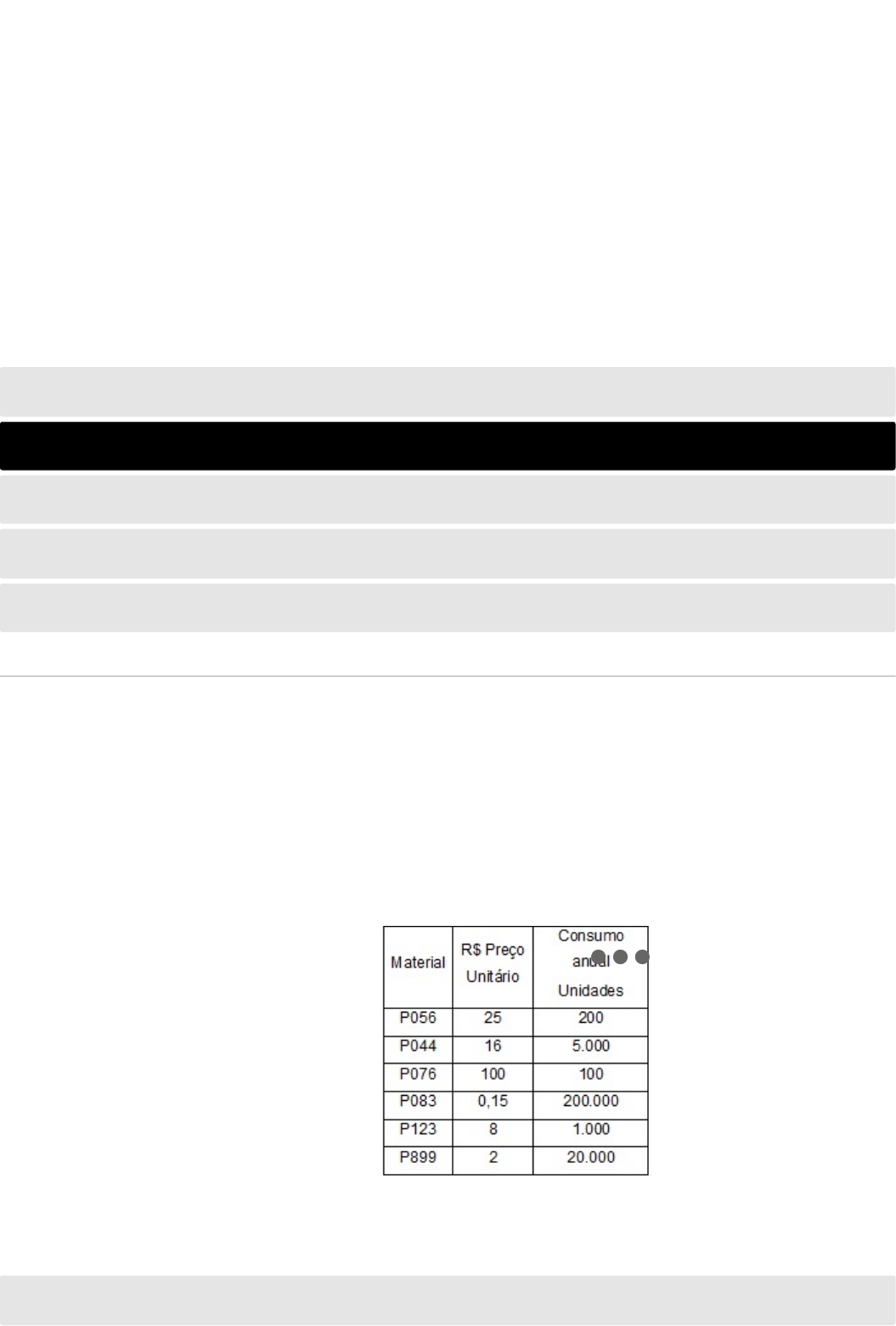 Mostrar opções de resposta Mostrar opções de resposta Pergunta 1 O componente P22 é um item de estoque comprado pela Cia. Flórida. Como sua demanda é de 200 unidades/mês, a empresa mantém estoque de segurança de 50 unidades e a entrega é efetuada em 8 dias úteis. Supondo que o mês tenha 20 dias úteis e que as compras sejam feitas em lotes de 1.000 unidades, use as fórmulas abaixo e assinale a alternativa correta para os valores de Emax, Em e PP, respectivamente: Emax = ES + Q Em = ES + Q/2 PP = (TA x D) + ES 1.000; 500; 1.650 1.050; 550; 130 1.000; 525; 80 1.050; 550; 80 2.000; 8; 20 Pergunta 2 A partir da tabela e dos parâmetros dados, assinale a alternativa correta quanto à classificação ABC: - Classe A: até 50% do valor acumulado de consumo; - Classe B: entre 51% e 95% do valor acumulado de consumo; - Classe C: de 96% a 100% do valor acumulado de consumo. Os produtos P076 e P083 são produtos A. Mostrar opções de resposta Mostrar opções de resposta Apenas o produto P044 é A. Os produtos P899 e P076 classificam-se como C. O produto P056 pode ser classificado como A. Apenas os produtos P123 e P056 são B. Pergunta 3 Slack (2002, p.20) define o estoque como a acumulação armazenada de materiais em um sistema de transformação. Toda empresa que opta por manter estoques neste sistema tem como objetivo: I - Atender o consumidor na quantidade correta; II – Entregar os pedidos na hora certa e no prazo desejado; III – Confeccionar produtos que tenham a qualidade especificada; IV – Chegar a um preço superior ao que o cliente esteja disposto em pagar. Pode-se afirmar que: Somente a afirmativa II está incorreta. Somente a afirmativa IV está incorreta. As afirmativas I e III estão incorretas. Somente a afirmativa III está correta. As afirmativas I e IV estão corretas. Pergunta 4 Assinale a alternativa correta quanto aos custos de Estoque: O controle do Custo de Oportunidade é também muito importante para a empresa, pois caso ela não tenha o produto disponível ao seu cliente, esse terá a “oportunidade” de experimentar o produto do seu concorrente. Custos de Pessoal são aqueles relacionados ao custo anual do m2 de armazenamento que a empresa utiliza em seu galpão próprio ou terceirizado. Custos de Materiais podem ser fixos e variáveis e são referentes ao processo de emissão de um pedido como: fichas de pedido, envio aos fornecedores etc. Atualmente, estima-se que o custo de manutenção de estoques seja de aproximadamente 25% do valor médio dos produtos da empresa. Custo de Falta é o mais importante do sistema podendo ser definido como a imobilização do capital em estoque, quando este poderia ser alocado no mercado de ações ou em investimentos.