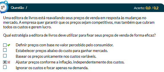 Uma editora de livros está reavaliando seus preços de venda em resposta às mudanças no mercado. A empresa quer garantir que os preços sejam competitivos, mas também que cubram todos os custos e gerem lucro. Qual estratégia a editora de livros deve utilizar para fixar seus preços de venda de forma eficaz? Definir preços com base no valor percebido pelo consumidor. Estabelecer preços abaixo do custo para ganhar mercado. Basear os preços unicamente nos custos variáveis. Ajustar preços conforme a independentemente dos custos. Ignorar os custos e focar apenas na demanda.