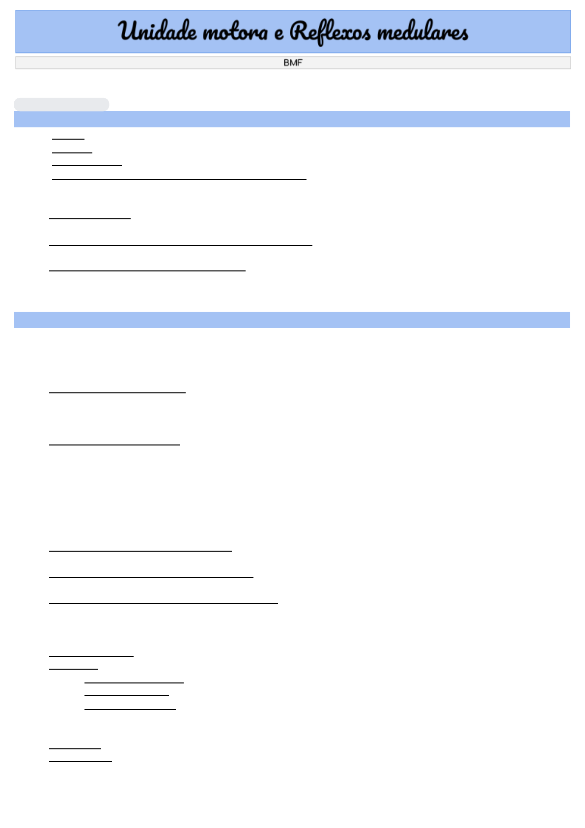 Medicina - 4º Semestre - Ana Paula Cuchera, Eduarda Costa e Karen Tokitaka 16 de nov. de 2022 Glossário ● Tônus: tensão muscular ● Reflexo: resposta automática e estereotipada, porém flexível e adaptável ● Fasciculação: contração involuntária, espasmo muscular, contração breve e espontânea ● Motoneurônio inferior, neurônio motor inferior: neurônios cujo corpo celular estão presentes no corno anterior da medula ou no tronco encefálico ● Fibras musculares esqueléticas, músculo estriado esquelético, fibras extrafusais ● Interneurônios: neurônios que não são classificados como aferentes ou eferentes, mas transmitem a informação entre estas vias ● Órgão tendinoso de Golgi, órgão neurotendíneo: estrutura encapsulada presente na junção entre as fibras musculares e os tendões sensíveis à mudanças na tensão muscular ● Fuso neuromuscular, fuso muscular: receptores encapsulados sensíveis à mudanças no comprimento muscular Neurônios motores - Para contrair o músculo é preciso neurônio motor superior ou inferior ● Os 2 formam uma via eferente: corticoespinal e corticonuclear - Contração muscular voluntária → precisamos de 2 neurônios: ● Neurônio motor superior ○ Localizado no giro pré central → córtex de projeção (eferente) ○ Camada mais desenvolvida é a V (camada piramidal interna) → tem célula de Bets ● Neurônio motor inferior ○ Localizado na medula espinal e núcleo facial ○ Na região do corno/coluna anterior ○ Vai até o músculo e forma o nervo motor ○ Forma junção neuromuscular - Existem outros tratos que servem para regular o tônus da musculatura - Sendo eles: ● Núcleo rubro → trato rubroespinal ○ Aumento do tônus flexor de membro superior ● Núcleo vestibular → vestibuloespinhal ○ Leva o aumento do tônus de extensão ● Formação reticular → trato retículo espinal ○ Leva o aumento do tônus de extensão - Regula os movimentos para o córtex ou para os núcleos: ● Núcleo da base ● Cerebelo → problema de coordenação motora (ataxia) ○ Vestibulocerebelo ○ Espinocerebelo ○ Cerebrocerebelo → recebe aferência do córtex (importante para regular o movimento) - Pode agir pela via indireta ou direta: ● Via direta → facilita o movimento indesejado → causa Hipocinesia ● Via indireta → inibe o movimento indesejado → causa Hipercinesia 1 Junção neuromuscular - Célula de Schwann → bainha de mielina do SNP - Formada por um: ● Neurônio motor inferior + músculo estriado esquelético + Célula de Schwann - Placa motora → região do músculo que tem muitos receptores - Localizada no músculo estriado esquelético na junção neuromuscular - Essa região do músculo tem muitos receptores → receptor nicotínico de acetilcolina Doenças neuromusculares - Doença que afeta a junção neuromuscular: ● Miastenia grave ● Tétano ● Botulismo ● Atrofia muscular espinal de Duchaine - Pode ser: ● Pré juncional → afeta o neurônio ● Pós juncional → afeta o músculo estriado esquelético ● Juncional → afeta algo na fenda sináptica - Canal do tipo ionotrópico → canais iônicos Unidade motora - Um neurônio motor e as fibras musculares por ele inervadas - 5 até 1800 fibras por neurônio motor - Um neurônio pode inervar várias fibras nervosas - Exemplo: se o paciente tem um AVC, o neurônio que leva o movimento morre e o paciente não consegue esticar o braço - Quando ele faz fisioterapia, o neurônio vizinho que vai ajudar a fazer sinapse para fazer essa extensão que não está recebendo → isso se chama neuroplasticidade - Músculo tônico → lutam contra a gravidade - inervado por muita fibra de neurônio - Músculo fásico → movimentos dinâmicas - inervação por poucas fibras de neurônio Propriedades - Velocidade de contração - Força máxima - Resistência à fadiga - ATPase ou CPM (MHC) ● Tipo I → fibra muscular branca (predominância do metabolismo glicolítico) ● Tipo II → fibra muscular vermelha (mais resistência a fadiga, pois tem mais mioglobina) → predomina metabolismo aeróbico ○ a, b, x e d 2 Adaptável - Se morre um neurônio que é de fibra branca → a fibra vermelha ao lado pode se tornar branca (mudança do fenótipo do músculo) - Com isso enxergamos células brancas e vermelhas misturadas Receptores - Além dos músculos temos: ● Fuso muscular → sensível a alterações no tamanho da fibra muscular (contração isotônica) ○ Com movimento muscular e mantendo o tônus ● Órgão tendinoso de Golgi → sensível a tensão do músculo, no tendão (contração isométrica) ○ Exemplo: Prancha na academia, contração de sustentação → sem movimento muscular, o músculo não mudou de tamanho, mas ficou tenso ○ Não tem movimento articular, mas tem tensão no tônus Fuso muscular - Receptores sensoriais encapsulados - Fusiforme - Localizados entre as fibras musculares - Sensíveis ao comprimento muscular - Componentes: ● Fibras intrafusais ● Fibras sensoriais (Ia e II) ● Axônios motores (MNγ) Órgão tendinoso de Golgi - Receptores sensoriais encapsulados - Localizados na junção entre as fibras musculares e o tendão - Axônio Ib - Sensíveis a tensão muscular Reflexo - Reflexo → resposta involuntária e estereotipada - Reflexo miotático ou reflexo muscular → martelinho para testar - Lei da inervação recíproca (Sherrington) → quando o estímulo vai para o músculo agonista, o antagonista dele é inibido ● Exemplo: Se tiver fazendo movimento na academia e estiver contraído o bíceps não é possível contrair o tríceps também (ele trava) Reflexo de Estiramento - Reflexo cujo o estímulo é o estiramento do músculo (reflexo de proteção) ● Fuso neuromuscular → receptor responsável pelo reflexo de estiramento do músculo ● Resposta → contração do músculo que foi estirado Estímulo → recebido pelo fuso muscular → leva informação para o neur