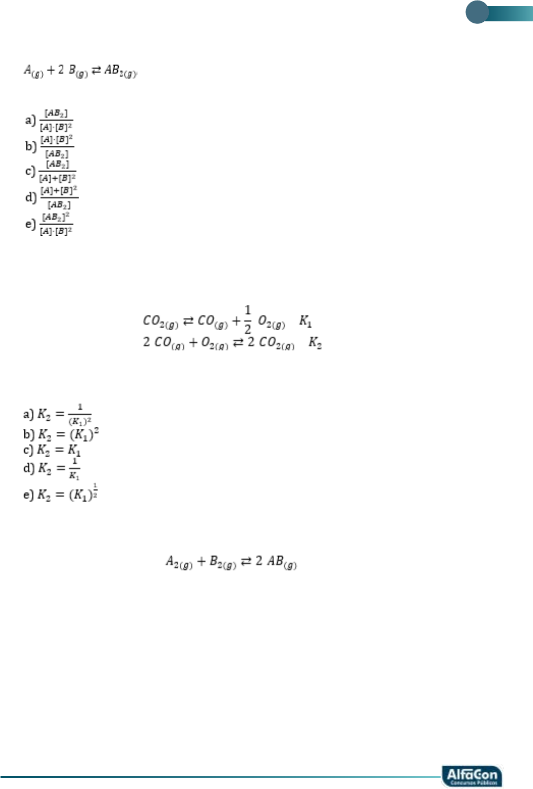 ExERCÍCIOS 5 2. (MACKENZIE - 2018) Considerando-se o equilíbrio químico equacionado por sob temperatura de a alternativa que mostra a expressão corre- ta da constante de equilíbrio em termos de concentração em mols por litro é 3. (UFJF-PISM 3 - 2017) Considere os seguintes equilíbrios que envolvem e suas constantes de equilíbrio correspondentes: Marque a alternativa que correlaciona as duas constantes de equilíbrio das duas reações anteriores. 4. (MACKENZIE - 2017) Em um balão de capacidade igual a foram adicionados mol da espécie e mols da espécie Tais reagentes sofreram transformação de acordo com a equação a seguir: Considerando-se que, no estado de equilíbrio químico, a concentração da espécie AB(g) seja 0,1 mol ∙ L–1 de a constante de equilíbrio (Kc) para esse processo, é aproximadamente igual a a) 0,25 b) 1,33 c) 5,00 d) 6,66 e) 7,50 6 5. (CEFET MG - 2015) O gráfico a seguir apresenta as variações das concentrações de três substâncias (A, B, e C) durante uma reação química monitorada por 10 minutos. A equação química que representa estequiometricamente essa reação, é a) 2A + B → 3C b) 2A → 3C + B c) 2B → 2C + A d) 3B + C → 2A e) 6C + 4A → 2B 6. (ITA - 2015) Considere as seguintes reações químicas e respectivas constantes de equilíbrio: Então, é igual a