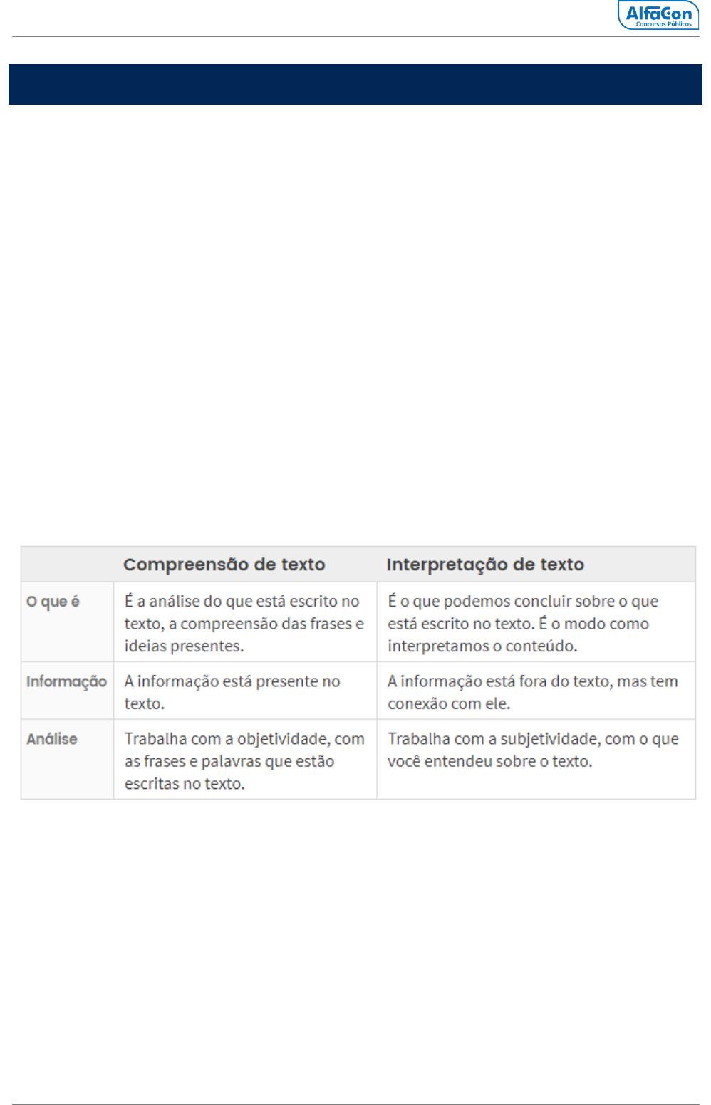 alfaconcursos.com.br MUDE SUA VIDA! 2 LEITURA E INTERPRETAÇÃO CONCEITO Ler é uma atividade muito mais complexa do que a simples interpretação de símbolos gráficos e códigos. Isso significa que o indivíduo seja capaz de interpretar o material lido, comparando-o e incorporando-o à sua bagagem pessoal. Assim, ele mantém um comportamento ativo diante da leitura. De uma forma geral, passamos por diferentes níveis ou etapas até termos condições de aproveitar totalmente o assunto lido. Essas etapas ou níveis são cumulativas e vão sendo adquiridas pela vida, estando presente em praticamente toda a nossa leitura. QUAL A DIFERENÇA ENTRE COMPREENSÃO E INTERPRETAÇÃO DE TEXTO? A compreensão de um texto é a análise e decodificação do que está realmente escrito, seja das frases ou das ideias presentes. Já a interpretação de texto, está ligada às conclusões que podemos chegar ao conectar as ideias do texto com a realidade. É o entendimento subjetivo que o leitor teve sobre o texto. É possível compreender um texto sem interpretá-lo, porém não é possível interpretá-lo sem compreendê-lo. O QUE É COMPREENSÃO DE TEXTO? A compreensão de texto significa decodificá-lo para entender o que foi dito. É a análise objetiva e a assimilação das palavras e ideias presentes no texto. As expressões que geralmente se relacionam com a compreensão são: Segundo o texto… De acordo com o autor… No texto… O texto informa que... O autor sugere… https://www.alfaconcursos.com.br/ alfaconcursos.com.br MUDE SUA VIDA! 3 O QUE É INTERPRETAÇÃO DE TEXTO? A interpretação do texto é o que podemos concluir sobre ele, após estabelecer conexões entre o que está escrito e a realidade. São as conclusões que podemos tirar com base nas ideias do autor. Essa análise ocorre de modo subjetivo e está relacionada com a dedução do leitor. Existe uma ciência que estuda a teoria da interpretação, chamada de hermenêutica. Trata-se de um ramo da filosofia que explora a interpretação de textos em diversas áreas, como literatura, religião e direito. Na interpretação de texto, as expressões geralmente utilizadas são: Diante do que foi exposto, podemos concluir… Infere-se do texto que… O texto nos permite deduzir que… Conclui-se do texto que... O texto possibilita o entendimento de... NÍVEIS DE LEITURA PRIMEIRO NÍVEL. O primeiro nível é chamado de leitura elementar. Nela, há pouco envolvimento intelectual e emocional. Por isso, geralmente são leituras rápidas e de fácil entendimento, como propagandas e banners. Nessa fase, o leitor é capaz de responder qual é o conteúdo do texto, mas sem se aprofundar mais. Em outras palavras, é um nível elementar e diz respeito ao período de alfabetização. Ler é uma capacidade cerebral muito sofisticada e requer experiência. Não basta conhecermos os códigos, a gramática, a semântica: é preciso que tenhamos um bom domínio da língua. SEGUNDO NÍVEL É a pré-leitura, leitura de inspeção ou leitura inspecional. Nesse patamar, o leitor age como um detetive: lê mais de uma vez, analisa as frases, entende o contexto, etc. A pessoa ainda não está totalmente envolvida com a leitura, mas já de aproxima mais do conteúdo do texto.Tem duas funções específicas: primeiro, prevenir para que a leitura posterior não nos surpreenda e, segundo, para que tenhamos chance de escolher qual material leremos, efetivamente. Trata-se da primeira impressão sobre o livro. É a leitura que comumente desenvolvemos “nas livrarias”. Nela, por meio do salteio de partes, respondem basicamente às seguintes perguntas: Por que ler este livro? Será uma leitura útil? Dentro de que contexto ele poderá se enquadrar? Essas perguntas devem ser revistas durante as etapas que se seguem, procurando usar de imparcialidade quanto ao ponto de vista do autor, e o assunto, evitando preconceitos. Se você se propuser a ler um livro sem interesse, com olhar crítico, rejeitando-o antes de conhecê-lo, provavelmente o aproveitamento será muito baixo. Ler é considerar os seguintes pontos: armazenar informações; desenvolver; ampliar horizontes; compreender o mundo; comunicar-se melhor; escrever melhor; https://www.alfaconcursos.com.br/