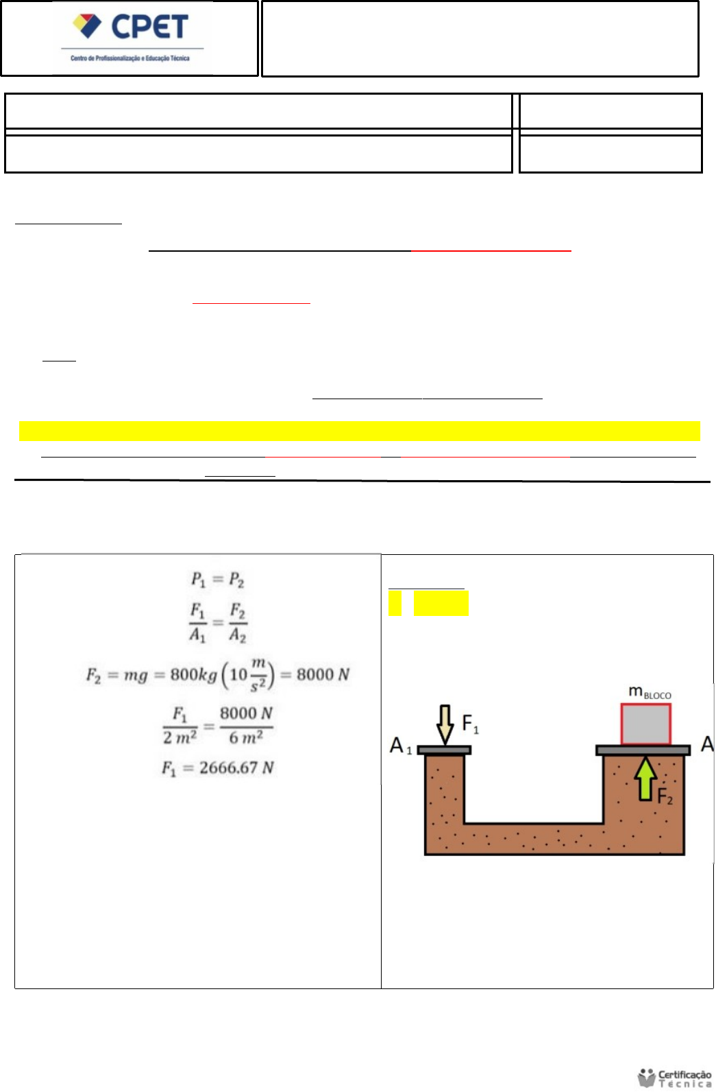 Mecânica dos Fluidos Aluno (a): Augusto Rodrigues Horta Data: 02/02/24 Avaliação Prática Final INSTRUÇÕES: POR FAVOR, LEIA AS INSTRUÇÕES: ❖ Preencha os dados no Cabeçalho para sua identificação; ❖ Esta Avaliação contém 02 (duas) questões, totalizando 10 (dez) pontos; ❖ Leia com atenção os enunciados e faça o que se pede; ❖ As respostas devem ser digitadas abaixo de cada pergunta; ❖ NÃO serão aceitas respostas e textos retirados da íntegra Internet, assim como imagens (desde que seja pedida). A interpretação e execução fazem parte do processo. ❖ Ao terminar grave o arquivo com o nome APF Disciplina – Nome do Aluno; ❖ Só serão aceitas as extensões .docx (M.S. Word) ou .PDF; ❖ Envie o arquivo pelo sistema no local indicado; ❖ Atividades enviadas “em branco”, plagiadas de sites ou repetidas de outros alunos, terão notas ZERO. ❖ Verifiquem no campo de comentário o feedback dado pelo tutor. ❖ Em caso de dúvidas consulte o seu Tutor. 1) O esquema da figura trata-se de uma unidade de elevação hidráulica. Determine a Força 1 (F1) aplicada pela bomba hidráulica para que seja mantido o equilíbrio do sistema. Considere: F1 = ? N A1 = 2 m2 A2 = 6 m2 g = 10 m/s2 mbloco = 800 kg Mecânica dos Fluidos 2) Explique como e para que a equação da continuidade é utilizada na mecânica dos fluidos. Quais são os parâmetros utilizado na equação e as principais unidades que são aplicadas segundo o Sistema Internacional de unidades. A equação da continuidade é uma das equações fundamentais da mecânica dos fluidos. Ela é utilizada para descrever a conservação da massa em um fluxo de fluido incompressível. A equação relaciona a velocidade do fluido com a área da seção transversal do tubo por onde o fluido passa. A equação é dada por: A_1v_1 = A_2v_2 OndeA_1eA_2são as áreas das seções transversais do tubo em dois pontos diferentes, ev_1ev_2são as velocidades do fluido nesses pontos. A equação da continuidade é utilizada para determinar a vazão de um fluido em um tubo, que é a quantidade de fluido que passa por uma seção transversal do tubo por unidade de tempo. A vazão é dada por: Q = A_1v_1 = A_2v_2 A equação da continuidade é uma equação dimensionalmente homogênea, o que significa que as unidades dos termos em ambos os lados da equação devem ser iguais. Mecânica dos Fluidos