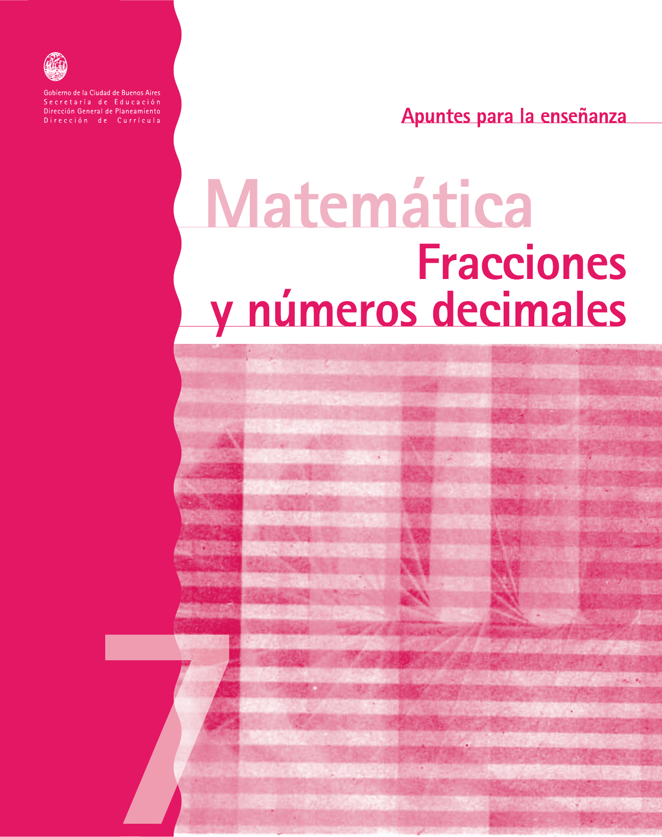 Matemática Fracciones y números decimales. 7º grado Apuntes para la enseñanza Gobierno de la Ciudad de Buenos Aires . Secretaría de Educación . Dirección General de Planeamiento . Dirección de Currícula G .C .B .A . ISBN 987-549-285-X © Gobierno de la Ciudad de Buenos Aires Secretaría de Educación Dirección General de Planeamiento Dirección de Currícula. 2005 Hecho el depósito que marca la Ley nº 11.723 Paseo Colón 255. 9º piso. CPAc1063aco. Buenos Aires Correo electrónico: dircur@buenosaires.edu.ar Permitida la transcripción parcial de los textos incluidos en esta obra, hasta 1.000 palabras, según Ley 11.723, art. 10º, colocando el apartado consultado entre comillas y citando la fuente; si éste excediera la extensión mencionada deberá solicitarse autorización a la Dirección de Currícula. Distribución gratuita. Prohibida su venta. Matemática, fracciones y números decimales 7º grado : apuntes para la enseñanza / dirigido por Cecilia Parra - 1a ed. - Buenos Aires : Secretaría de Educación - Gobierno de la Ciudad de Buenos Aires, 2005. 40 p. ; 28x22 cm. (Plan plurianual para el mejoramiento de la enseñanza 2004-2007) ISBN 987-549-285-X 1. Educación-Planes de Estudio I. Parra, Cecilia, dir. CDD 372.011 Tapa: Laberinto de luz en la recova, de Miguel Ángel Vidal, pintura acrílica, 1979 (fragmento). G .C .B .A . GOBIERNO DE LA CIUDAD DE BUENOS AIRES Jefe de Gobierno DR. ANÍBAL IBARRA Vicejefe de Gobierno LIC. JORGE TELERMAN Secretaria de Educación LIC. ROXANA PERAZZA Subsecretaria de Educación LIC. FLAVIA TERIGI Directora General de Educación PROF. HAYDÉE CHIOCCHIO DE CAFFARENA Directora General de Planeamiento LIC. FLORENCIA FINNEGAN Directora General de Educación Superior LIC. GRACIELA MORGADE Directora de Currícula LIC. CECILIA PARRA Director de Área de Educación Primaria PROF. CARLOS PRADO G .C .B .A . "Plan Plurianual para el Mejoramiento de la Enseñanza 2004-2007" Dirección de Currícula Dirección: Cecilia Parra. Coordinación de área de Educación Primaria: Susana Wolman. Colaboración en área de Educación Primaria: Adriana Casamajor. Coordinación del área de Matemática: Patricia Sadovsky. MMATEMÁTICA.. FFRACCIONES Y NÚMEROS DECIMALES.. 77ºº GRADO.. AAPUNTES PARA LA ENSEÑANZA COORDINACIÓN AUTORAL: PATRICIA SADOVSKY. ELABORACIÓN DEL MATERIAL: CECILIA LAMELA Y DORA CARRASCO. sobre la base de: Héctor Ponce y María Emilia Quaranta. Matemática. Grado de Aceleración 4°- 7°. Material para el alumno. Material para el docente. 2003/2004. (Programa de reorganización de las trayectorias escolares de los alumnos con sobreedad en el nivel primario de la Ciudad de Buenos Aires, Proyecto conformación de grados de aceleración.) EDICIÓN A CARGO DE LA DIRECCIÓN DE CURRÍCULA. Coordinación editorial: Virginia Piera. Coordinación gráfica: Patricia Leguizamón. Diseño gráfico y supervisión de edición: María Laura Cianciolo, Alejandra Mosconi, Patricia Peralta. Ilustraciones: Andy Crawley. Gustavo Damiani. Edición para el sitio web: María Laura Cianciolo. Apoyo administrativo y logístico: Gustavo Barja, Olga Loste, Jorge Louit, Miguel Ángel Ruiz. G .C .B .A . Matemática. Fracciones y números decimales. 7º grado • Apuntes para la enseñanza 5 Presentación . . . . . . . . . . . . . . . . . . . . . . . . . . . . . . . . . . . . . . . . . . . . . . . . . . . . . . . . . . . . . . . . . . . 7 Introducción . . . . . . . . . . . . . . . . . . . . . . . . . . . . . . . . . . . . . . . . . . . . . . . . . . . . . . . . . . . . . . . . . . . 9 ACTIVIDAD 1. La multiplicación de fracciones. Inverso multiplicativo . . . . . . . . 15 ACTIVIDAD 2. Fracciones decimales . . . . . . . . . . . . . . . . . . . . . . . . . . . . . . . . . . . . . . . . . . . . 22 ACTIVIDAD 3. Fracciones como cociente exacto entre números naturales . . . . . . . . . . . . . . . . . . . . . . . . . . . . . . . . . . . . . . . . . . . . . . . . . . . . 24 ACTIVIDAD 4. Algunas cuestiones de la multiplicación por números decimales . . . . . . . . . . . . . . . . . . . . . . . . . . . . . . . . . . . . . . . . . . . . . . . . . . . . . . .26 ACTIVIDAD 5. Problemas con números racionales . . . . . . . . . . . . . . . . . . . . . . . . . . . . . .27 ACTIVIDAD 6. Números racionales en la recta numérica . . . . . . . . . . . . . . . . . . . . . . .30 ACTIVIDAD 7. Fracciones en el contexto de la proporcionalidad . . . . . . . . . . . . . . .34 ACTIVIDAD 8. Fracción en el contexto de la medida . . . . . . . . . . . . . . . . . . . . . . . . . . .39 ACTIVIDAD 9. Densidad de los números racionales . . . . . . . . . . . . . . . . . . . . . . . . . . . . .41 ACTIVIDAD 10. Expresiones decimales finitas y periódicas . . . . . . . . . . . . . . . . . . . . .46 Índice G .C .B .A . Matemática. Fracciones y números decimales. 7º grado • Apuntes para la enseñanza 7 La Secretaría de Educación del Gobierno de la Ciudad de Buenos Aires se propo- ne en el marco de su política educativa desplegar una serie de acciones para impulsar el mejoramiento de la enseñanza en el nivel primario. En pos de ese propósito pone en marcha, para el período 2004-2007, el "Plan Plurianual para el Mejoramiento de la Enseñanza en el Segundo Ciclo del Nivel Primario" en las escuelas de la Ciudad con los siguientes objetivos generales: • Producir mejoras en la enseñanza en el segundo ciclo de la escuela primaria colocando, sucesivamente, áreas y ejes dentro de éstas como motivo central de los intercambios y de los esfuerzos compartidos. • Promover debates sobre cuáles son las condiciones pedagógicas adecuadas para asegurar los aprendizajes buscados en las áreas y los ejes seleccionados. • Construir una visión compartida sobre los aprendizajes centrales que la escuela primaria debe garantizar para todos los alumnos y alumnas, y sobre las condiciones de enseñanza que permiten su logro –programación, modali- dades, recursos, entre otros. • Instar a un trabajo inst