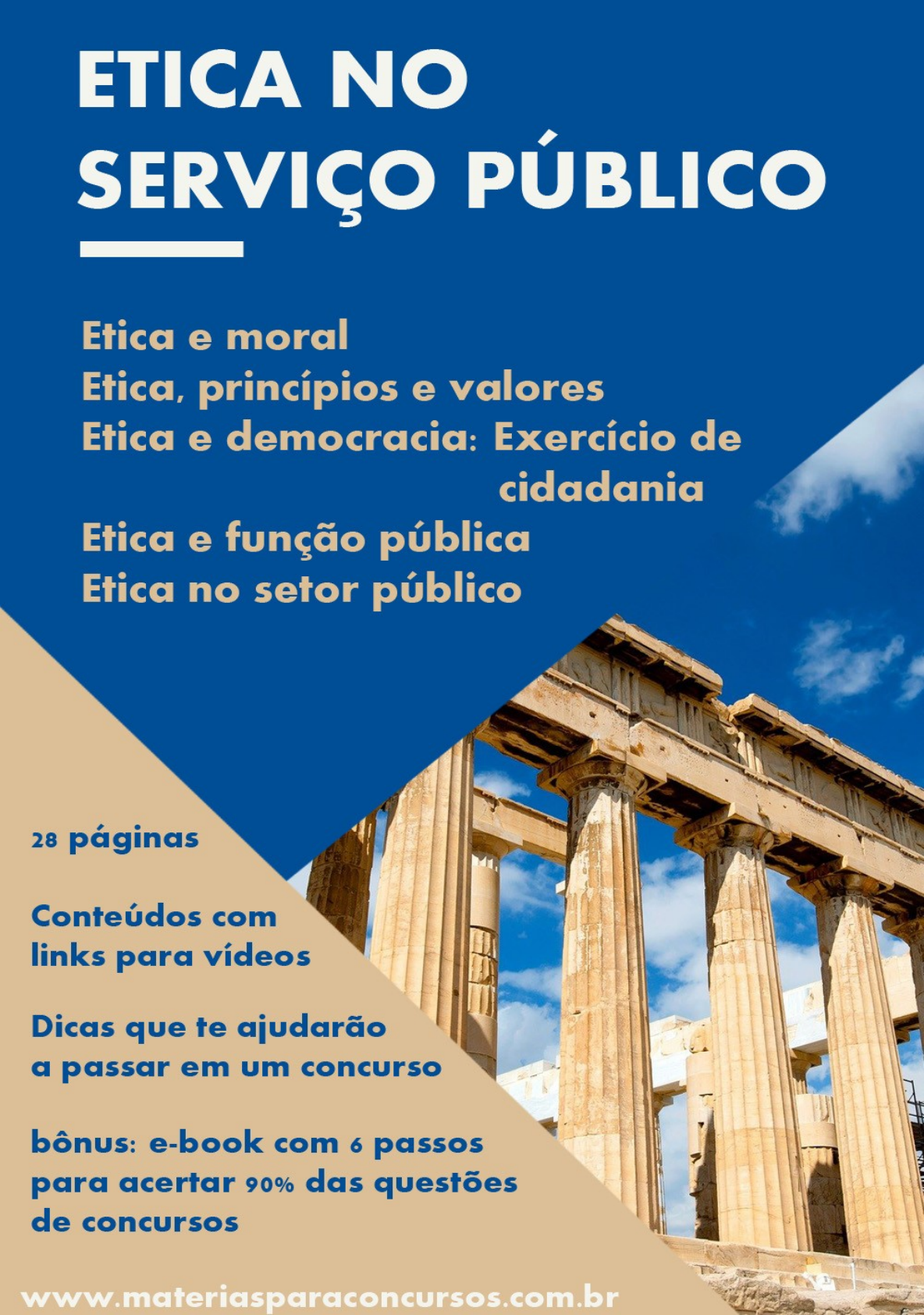 Índice Ética e moral.........................................................................................................................................1 Ética, princípios e valores.....................................................................................................................3 Ética e democracia: exercício da cidadania..........................................................................................6 Ética e função pública..........................................................................................................................9 Ética no Setor Público........................................................................................................................16 QUESTÕES DE CONCURSOS........................................................................................................19 LINKS INTERESSANTES COM DICAS PARA PASSAR EM UM CONCURSO PÚBLICO.......25 Como foi feito este e-book: Fiz uma coletânea de minhas postagens dos blogs e canal do YouTube e organizei em um e-book para facilitar seus estudos. Além da coletânea eu acrescentei conteúdos e questões de concursos. Está comprovado que quanto mais usarmos nossos sentidos para estudar, maior é a retenção de informações, por isso, em todos os conteúdos eu coloquei um link para vídeos em que eu leio o texto. No final do e-book coloquei alguns links com dicas que vão te ajudar a passar em um concurso público. Para finalizar coloquei mais um bônus que é um e-book gratuito com dicas para você acertar 90% das questões de concursos: LINK PARA DOWNLOAD: E-book gratuito: 6-passos-para-voce-acertar-90-das-questoes-de- concursos/ Bons estudos e torcerei para que este e-book seja um grande material de apoio e ajude você a passar em um concurso público. Ética e moral Ética Pode-se considerar a ética como um tipo de postura e o que se refere a um modo de ser, à natureza da ação humana. Caso preferir, no vídeo abaixo tem esta postagem em áudio e vídeo https://youtu.be/1iMF1jL7WD0 Trata-se de uma maneira de lidar com as situações da vida e do modo como estabelecemos relações com outra pessoa. Uma conduta ética pode ser um tipo de comportamento mediado por princípios e valores morais. A palavra “ética” também pode ser definida como um conjunto de conhecimentos extraídos da investigação do comportamento humano na tentativa de explicar as regras morais de forma racional e fundamentada. Nesse sentido, trata-se de uma reflexão sobre a moral, podendo-se afirmar que a ética é a parte da filosofia que estuda a moral, pois reflete e questiona sobre as regras morais. A ética é subjetiva e teórica A ética é uma reflexão da moralidade 1 Moral A moral pode ser definida como o conjunto de regras aplicado no cotidiano e que é utilizado constantemente por cidadão. Tais regras orientam cada indivíduo que vive na sociedade, norteando seus julgamentos sobre o que é certo ou errado, moral ou imoral, e suas ações. Assim sendo, a moral é fruto do padrão cultural vigente e reúne as regras tidas como necessárias para a boa convivência entre os membros pertencentes a uma determinada sociedade. (Pode variar de uma sociedade para outra) A moral é constituída pelos valores (regras) previamente estabelecidos pela própria sociedade e os comportamentos socialmente aceitos e passíveis de serem questionados pela ética. Pode-se afirmar que, ao falarmos de moral, os julgamentos de certo ou errado dependerão do lugar onde se está. Estes valores orientam as pessoas a agirem e julgarem o que é moral ou imoral, certo ou errado e bom ou mau. A moral é objetiva e prática Diferença entre ética e moral A ÉTICA e MORAL abrangem diferentes significados. A ÉTICA está associada ao estudo fundamentado dos valores morais que orientam o comportamento humano social. Por outro lado, a MORAL está associada aos costumes, regras, tabus e convenções estabelecidas pela sociedade. No sentido prático, as finalidades da Ética e da Moral são muito semelhantes; são ambas responsáveis pela construção das bases que vão guiar a conduta humana, determinando o caráter, altruísmo e virtudes, para ensinar a melhor forma de agir e se comportar adequadamente em uma sociedade. O agir ético reconhece a si mesmo como um agir, em princípio, não natural, mas que, desejado, se naturalizaria por meio do hábito e do costume, ou seja, ser ético não é natural por que a ética é subjetiva, porém através da moral que foca os costumes e tradições pode fazer com que a ética seja mais natural. 2 Exemplo prático: Um indivíduo em situação de miséria que encontrar, caída na rua, uma carteira e decidir utilizar o cartão de crédito nela guardado para adquirir medicamentos ao seu filho terá agido de acordo com princípios morais (finalidade maior/variável por indivíduo) e contra as normas éticas (sempre as mesmas, independentemente da situação). Ética, princípios e valores Para entendermos os princípios e valores éticos é necessário entender o que é ética. Ética é um grupo de princípios básicos que pretende regular a conduta e modo de agir de um grupo social. Se preferir, no vídeo abaixo tem a postagem em áudio e vídeo: https://youtu.be/B5r_9hiKsnM De uma maneira mais simples, a ética estuda os costumes das pessoas em sociedade, criando princípios e valores para guiar as pessoas a terem atitudes corretas e dentro da lei, que não interfira no direito de outras pessoas. Hoje várias classes utilizam a palavra ética para indicar os valores de seu grupo social, como a ética médica, ética publica ou mesmo a ética de uma empresa. 3 A Ética é um conjunto de valores morais e princípios que norteiam as ações humanas na sociedade e seus grupos. A ética relaciona a realidade humana ao comportamento do indivíduo com bases históricas e sociais para o bem comum da sociedade, ou seja, ela concerne a uma realidade humana construída 