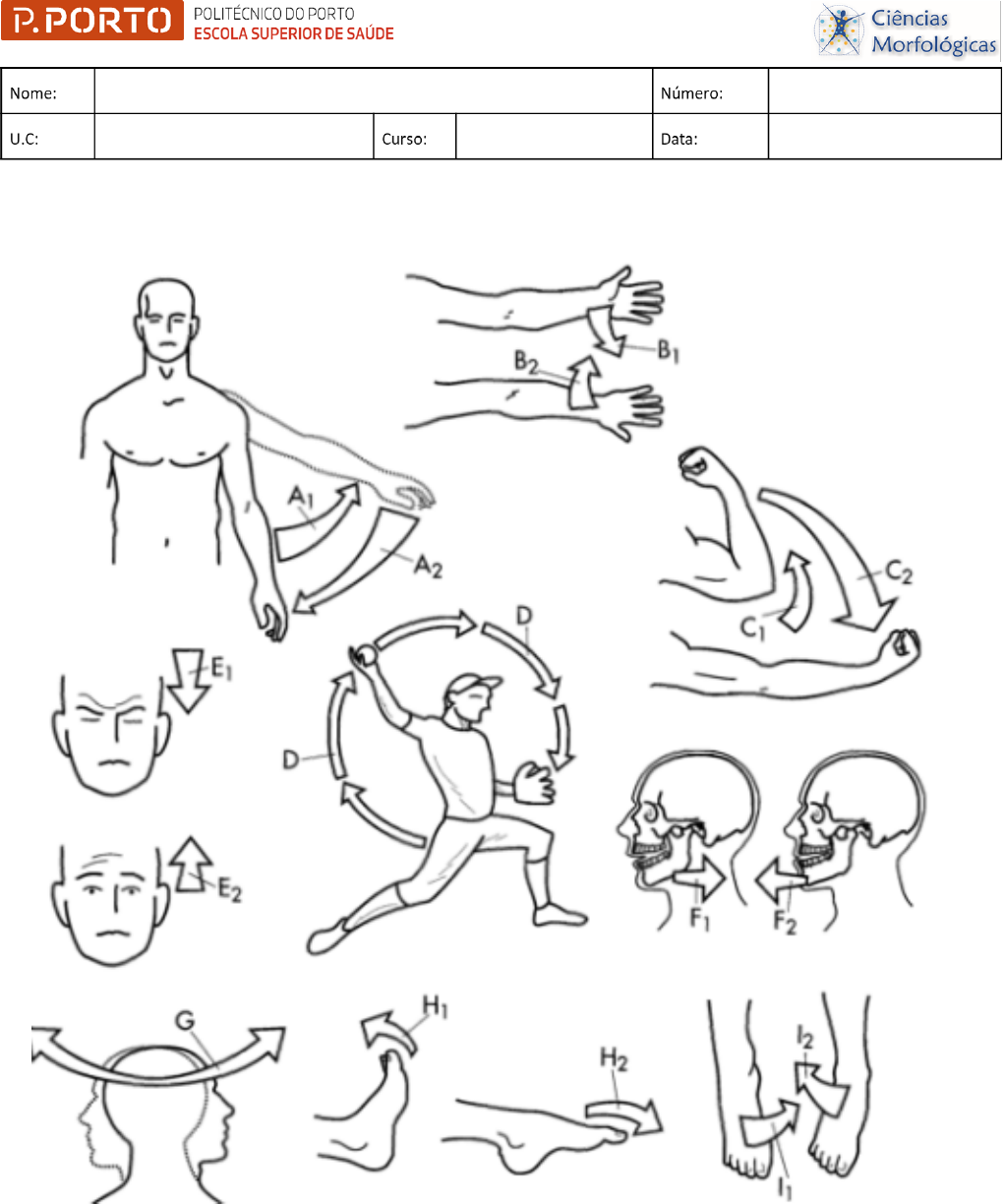 1. Faz a legenda dos seguintes movimentos articulares: 2. Classifica estruturalmente as seguintes articulações como Fibrosa, Cartilaginosa, Sinovial: 3. Identifica as seguintes articulações sinoviais: 4. Faz corresponder os termos com a afirmação correta: 5. Faz a legenda da seguinte articulação sinovial: