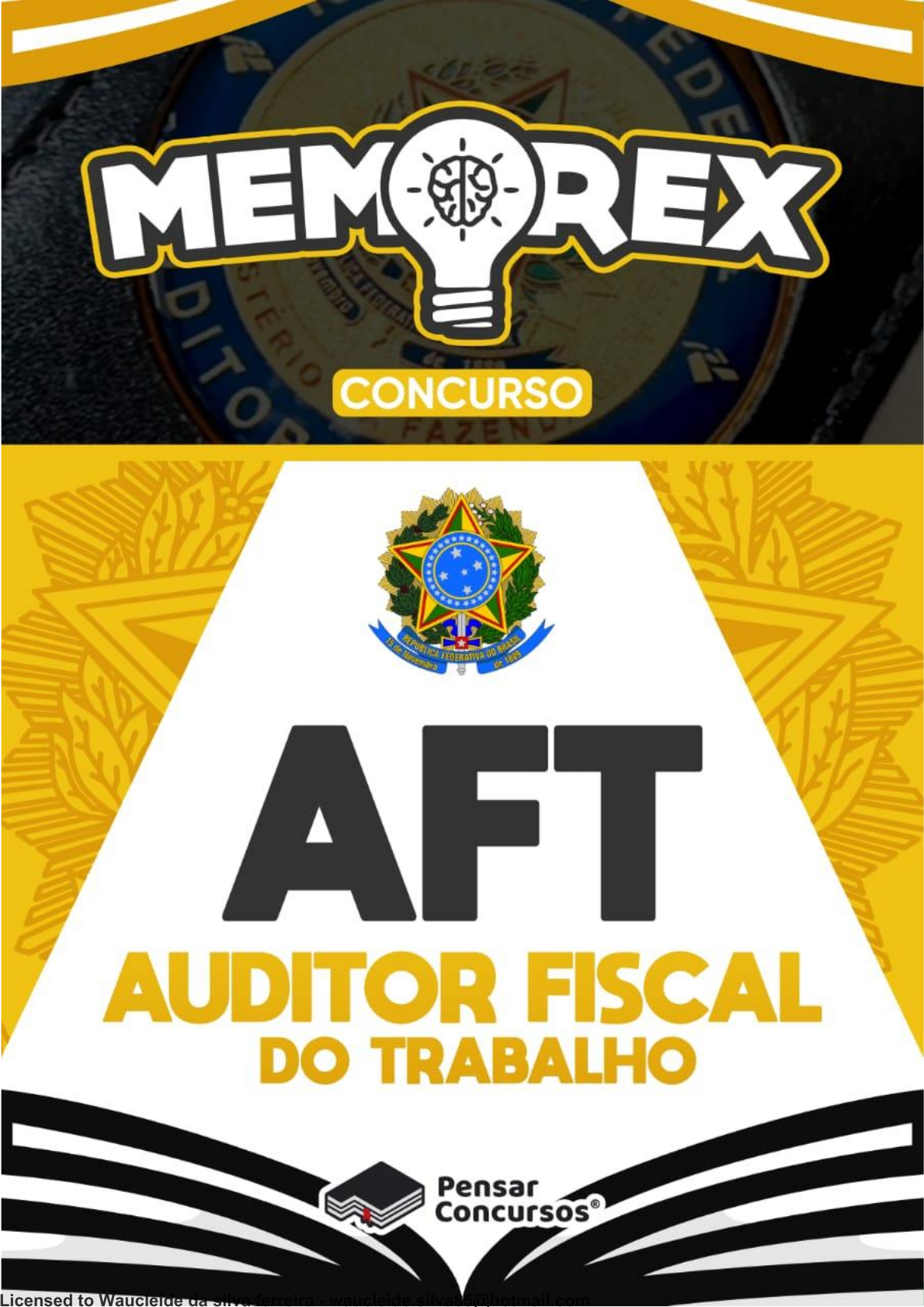 MEMOREX AFT – RODADA 03 Todos os direitos reservados. Proibida cópia, plágio ou comercialização. Pensar Concursos. 1 Licensed to Waucleide da silva ferreira - waucleide.silva85@hotmail.com MEMOREX AFT – RODADA 03 Todos os direitos reservados. Proibida cópia, plágio ou comercialização. Pensar Concursos. 2 Parabéns por ter dado esse passo importante na sua preparação, meu amigo (a). Temos TOTAL certeza de que este material vai te fazer ganhar muitas questões e garantir a sua aprovação. Você está tendo acesso agora à Rodada 03. As outras 03 rodadas serão disponibilizadas na sua área de membros conforme o cronograma abaixo: Material Data Rodada 01 Disponível imediatamente Rodada 02 Disponível imediatamente Rodada 03 Disponível imediatamente Rodada 04 15/11/2023 Rodada 05 22/11/2023 Rodada 06 29/11/2023 Convém mencionar que todos que adquirirem o material completo irão receber TODAS AS RODADAS já disponíveis, independente da data de compra. Nesse material focamos também nos temas mais simples e com mais DECOREBA, pois, muitas vezes, os deixamos de lado e isso pode, infelizmente, custar inúmeras posições no resultado final. Lembre-se: uma boa revisão é o segredo da APROVAÇÃO. Portanto, utilize o nosso material com todo o seu esforço, estudando e aprofundando cada uma das dicas. Se houver qualquer dúvida, você pode entrar em contato conosco enviando suas dúvidas para: atendimento@pensarconcursos.com Licensed to Waucleide da silva ferreira - waucleide.silva85@hotmail.com MEMOREX AFT – RODADA 03 Todos os direitos reservados. Proibida cópia, plágio ou comercialização. Pensar Concursos. 3 ÍNDICE LÍNGUA PORTUGUESA ..................................................................................................... 4 DIREITOS HUMANOS ...................................................................................................... 15 RACIOCÍNIO LÓGICO ..................................................................................................... 22 ADMINISTRAÇÃO GERAL E PÚBLICA .................................................................... 27 NOÇÕES DE INFORMÁTICA ......................................................................................... 32 DIREITO CONSTITUCIONAL ....................................................................................... 37 AUDITORIA .......................................................................................................................... 46 ECONOMIA DO TRABALHO .......................................................................................... 50 DIREITO DO TRABALHO ............................................................................................... 56 SEGURIDADE SOCIAL ..................................................................................................... 68 LEGISLAÇÃO PREVIDENCIÁRIA ............................................................................... 72 SEGURANÇA E SAÚDE NO TRABALHO ................................................................... 76 LEGISLAÇÃO NO TRABALHO ...................................................................................... 85 CONTABILIDADE GERAL ............................................................................................... 88 DIREITO ADMINISTRATIVO ....................................................................................... 91 Licensed to Waucleide da silva ferreira - waucleide.silva85@hotmail.com MEMOREX AFT – RODADA 03 Todos os direitos reservados. Proibida cópia, plágio ou comercialização. Pensar Concursos. 4 LÍNGUA PORTUGUESA DICA 01 EMPREGO DA ACENTUAÇÃO GRÁFICA - PAROXÍTONAS Acentuam-se as paroxítonas terminadas em um e un(s): Ex.: álbum e fórum. Acentuam-se as paroxítonas terminadas em r: Ex.: açúcar e caráter. Acentuam-se as paroxítonas terminadas em x: Ex.: tórax e látex. Acentuam-se as paroxítonas terminadas em n: Ex.: abdômen e hífen. Acentuam-se as paroxítonas terminadas em l: Ex.: amável e fácil. Acentuam-se as paroxítonas terminadas em ão(s): Ex.: órgãos e órfão. Acentuam-se as paroxítonas terminadas em ps: Ex.: bíceps. Acentuam-se as paroxítonas que terminam em ditongos: Ex.: memória e Ásia. CUIDADO: Por exemplo: pólen leva acento, mas o plural “polens” não possui acento! ATENÇÃO!! Os ditongos abertos (“ei”, “oi”) das paroxítonas não devem ser acentuados. Ex.: ideia, joia, paranoia e assembleia. TOME NOTA: A palavra “herói”, por exemplo, continua sendo acentuada. Embora possua ditongo aberto “ói”, ela é oxítona, não é paroxítona. Licensed to Waucleide da silva ferreira - waucleide.silva85@hotmail.com MEMOREX AFT – RODADA 03 Todos os direitos reservados. Proibida cópia, plágio ou comercialização. Pensar Concursos. 5 DICA 02 EMPREGO DA ACENTUAÇÃO GRÁFICA - OXÍTONAS E PROPAROXÍTONAS Acentuam-se as oxítonas terminadas em a(s): Ex.: Pará e maracujás. Acentuam-se as oxítonas terminadas em e(s): Ex.: café e até. Acentuam-se as oxítonas terminadas em o(s): Ex.: vovô e avós. Acentuam-se as oxítonas terminadas em em e en(s): Ex.: armazém e parabéns. Todas as palavras proparoxítonas são acentuadas! Ex.: médico, lâmpada e público. QUESTÃO. A alternativa em que a acentuação de todas as palavras se justifica pela mesma regra é: A) ausência, indivíduo, país. B) vivência, más, família. C) potável, contrário, água. D) análoga, prática, público. Gabarito: D. CERTA, são proparoxítonas e TODAS as proparoxítonas são acentuadas. DICA 03 ENCONTROS VOCÁLICOS Ocorre quando existe um encontro de vogais em uma palavra. São classificados em: hiato, ditongo e tritongo. Hiato: caracteriza-se por ser o encontro de 2 vogais, mas elas estão separadas, cada uma em uma sílaba. Exemplo: Saúde (Sa-ú-de). Ditongo: caracteriza-se pelo encontro de 2 vogais que estão na mesma sílaba, mas uma delas é uma semivogal. Exemplo: Glória (Gló-ria) Tritongo: 