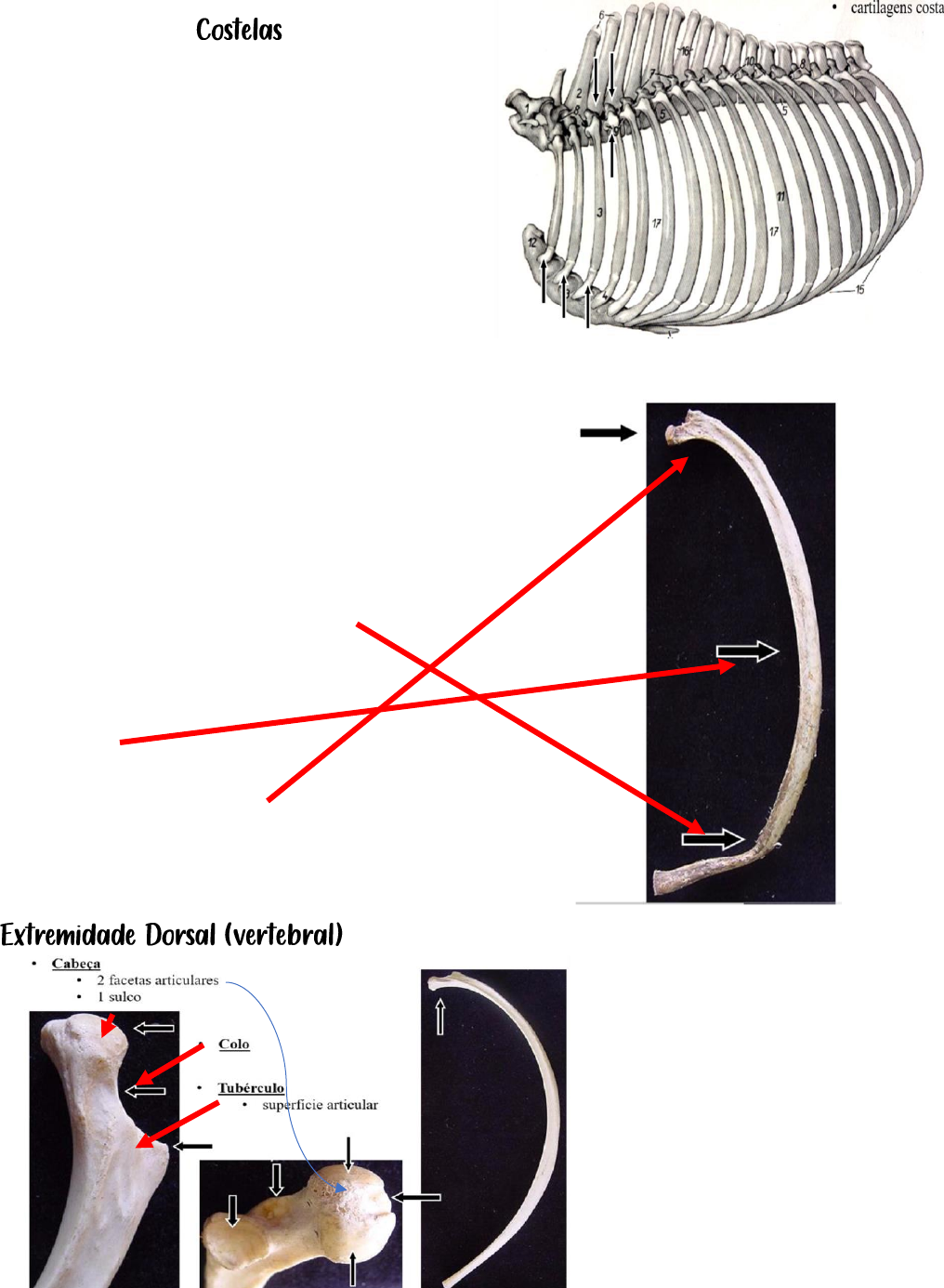 Aula 3 (pt. II) – Anatomia I Costelas e Esterno Formam as partes laterais do tórax * Espaços intercostais * Articulação - Dorsal: 2 vértebras -Ventral: cartilagens costais - Ossos alongados - Pares - Parte óssea - Cartilagem costal ventral - Extremidade dorsal (vertebral) - Corpo - Facetas articulares - Extremidade ventral (esternal) * Cartilagem costal - Articula com o esterno Costelas esternais (verdadeiras) *Articula com a cartilagem adjacente - Arco costal Costelas asternais (falsas) - Costelas esternais ou verdadeiras (8) - Costelas asternais ou falsas (10) -> Arco costal Flutuantes - Carnívoros - Homem - AVES = as aves tem de 2 a 3 cost. Flutuantes no início Mesmo número de vértebras torácicas e costelas - Relação entre costelas esternais: asternais - Carnívoros →9:4 - Suínos →7:7(8) - Ruminantes →8:5 - Equinos →8:10 Assoalho ósseo do tórax - Fixação para as CARTILAGENS COSTAIS - Ancora os músculos peitorais - Divisão -Manúbrio* -Corpo -Processo xifoide - Formação - Ossos individuais → ESTERNÉBRAS: Unidas por cartilagem - Forma de quilha ou canoa - Formado de 6-8 esternébras - CARNÍVOROS Longo e fino * ESTERNÉBRAS variam em número conforme a espécie Manúbrio (pré–esterno) - Porção mais cranial - Equinos Cartilagem cariniforme ESTERNO - Ruminantes e suínos Pouco desenv. ou inexiste Corpo (mesoesterno) - Face dorsal Côncava → triângulo - Face ventral Crista esternal (equi) - RuminantesAchatado dorso-ventral Xifoide (metaesterno) - Porção mais caudal Equi e rumi → larga / Outros →estreita - Entre os arcos costais Sem cartilagem do manúbrio - Sem crista esternal - Cartilagem xifoide larga - Esterno é achatado