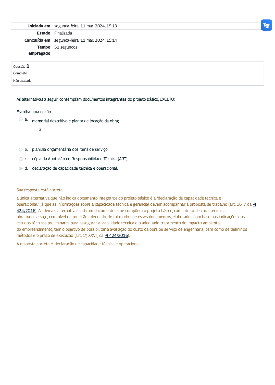 Iniciado em segunda-feira, 11 mar. 2024, 15:13 Estado Finalizada Concluída em segunda-feira, 11 mar. 2024, 15:14 Tempo empregado 51 segundos Questão 1 Completo Não avaliada As alternativas a seguir contemplam documentos integrantes do projeto básico, EXCETO: Escolha uma opção: a. memorial descritivo e planta de locação da obra; 3. b. planilha orçamentária dos itens de serviço; c. cópia da Anotação de Responsabilidade Técnica (ART); d. declaração de capacidade técnica e operacional. Sua resposta está correta. a única alternativa que não indica documento integrante do projeto básico é a "declaração de capacidade técnica e operacional.”, já que as informações sobre a capacidade técnica e gerencial devem acompanhar a proposta de trabalho (art. 16, V, da PI 424/2016). As demais alternativas indicam documentos que compõem o projeto básico, com intuito de caracterizar a obra ou o serviço, com nível de precisão adequado, de tal modo que esses documentos, elaborados com base nas indicações dos estudos técnicos preliminares para assegurar a viabilidade técnica e o adequado tratamento do impacto ambiental do empreendimento, tem o objetivo de possibilitar a avaliação do custo da obra ou serviço de engenharia, bem como de de�nir os métodos e o prazo de execução (art. 1º, XXVII, da PI 424/2016). A resposta correta é: declaração de capacidade técnica e operacional. http://www.planalto.gov.br/ccivil_03/Portaria/prt-424-16-m.planejamento.htm http://www.planalto.gov.br/ccivil_03/Portaria/prt-424-16-m.planejamento.htm http://www.planalto.gov.br/ccivil_03/Portaria/prt-424-16-m.planejamento.htm Questão 2 Completo Não avaliada Questão 3 Completo Não avaliada Sobre a importância do correto detalhamento do objeto proposto na TVU, assinale a alternativa CORRETA: Escolha uma opção: a. o termo de referência é o conjunto de elementos por meio do qual o proponente deve caracterizar a obra, instalação ou serviço de engenharia, demonstrando a viabilidade técnica, os custos envolvidos, as etapas e os prazos de execução; b. os estudos técnicos preliminares têm o objetivo de identi�car necessidades, estimar os recursos necessários e escolher a alternativa de solução mais viável, sob os aspectos técnico, ambiental e socioeconômico; c. o projeto básico se destina a disciplinar e orientar a execução da obra ou do serviço, indicando como a obra ou o serviço deverá ser executado; d. o orçamento de referência deve ser feito a partir da cotação de preços junto a três fornecedores. Sua resposta está correta. a única alternativa correta é a "os estudos técnicos preliminares têm o objetivo de identi�car necessidades, estimar os recursos necessários e escolher a alternativa de solução mais viável, sob os aspectos técnico, ambiental e socioeconômico;”, já que os estudos preliminares visam exatamente a escolha da solução que melhor responda à necessidade identi�cada, do ponto de vista técnico, ambiental e social. As demais alternativas estão erradas, pois: o termo de referência não se destina a caracterizar obra ou serviços de engenharia, mas sim a detalhar o bem/material a ser adquirido ou o serviço comum a ser prestado; o projeto básico não se destina a disciplinar e orientar a execução da obra ou do serviço, esse é o papel do projeto executivo, que detalha o projeto básico para indicar como a obra ou o serviço deverá ser executado; e a cotação direta junto a três fornecedores pode até ser usada, mas nunca como fonte única da pesquisa de preços. A resposta correta é: os estudos técnicos preliminares têm o objetivo de identi�car necessidades, estimar os recursos necessários e escolher a alternativa de solução mais viável, sob os aspectos técnico, ambiental e socioeconômico; O projeto básico ou termo de referência deverão ser apresentados antes da celebração, sendo facultado ao concedente exigi-los depois, desde que antes da liberação da primeira parcela dos recursos. Sobre o projetos que detalham o objeto, relacione as lacunas nas a�rmações da primeira coluna com os termos indicados na segunda coluna: o projeto básico pode ser dispensado no caso de __________ do objeto. a não apresentação do projeto no prazo estipulado leva à ________ do convênio, contrato de repasse ou termo de parceria. o projeto básico ou termo de referência aprovado _________ o plano de trabalho. o projeto básico ou o termo de referência devem conter elementos capazes de propiciar a avaliação do _______ pelo concedente. padronização extinção integrará custo Sua resposta está correta. De acordo com o art. 21 da PI 424/2016, o projeto básico ou o termo de referência pode ser dispensado no caso de padronização do objeto (§ 1º), caso não apresentado no prazo máximo de 18 meses, leva à extinção do instrumento (§§ 2º, 3º e 7º), caso aprovado, integrará o plano de trabalho (§ 4º). Por de�nição, tanto o projeto básico quanto o termo de referência devem conter elementos que propiciem a avaliação do custo pelo concedente (art. 1º, XXVII e XXXIV, da PI 424/2016). A resposta correta é: o projeto básico pode ser dispensado no caso de __________ do objeto. → padronização, a não apresentação do projeto no prazo estipulado leva à ________ do convênio, contrato de repasse ou termo de parceria. → extinção, o projeto básico ou termo de referência aprovado _________ o plano de trabalho. → integrará, o projeto básico ou o termo de referência devem conter elementos capazes de propiciar a avaliação do _______ pelo concedente. → custo. Questão 4 Completo Não avaliada O Município de Porto Dengoso resolveu apresentar propostas para o chamamento público aberto para selecionar projetos de manejo de resíduos sólidos e para a compra de caminhão compactador de lixo, cujo recurso foi alocado por meio de emenda parlamentar. Sobre essas propostas, assinale a alterna