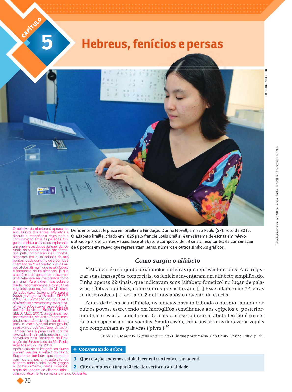 R e p ro d u ç ã o p ro ib id a . A rt . 1 8 4 d o C ó d ig o P e n a l e L e i 9 .6 1 0 d e 1 9 d e f e v e re ir o d e 1 9 9 8 . 70 Como surgiu o alfabeto “Alfabeto é o conjunto de símbolos ou letras que representam sons. Para regis- trar suas transações comerciais, os fenícios inventaram um alfabeto simplificado. Tinha apenas 22 sinais, que indicavam sons (alfabeto fonético) no lugar de pala- vras, sílabas ou ideias, como outros povos faziam. [...] Esse alfabeto de 22 letras se desenvolveu [...] cerca de 2 mil anos após o advento da escrita. Antes de terem seu alfabeto, os fenícios haviam trilhado o mesmo caminho de outros povos, escrevendo em hieróglifos semelhantes aos egípcios e, posterior- mente, em escrita cuneiforme. O mais curioso sobre o alfabeto fenício é ele ser formado apenas por consoantes. Sendo assim, cabia aos leitores deduzir as vogais que compunham as palavras (‘plvrs’).” DUARTE, Marcelo. O guia dos curiosos: língua portuguesa. São Paulo: Panda, 2003. p. 41. Deficiente visual lê placa em braille na Fundação Dorina Nowill, em São Paulo (SP). Foto de 2015. O alfabeto braille, criado em 1825 pelo francês Louis Braille, é um sistema de escrita em relevo, utilizado por deficientes visuais. Esse alfabeto é composto de 63 sinais, resultantes da combinação de 6 pontos em relevo que representam letras, números e outros símbolos gráficos. Conversando sobre 1. Que relação podemos estabelecer entre o texto e a imagem? 2. Cite exemplos da importância da escrita na atualidade. F e r n a n d o F a v o r e t t o 5 CA PÍ TU LO O objetivo da abertura é apresentar aos alunos diferentes alfabetos e discutir a importância deles para a comunicação entre as pessoas. Su- gerimos iniciar a atividade explorando a imagem e os dados da legenda. Os sinais do alfabeto braille são forma- dos pela combinação de 6 pontos, dispostos em duas colunas de três pontos. Cada conjunto de 6 pontos é chamado de “cela braille”. Alguns es- pecialistas afirmam que esse alfabeto é composto de 64 símbolos, já que a ausência de pontos em relevo em uma cela deve ser interpretada como um sinal. Para saber mais sobre o braille, recomendamos a consulta às seguintes publicações do Ministério da Educação: Grafia braille para a língua portuguesa (Brasília: SEESP, 2006) e Formação continuada a distância de professores para o aten- dimento educacional especializado: deficiência visual (Brasília: SEESP, SEED, MEC, 2007), disponíveis, res- pectivamente, em <http://portal.mec. gov.br/seesp/arquivos/pdf/grafiaport. pdf> e <http://portal.mec.gov.br/ seesp/arquivos/pdf/aee_dv.pdf>. Também vale a pena conferir o site <www.braillevirtual.fe.usp.br>, de- senvolvido pela Faculdade de Edu- cação da Universidade de São Paulo. Acessos em 27 jan. 2016. Após a análise da imagem, os alunos podem realizar a leitura do texto. Sugerimos também que comente com os alunos a adaptação do alfabeto fenício feita pelos gregos e, posteriormente, pelos romanos, o que deu origem ao alfabeto latino, utilizado atualmente na maior parte do Ocidente. 070-085-HC1-C05-G.indd 70 3/14/16 3:26 PM R e p ro d u ç ã o p ro ib id a . A rt . 1 8 4 d o C ó d ig o P e n a l e L e i 9 .6 1 0 d e 1 9 d e f e v e re ir o d e 1 9 9 8 . 71 30º N 30º L MAR MEDITERRÂNEO EGITO Hermópolis Mênfis Tebas Rio N ilo M A R V ERM ELH O MAR MORTO Gaza Sídon Tiro Rio Jordão Jerusalém Jericó DESERTO DA ARÁBIA Damasco CALDEIA M ESO PO T M IA SÍRIA Ebla Karkemish Rio Eufrates Rio Tigre Tarso FE N ÍC IA Samaria A Palestina no século X a.C. PENÍNSULA DO SINAI Hebreus Os hebreus, povo nômade semita originário da região da Mesopotâmia, chegaram à Palestina no segundo milênio a.C., provavelmente se deslocando em busca de melhores pastagens para seus rebanhos. A aridez e a carência de recursos naturais do território eram compensadas pela presença do Rio Jordão, que, graças ao uso de técnicas de irrigação, possibilitou o desenvolvimento da agricultura. Uma das principais fontes de pesquisa para a história do povo hebreu é a Torá, que corresponde ao Pentateuco, os cinco primeiros livros do Antigo Testamento da Bíblia: Gênesis, Êxodo, Levítico, Números e Deuteronômio. Segundo o livro do Gênesis, os he- breus, comandados por Abraão, migraram da Mesopotâmia para Canaã (Palestina), a terra que Deus teria prometido a Abraão e a seu povo. Ali, construíram as bases do judaísmo, religião monoteísta que é considerada o berço das duas religiões com o maior número de adeptos atualmente: o cristianismo e o islamismo. O monoteísmo dos hebreus A primeira fase da história política dos hebreus é conhecida como Período dos Patriarcas. Abraão, seu filho Isaac e seu neto Jacó (também chamado Israel) foram os três primeiros patriarcas da história do povo hebreu. Por muitas gerações, os hebreus organizaram-se em clãs patriarcais que se dedicavam à agricultura e à criação de rebanhos. Além de exercer as funções de sacerdotes, juízes e chefes militares, os patriarcas detinham a autoridade política e moral do clã. Ao contrário dos demais povos da Antiguidade, os hebreus eram monoteístas, ou seja, acreditavam em um único Deus, o qual chamavam de Yahweh (Javé) ou Jeová. Segundo a crença judaica, Deus escolheria determinados membros do grupo para comandar os demais e fazer os planos divinos se cumprirem. Abraão, Isaac, Jacó e Moisés seriam alguns desses escolhidos. A sociedade hebraica era patriarcal, formada por famílias numerosas que seguiam com devoção uma das mensagens de Deus: “Crescei e multiplicai-vos”. Muitas vezes, avaliava- -se o valor de uma mulher pelo número de filhos que ela conseguia gerar. A Palestina no século X a.C. Fonte: HILGEMANN, Werner; KINDER, Hermann. Atlas historique: de l’apparition de l’homme sur la terre à l’ère atomique. Paris: Perrin, 1992. p. 32. A partir dos 10 anos de idade, os meninos começavam a ser trein