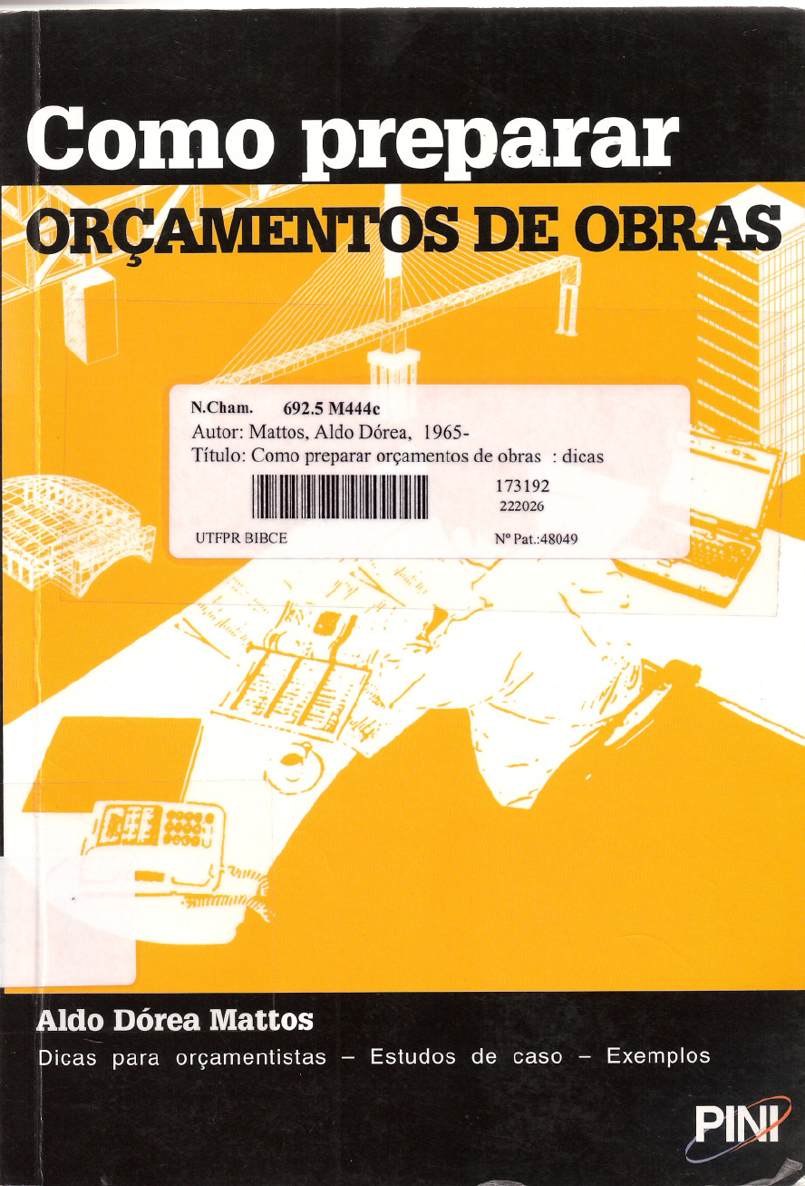 N.Cham. 692.5 M444c Autor: Mattos, Aldo Dórea, 1965- Título: Como preparar orçamentos de obras : dicas 111111111111111111111111111111111111111111111 173192 222026 N" Pat.:48049 .- 'lfUI-g;rw:!I 1Vli:!lDODIGQJ 6170817 COMO PREPARAR ORÇAMENTOS DE OBRAS © Copyright Editora Pini Ltda. Todos os direitos de reprodução reservados pela Editora PINI Ltda. Dados Internacionais de Catalogação na Publicação (CIP) (Câmara Brasileira do Livro, SP, Brasil) Mattos, Aldo Dórea Como preparar orçamentos de obras: dicas para orçamentistas, estudos de caso, exemplos / Aldo Dórea Mattos. -- São Paulo: Editora Pini, 2006 ISBN 85-7266-176-X 06-8918 1. Construção - Custos 3. Orçamento I. Título. 2. Engenharia Civil CDD-692.5 índices para catálogo sistemático: 1. Construção Civil: Orçamento de obras: Tecnologia 692.5 2. Orçamento de obras: Construção civil: Tecnologia 692.5 Coordenação Manuais Técnicos: Josiani Souza Projeto gráfico: Lucas Aires Capa: Lucas Aires Revisão: Luiza Lazzeroni oOfljJJsnflOOIS}JeoOllf!WeJflw'(906t-frPBlJuUflwZJloB61Mpn7 "epOateoqewnanbOpo:mYJdS!eWepeuY4O~N" "A minha mãe, Hortênsia, que me ensinou a fazer conta; A meu pai, Aldo José, que me ensinou a fazer conta de cabeça; A minha esposa, Daniele, que é com quem eu conto." AGRADECIMENTOS Agradeço ao grande amigo Sergio Morta de Lima pelos comentários, sugestões e revisão dos originais. A Celso Ragazzi, pela gentileza do prefácio e pelo apoio constante dentro e fora da PINI. A Gabriel Novais, sempre bem-disposto a ajudar na coleta de dados. A Mário Gordilho, Horácio Brasil, José Conceição, Ricardo Soares, Otacílio Carvalho, Marcos Jorge Almeida Santana, Luiz Edmundo Prado de Campos e Ney Luna Cunha, entre outros, pelas oportunidades de trabalho que me proporcionaram na Engenharia. Aos tantos alunos que tive na UCSal, UEFS, UFBA, Unifacs e nos cursos que ministrei pelo Brasil afora. À equipe da PINI que colaborou para este livro ir para o prelo. E aos queridos colegas Jin Tien Quin, Antônio Luiz Souza, Yasuhiro Matuoka, Luiz Roberto Chagas, Marcos Antônio Meio e LuizAníbal de Oliveira Santos, que me mostraram na prática que Engenharia se faz abrindo livros. Prefácio o Eng. Aldo Dórea Mattos reúne, com a publicação desta obra, uma série de informações e importantes conceitos sobre engenharia de custos aplicados à construção civil, indispensáveis para a análise, avaliação, elaboração e definição de orçamentos de obras públicas e privadas. O livro é completo. Apresenta ilustrações, modelos de planilhas e formulários, tabelas práticas e exemplos de cálculo que possibilitam assimilar com facilidade todas as etapas necessárias para a elaboração de orçamentos de obras de construção civil. O autor aborda detalhadamente todos os aspectos envolvidos: desde a análise dos editais de licitação, quantificação dos serviços e critérios de medição e pagamento, composições de preços unitários de serviços e de custo horário de equipamentos, definição dos insumos, custos diretos e indiretos, orçamento de custo e de venda, taxas de Encargos Sociais e de BOI, assim como diversos recursos para aferir a consistência do orçamento final. Tais informações e demais aspectos relacionados à estruturação dos dados são analisados em profundidade, porém, de forma clara e objetiva, possibilitando um produto final de qualidade, preciso e confiável, como poderá ser constatado no decorrer da leitura. Além da reconhecida experiência do autor nas atividades de gerenciamento de obras e construção, o conteúdo do livro foi avaliado por centenas de profissionais de todo o Brasil que participaram dos cursos de Orçamento, Planejamento e Gerenciamento de Obras, ministrados por ele a partir da PINI Desenvolvimento Profissional. Destinados à reciclagem e aperfeiçoamento de profissionais da área, os cursos obtiveram sempre excelentes avaliações quanto à qualidade e compatibilidade do programa apresentado, conhecimento na especialidade e didática na abordagem dos temas. Assim, recomendo aos colegas a leitura do livro Como Preparar Orçamentos de Obras, ao mesmo tempo em que parabenizo o Eng. Aldo Dórea Mattos pela iniciativa de colocar à disposição do meio técnico um instrumento de trabalho indispensável aos estudantes e profissionais da construção civil. Celso Ragazzi Diretor de Engenharia da PINI Serviços de Engenharia e da ConsulTech Consultoria e Tecno/ogia Ltda. índice CAPíTULO 1 - ORÇAMENTAÇÃO ORÇAMENTO E ORÇAMENTAÇÃO 22 ORÇAMENTO NAS EMPRESAS 23 ATRIBUTOS DO ORÇAMENTO 24 Ap roxi mação 24 Especificidade , 25 Tem po ral idad e , , 26 ENFOQUES DO ORÇAMENTO ' ' 26 Do ponto de vista do proprietário 26 Do ponto de vista do construtor 26 ETAPAS DA ORÇAMENTAÇÃO , , 26 Estudo das condicionantes (condições de contorno) .. , 27 Composição de custos ' , 28 Fechamento do orçamento , 30 UTILIDADES DA ORÇAMENTAÇÃO , 32 CAPíTULO 2 - GRAUS DO ORÇAMENTO GRAU DE DETALHE DO ORÇAMENTO 34 ESTIMATIVA DE CUSTOS , 34 CUB 35 índice CUB 37 CUSTO UNITÁRIO PINI DE EDIFICAÇÕES 37 OUTROS íNDICES , ' 38 ORÇAMENTO PRELI MINAR 38 Volume de concreto 39 Peso de armação 39 Área de fôrma 39 ESTIMATIVA DE CUSTOS POR ETAPA DE OBRA 41 ORÇAM ENTO ANALíTiCO 42 CAPíTULO 3 - LEVANTAMENTO DE QUANTIDADES DI M ENSÕES 44 DEMOLI çÃO 45 FÔRMA 45 ARMAÇÃO , 46 TRAÇOS DE ARGAMASSA E CONCRETO 48 ALVENAR IA 50 Área de alvenaria 50 Quantidade de blocos e argamassa de levante 51 PI NTU RA 54 FORMULÁRIOS DE LEVANTAMENTO 55 COBERTU RA 56 CRITÉRIOS DE MEDiÇÃO E PAGAMENTO 57 PERDAS 58 REAPROVEITAM ENTO 59 ESTUDO DE CASO 60 CAPíTULO 4 - COMPOSiÇÃO DE CUSTOS COMPOSiÇÃO DE CUSTOS UNITÁRIOS 62 INTERPRETAÇÃO DA COMPOSiÇÃO DE CUSTOS 66 MONTAGEM DE UMA COMPOSiÇÃO DE CUSTOS 68 íNDICE E PRODUTIVI DADE 70 FONTES DE COMPOSiÇÃO DE CUSTOS UNITÁRIOS 72 FAIXAS DE PRODUTIVIDADE 73 APROPRIAÇÃO DE íND ICES 75 CAPíTULO 5 - CUSTO DA MÃO-DE-OBRA ENCARG