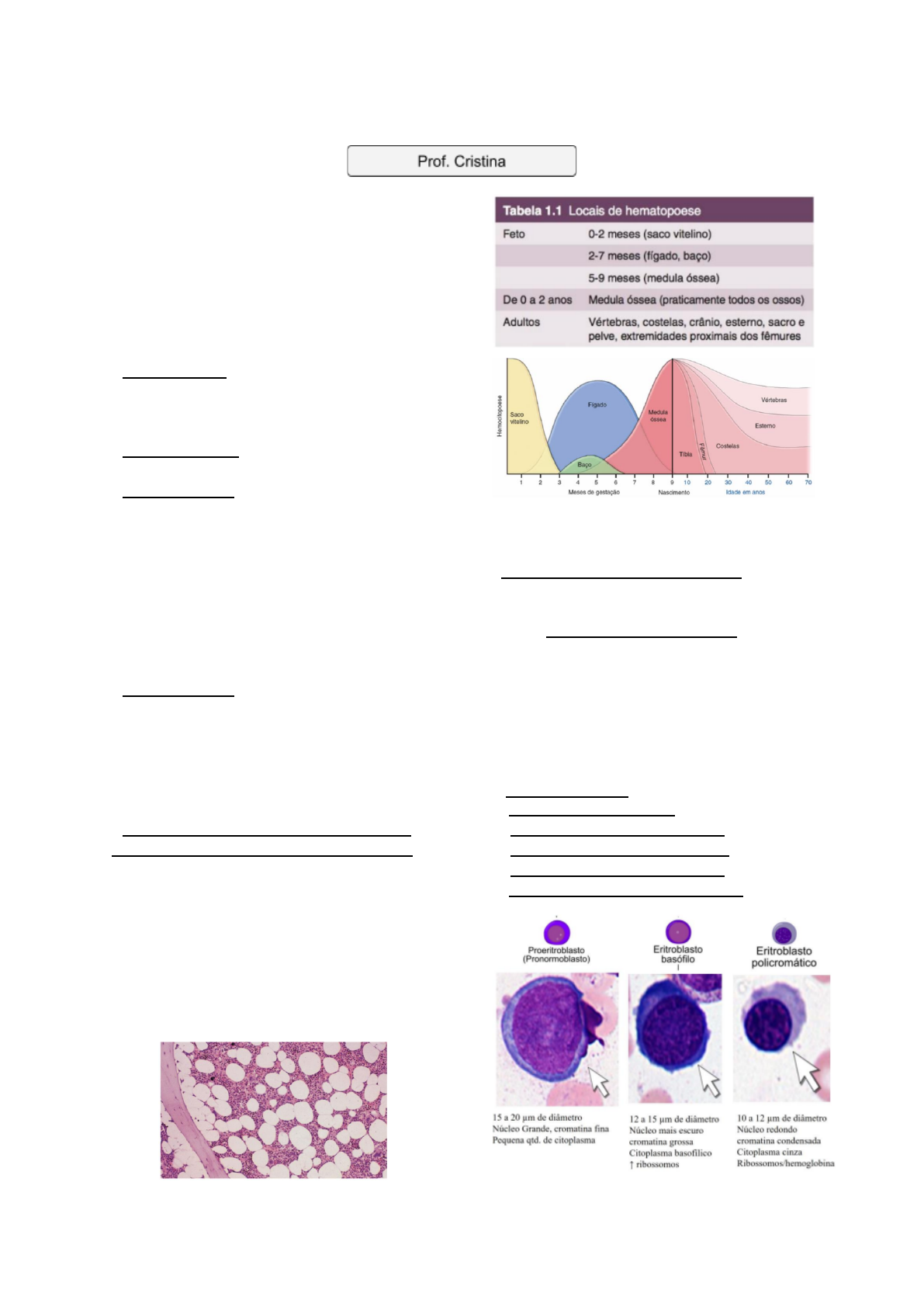 24/05/2022 UNIVERSIDADE NOVE DE JULHO MEDICINA - Fisiopatologia - Anemia Hematopoese - Dá origem às células sanguíneas Onde é feito: FETO: - Saco vitelino → faz hematopoese na fase gestacional até 2 meses de idade - É um local transitório de hematopoese - Fígado e baço → fazem hematopoese de 2 a 7 meses - Medula óssea → fazem hematopoese de 5 a 9 meses - Ou seja, o saco vitelínico começa, depois é feito entre fígado, baço e medula óssea - Ao longo do tempo a maior fonte é na medula óssea FASE INFANTIL: - Medula óssea - de praticamente todos os ossos - Ocorre dos 0 aos 2 anos - Ou seja, na fase infantil tem maior concentração de medula óssea FASE ADULTA: - Vértebras, costelas, crânio, esterno, sacho, pelve, extremidades proximais → têm medula óssea nesses locais - Durante a vida toda OBS! Com o passar do desenvolvimento vai acontecendo a substituição desta medula óssea por tecido gorduroso - Na imagem, 50% do tecido é hematopoiético e 50% é gordura Eritropoiese - Célula tronco hematopoiética - onde as células sanguíneas têm origem - Se diferenciam em: Células tronco mielóide → megacariócitos → eritrócitos precursores → eritrócitos - Processo de diferenciação do eritrócito: - Depois da célula indiferenciada mielóide ele se diferencia em 1- Proeritroblasto: 2- Eritroblasto basófilo 3- Eritroblasto policromático 4- Eritroblasto ortocromático 5- Eritroblasto policromático 6- Eritrócito = glóbulo vermelho 1 24/05/2022 UNIVERSIDADE NOVE DE JULHO MEDICINA - Fisiopatologia - OBS! Proeritroblasto é o maior - A proliferação e diferenciação dessas células são controlados por diferentes tipo de fatores de crescimento hematopoiéticos - Diferenciação, proliferação, apoptose - Esses fatores de crescimentos são importante para estimular ou inibir proliferação celular Eficácia - Para ter uma eritropoiese eficaz é necessário: 1- Eritropoetina (EPO) - quando as células renais percebem a pouca quantidade de O2 essas células liberam EPO - A EPO estimula a medula óssea a produzir mais células - Processo de sinalização eficaz: - Células pré-tubulares do córtex externo percebem a alteração da tensão de O2 e liberam EPO - Essa vai estimular a medula óssea a ter proliferação e diferenciação 2- Fatores essenciais: - É preciso ter oferta adequada de: - Ferro: para síntese de hemoglobina - Folato: síntese de DNA (das purinas) - Vitamina B12: síntese de DNA (das purinas) OBS! É preciso uma medula óssea sadia - Hemácias tem um tempo útil de vida de 120 dias (4 meses na circulação) A partir de uma certa fase não tem mais material genético Eritropoiese - Reticulócitos - são eritrócitos recém lançados na circulação periférica - Se tem muitos algo está errado porque a medula óssea está mandando células jovens para compensar alguma coisa Estrutura da hemácia - As hemácias são bicôncavas - Capacidade de deformidade e elasticidade - pois precisam de flexibilidade - Conseguem isso pelo citoesqueleto e composição da membrana - Formadas pelas espectrinas - que dão possibilidade da hemácia se alongar e sofrer distensão para passar pelo sinusoide - Ou seja, essa variação de formas ajuda a passar pela microcirculação 2 24/05/2022 UNIVERSIDADE NOVE DE JULHO MEDICINA - Fisiopatologia - Eritrograma - A análise de eritrócito é feita pelo eritrograma - Eritrograma - constitui-se pela avaliação de: - Eritrócito (E) - Hemoglobina (Hb) - Hematócrito (Ht) - Índices hematimétricos (VCM, CHCM, RDW) - Avaliação morfológica Processo: - Primeiro é feito o esfregaço sanguíneo - Depois, é escolhido o melhor campo da lâmina - Evita-se um campo de esfregaço espesso, pois as células vão estar acumuladas - Pega-se uma área homogênea para analisar, que normalmente fica no meio OBS! Contagem de reticulócito - medida de avaliação da produção de eritrócitos na medula óssea VCM - Volume c�puscular médio - Saber se a hemácia é microcítica, normocítica ou macrocítica - Saber o volume dela HCM - Hemoglobina C�puscular média - Mede o volume de hemoglobina em um eritrócito - Saber se a hemácia está hipocrômica, normocrômica ou hipercrômica CHCM - Concentração de Hemoglobina C�puscular média - Mede a quantidade de hemoglobinas em vários eritrócitos 3 24/05/2022 UNIVERSIDADE NOVE DE JULHO MEDICINA - Fisiopatologia - Hematocitoscopia - Análise da forma, tamanho, cor, presença de inclusões nas hemácias e presença de células jovens - Algumas são específicas para um determinado tipo de anemia Importantes: - Normocítica - eritrócitos de tamanhos normais - Poiquilocitose - avaliação da forma do eritrócitos - Anisocitose - termo que caracteriza alterações de tamanho - Microcítica - eritrócitos de tamanho diminuído - Macrocítica - eritrócitos de tamanho aumentado - Hipocrômica - eritrócitos pouco corados refletindo baixa concentração de hemoglobina - Hipercrômica - eritrócitos muito corados refletindo alta concentração de hemoglobina Anemia - Uma redução da massa eritrocitária circulante - Total abaixo dos limites normais. - A anemia reduz a capacidade de transporte de oxigênio no sangue, que leva a hipóxia dos tecidos. - Na prática, temos anemias por: - Sinais clínicos: - Palidez cutânea e de mucosa - Fraqueza - Cansaço - Icterícia 4 24/05/2022 UNIVERSIDADE NOVE DE JULHO MEDICINA - Fisiopatologia - Classificações - Conforme a causa e conforme a morfologia Anemia hemolítica - Quando as hemácias sofrem lise - Condições mórbidas causadas por alterações intra-corpusculares ou extra-corpusculares - Leva a diminuição da sobrevida - Acompanham sinais clássicos de hiper-hemólise Elevação dos níveis de eritropoetina: 1- Diminuição da quantidade de hemácias → diminuição de O2 2- Liberação de EPO pelas células renais 3- Estímulo exacerbado de eritropoese Encurtamento do ciclo de vida dos eritrócitos: - Aumento da eritropoese 