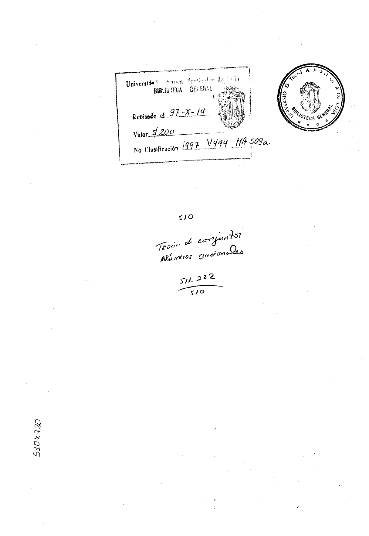 u Univerd ' f;ç.,.l. . 4 gTaA h Re1)&dO e 9:XI4 ij ii vaiorta0, .-.. vvIq ó clasificación Mf s.» oz o o rr. 1 1 P1 UNIVERSIDAD TÉCNICA PARTICULAR DE LOJA UNIVERSIDAD ABIERTA EL CONJUNTO DE LOS NÚMEROS RACIONALES PROPUESTA PARA SU ESTUDIO TESIS DE GRADO-ANEXO AUTOR: ALEJO VERGARA BOLAÑOS ASESORA: INO. DOLORES VIRGINIA ASTUDILLO ORTIZ San Lorenzo- Esmeraldas-Ecuador 1.996 Esta versión digital, ha sido acreditada bajo la licencia Creative Commons 4.0, CC BY-NY- SA: Reconocimiento-No comercial-Compartir igual; la cual permite copiar, distribuir y comunicar públicamente la obra, mientras se reconozca la autoría original, no se utilice con fines comerciales y se permiten obras derivadas, siempre que mantenga la misma licencia al ser divulgada. http://creativecommons.org/licenses/by-nc-sa/4.0/deed.es 2017 http://creativecommons.org/licenses/by-nc-sa/4.0/deed.es 7 f (i d9 a -fe] a AI;j a- IJ4I EL ESTUDIO DE LOS NUMEROS RACIONALES INDICE Pag. ÍNTRODUCCION. VIII MARCO TEQRICO FUNDAMENTOS DESCR/PCION Y ANAUS1S MODULO UNO EL CONJUNTO DE LOS NUMERO 3 RACIONALES.......................... Objetivos de Estudio, Objetivo General, Objetivos Espeolficos, unidadesde Estudio, ..... ................................ . ...... . ...... .... ..... . ......... .10 lera. UN/DAD. FUNDAMENTOS DE LOS NUMERO S RACIONALES 11 Objetivo 01- Temas y Presentación- ............. . ...................................11 12 Lección N°01 Historia de los números.............................................. EjercicioN° 01 ................................................................................ 13 Solucionarloal Ejercicio N°01. ............................ .. ............................ 14 Lección N°02 Origen de los números racionales............................ 15 EjercicioN°02................................................................................ 17 Solucionarlo el Ejercicio N°02........................................................... 17 Lección N°03 Clases de Fracciones.............................................. 18 Definición de una fracción................................................................ 18 Clasificación de fracciones.............................................................. 21 EjercicioN°03............................................................................... 23 Solucionarlo al Ejercicio N°03.......................................................... 24 2da. UNIDAD. - O PERA TI VIDAD PRELIMINAR DE LOS NÚMEROS RACIONALES.................................................................................. 25 Objetivo N902 Temes y Presentación................................................ 25 Lección N°04 La Expresión Mixta................................................... 27 EjercicioN° 04. ................. .............................................................. 28 Solucionarlo al Ejercicio N°04........................................................... 29 Lección N°05 . -Relación de Equivalencia entre Números Racionales yPropiedades................................................................................. 30 Re/ación de Equivalencias................................................................ 30 Propiedades de la Relación de Equivalencia..................................... 31 EjercicioN°05............................................................................... 32 Solucionarlo al Ejercicio N°05........................................................... 32 Lección N°06 Propiedades Generales de las Fracciones.................. 34 EjercicioN°06................................................................................ 37 Solucionarlo al Ejercicio N°06........................................................... 38 Lección NO 07. -Propiedades Particulares de las Fracciones.............. 39 EjercicioN°07................................................................................ 41 Solucionarlo al Ejercicio N°07........................................................... 41 Lección NI' 06. y Simplificación de Fracciones................ 43 EjercicioN°08................................................................................ 43 Solucionarlo al Ejercicio N°08........................................................... 44 Resumen del Módulo Uno................................................................ 46 Aufoevaluación del Módulo Uno........................................................ 50 Solucionarlo.................................................................................... 54 Comentarios sobre los aciertos.................................................. 56 aibliogra(a. ................ . ......... . ............ . ..... ....................................... 56 MODULO DOS OPERACIONES CON LOS NUMERO 5 RACIONALES Objetivos de Estudio, Objetivo General, Objetivos Específicos, Un/dedos de Estudio...................................................................... 58 3era UNIDAD- SUMA Y RESTA DE NÚMEROS RACIONALES.......... 59 Objetivo 01 Temas y Presentación................................................... 59 Lección N°01 Homogeneidad y heterogeneidad de las fracciones........................................................................................ 61 Lección N°02 Suma y Reste de Fracciones Homogeneas.................. 62 EjercicioN°01................................................................................. 62 Solucionarlo al ejercicio N°01 .................................................. ...... 63 Lección N°03 Sume y Reste de Fracciones Heterogeneas................ 64 Ejercicio N°02................................................................................ 66 Solucionarlo el ejercicio N°02. ............................ .......................... 66 41. UNIDAD- Multiplicación y División de Números Racionales....... 68 Objetivo 02 Temes y Presentación................................................ 68 Lección N°04 Multiplicación