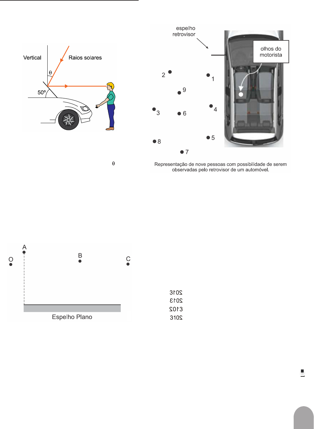 293 VO LU M E 1 VO LU M E 1 C IÊ N CI AS D A N AT U RE ZA e s ua s te cn ol og ia s EXERCÍCIOS DE SALA 1. (FMJ 2020) Um menino observou que os raios da luz solar atingiam seus olhos paralelamente ao solo, plano e horizontal, após refletirem no vidro plano de um automóvel. Sabendo que o raio incidente e o raio refletido esta- vam em um mesmo plano vertical e que a inclinação do vidro do automóvel em relação à horizontal era de 50°, o menino conclui que a inclinação dos raios incidentes no vidro em relação à vertical era de a) 15° b) 30° c) 20° d) 25° e) 10° 2. (G1 - IFSUL 2019) Na figura a seguir, está repre- sentado um espelho plano, onde O é um observador, enquanto A,B e C são objetos pontuais. O observador poderá ver, por reflexão no espelho, o(s) objeto(s) a) A e B. b) B. c) C. d) B e C. 3. (UFJF-PISM 2 2019) Na figura abaixo estão repre- sentadas a lateral esquerda de um carro, com o seu espelho retrovisor plano, e nove pessoas paradas na calçada, correspondentes aos pontos 1 a 9. O espelho retrovisor representado tem a altura do seu centro coincidindo com a altura dos olhos do mo- torista, conforme mostra a figura. Nessa situação, o motorista vê as pessoas: a) 1, 4, 5 b) 1, 5, 7 c) 5, 7, 8 d) 1, 9, 3 e) 1, 6, 7 4. (UERN) Na noite do réveillon de 2013, Lucas estava usando uma camisa com o ano estampado na mesma. Ao visualizá-la através da imagem refletida em um espelho plano, o número do ano em questão observa- do por Lucas se apresentava da seguinte forma a) b) c) d) 5. (UFJF-PISM 2) Uma vela de 20 cm está posicionada próximo a um espelho E plano de 30 cm, conforme indicado na figura. Um observador deverá ser posi- cionado na mesma linha vertical da vela, ou seja, no eixo y, de forma que ele veja uma imagem da vela no espelho. 294 VO LU M E 1 VO LU M E 1 C IÊ N CI AS D A N AT U RE ZA e s ua s te cn ol og ia s Qual o intervalo de y em que o observador pode ser posicionado para que ele possa ver a imagem em toda sua extensão? a) 0 dm ≤ y ≤ 6 dm. b) 3 dm ≤ y ≤ 6 dm. c) 4 dm ≤ y ≤ 7 dm. d) 5 dm ≤ y ≤ 10 dm. e) 6 dm ≤ y ≤ 10 dm. 6. (UNESP) Uma pessoa de 1,8 m de altura está parada diante de um espelho plano apoiado no solo e preso em uma parede vertical. Como o espelho está mal posicionado, a pessoa não consegue ver a imagem de seu corpo inteiro, apesar de o espelho ser maior do que o mínimo necessário para isso. De seu corpo, ela enxerga apenas a imagem da parte compreendida entre seus pés e um detalhe de sua roupa, que está a 1,5 m do chão. Atrás dessa pessoa, há uma parede vertical AB, a 2,5 m do espelho. Sabendo que a distância entre os olhos da pessoa e a imagem da parede AB refletida no espelho é 3,3 m e que seus olhos, o detalhe em sua roupa e seus pés estão sobre uma mesma vertical, calcule a distância d entre a pessoa e o espelho e a menor distância que o espelho deve ser movido verticalmente para cima, de modo que ela possa ver sua imagem refletida por inteiro no espelho. 7. (UNIFESP 2014) Dentro de uma casa uma pessoa observa, por meio de um espelho plano E, uma placa com a inscri- ção VENDO colocada fora da casa, ao lado de uma janela aberta. A janela e o espelho têm as dimensões horizontais mínimas para que o observador consiga ver a placa em toda sua extensão lateral. A figura 1 representa o espelho e a janela vistos de dentro da casa. A figura 2 representa uma visão de cima da placa, do espelho plano E, do observador O e de dois raios de luz emitidos pela placa que atingem, depois de refletidos em E, os olhos do observador. Considerando as medidas indicadas na figura 2, calcule, em metros: a) a largura (L) da janela. b) a largura mínima (x) do espelho E para que o observador possa ver por inteiro a imagem da placa conjugada por ele. 295 VO LU M E 1 VO LU M E 1 C IÊ N CI AS D A N AT U RE ZA e s ua s te cn ol og ia s ESTUDO INDIVIDUALIZADO (E.I.) 1. (Fatec 1995) A figura a seguir mostra um objeto A colocado a 5 m de um espelho plano, e um observador O, colocado a 7 m deste mesmo espelho. Um raio de luz que parte de A e atinge o observador O por reflexão no espelho percorrerá, neste trajeto de A para O a) 9 m b) 12 m c) 15 m d) 18 m e) 21 m 2. (Cesgranrio 1999) Na figura anterior tem-se o perfil de um espelho pla- no E, desenhado sobre um eixo OY. Para que um raio luminoso emitido por uma fonte pontual em A atinja o ponto P, após refletir nesse espelho, ele deve incidir em um ponto do espelho cuja ordenada Y vale: a) 1 b) 1,5 c) 2 d) 2,5 e) 3 3. (Cesgranrio 1992) A imagem da figura a seguir obtida por reflexão no espelho plano E é mais bem representada por: 4. (Uel 1999) A figura representa um espelho plano E vertical e dois segmentos de reta AB e CD perpendi- culares ao espelho. Supondo que um raio de luz parta de A e atinja C por reflexão no espelho, o ponto de incidência do raio de luz no espelho dista de D, em centímetros, a) 48 b) 40 c) 32 d) 24 e) 16 5. (G1 - cps 2004) Dirigindo seu carro na Avenida Paulista, um motorista observa pelo espelho plano retrovisor uma perua com a inscrição AMBULÂNCIA solicitando passagem. O motorista vê por meio do espelho a palavra escrita corretamente. Na perua a palavra AMBULÂNCIA está escrita da seguinte forma: a) b) c) d) e) 6. (Ufrgs 2006) Na figura a seguir estão representa- dos um espelho plano E, perpendicular à página, e um pequeno objeto luminoso S, colocado diante do espelho, no plano da página. Os pontos O1, O2 e O3, também no plano da página, representam as posições ocupadas sucessivamente por um observador. O observador verá a imagem do objeto S fornecida pelo espelho E a) apenas da posição O1. b) apenas da posição O2. c) apenas da posição O3. d) apenas das posições O1 e O2. e) das posições O1, O2 e O3.