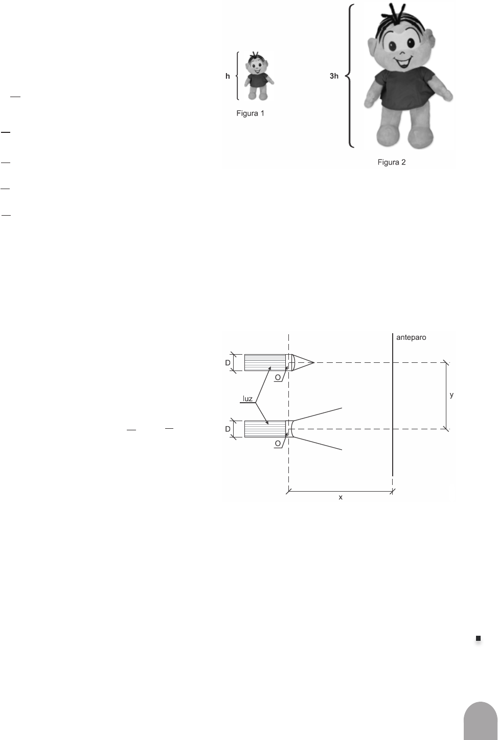 337 VO LU M E 2 C IÊ N CI A S DA N AT U RE ZA e s ua s te cn ol og ia s Considere que o eixo óptico dos dispositivos usa- dos passe pelo ponto de equilíbrio estável do corpo que oscila e que as observações foram realizadas em um meio perfeitamente transparente e homo- gêneo de índice de refração igual a 1. Nessas condições, a razão entre as amplitudes A2 e A1 A2 A1 de oscilação das imagens conjugadas pela lente e pelo espelho é a) 1 8 b) 5 4 c) 3 2 d) 1 2 12. (FUVEST 2019) Três amigos vão acampar e desco- brem que nenhum deles trouxe fósforos. Para acen- der o fogo e fazer o almoço, resolvem improvisar e prendem um pedaço de filme plástico transparente num aro de “cipó”. Colocam um pouco de água so- bre o plástico, formando uma poça de aproximada- mente 14 cm de diâmetro e 1 cm de profundidade máxima, cuja forma pode ser aproximada pela de uma calota esférica. Quando o sol está a pino, para aproveitamento máximo da energia solar, a distân- cia, em cm, entre o centro do filme e a palha seca usada para iniciar o fogo, é, aproximadamente, Note e adote: - Para uma lente plano-convexa, 1 f =(n-1) 1 R sendo n o índice de refração da lente e R o seu raio de curvatura. - Índice de refração da água= 1,33. a) 75 b) 50 c) 25 d) 14 e) 7 13. (FCMMG) A figura 1 mostra a boneca Mônica de altura h a ser colocada em frente a um dispositivo óptico. A figura 2 mostra a imagem desta boneca vista através do dispositivo, com altura 3h. Sobre essa situação, pode-se afirmar que: a) O dispositivo fornece uma imagem real da bo- neca. b) O dispositivo pode ser uma lente divergente ou um espelho convexo. c) A distância da boneca até o dispositivo óptico é três meios de sua distância focal. d) A distância da imagem da boneca até o disposi- tivo é o dobro de sua distância focal. 14. (IME) Conforme a figura acima, duas lanternas muito potentes, cilíndricas, com diâmetro D= 4 cm, es- tão alinhadas no plano vertical. Ambas possuem lentes nas extremidades, cujos centros ópticos O estão alinhados verticalmente e cujas distâncias focais são f=3 cm. Uma das lentes é convergente e a outra é divergente. Suas lâmpadas geram raios de luz horizontais, que encontram as lentes das respectivas lanternas e são projetados até um an- teparo vertical. 338 VO LU M E 2 C IÊ N CI A S DA N AT U RE ZA e s ua s te cn ol og ia s Sabendo que a distância entre os centros ópticos das duas lentes é y= 12 cm, a distância máxima x entre os centros ópticos das lentes O e o anteparo, em centímetros, que faz com que a luz projetada pelas lanternas não se sobreponha é: a) 6 b) 9 c) 12 d) 15 e) 18 15. (ITA 2021) Considere uma lente biconvexa feita de um material com índice de refração 1,2 e raios de curvatura de 5,0 cm e 12,0 cm Ela é imersa den- tro de uma piscina e utilizada para observar um objeto de 80 cm de altura, também submerso, que se encontra afastado a 1,0 m de distância. Sendo o índice de refração da água igual a 1,3, considere as seguintes afirmativas: I. A lente é convergente e a imagem é real. II. A lente é divergente e a imagem é virtual. III. A imagem está a 31 cm da lente e tem 25 cm de altura. Considerando V como verdadeira e F como falsa, as afirmações I, II e III são, respectivamente, a) V F F. b) F V F. c) F F V. d) V V F. e) F V V. 16. (UNESP) A figura adiante mostra um objeto AB, uma lente divergente L e as posições de seus focos, F’ e F. a) Copie esta figura. Em seguida, localize a imagem A’B’ do objeto fornecida pela lente, traçando a trajetória de, pelo menos, dois raios incidentes, provenientes de A. b) A imagem obtida é real ou virtual? Justifique sua resposta. 17. (UEM 2021) Um LED (diodo emissor de luz) está localizado sobre o eixo central de uma lente esfé- rica delgada e simétrica, a 20 cm dela. Essa lente é constituída de um material cujo índice de refra- ção é igual a 1,65 e fornece uma ampliação lateral igual a -0,25. Sobre as características dessa lente e da imagem produzida por ela na situação descrita, assinale o que for correto. 01) A distância entre a imagem formada e o centro ótico da lente é igual a 5,0 cm. 02) A distância focal da lente é igual a 4,0 cm. 04) O raio de curvatura da lente é igual a 5,2 cm. 08) A imagem é invertida. 16) A imagem é virtual. 18. (UEM) Uma luneta astronômica é composta es- sencialmente de duas lentes: a objetiva e a ocular. Sobre as características desse instrumento óptico, assinale o que for correto. 01) A imagem fornecida pela objetiva é real e in- vertida. 02) A imagem fornecida pela objetiva é objeto para a ocular. 04) A imagem fornecida pela ocular é virtual e di- reita. 08) Se a objetiva e a ocular apresentam distâncias focais de 2 m e 5 m, respectivamente, então o aumento visual da luneta em condições nor- mais de observação será igual a 40. 16) A objetiva é convergente, e a ocular é diver- gente. 19. (FAMERP 2019) A figura mostra uma lâmpada retilínea, de comprimento 90 cm fixa horizontal- mente no teto de uma sala, 200 cm acima da su- perfície plana e horizontal de uma mesa. Um disco circular opaco foi colocado horizontalmente entre a lâmpada e a mesa, a 180 cm da lâmpada, sendo esta a maior distância para que ele não projete sombra sobre a mesa. A reta r, mostrada na figura, é vertical e passa pelo ponto médio da lâmpada e pelo centro do disco. 339 VO LU M E 2 C IÊ N CI A S DA N AT U RE ZA e s ua s te cn ol og ia s a) Calcule o diâmetro do disco, em centímetros. b) Considere que o disco seja substituído por uma lente delgada, esférica e convergente, cujo eixo principal coincida com a reta r. Sabendo que essa lente foi colocada em uma posição em que projeta, sobre a superfície da mesa, uma imagem nítida da lâmpada quatro vezes menor que ela, calcule a distância focal da lente, em centímetros. 20. (UFU) Uma luneta astronômica é um equipamen- to que emprega duas lentes dispostas num mesmo eixo de simetria, 