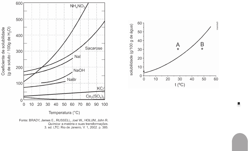 589 VO LU M E 2 C IÊ N CI A S DA N AT U RE ZA e s ua s te cn ol og ia s O conhecimento da solubilidade de sais em água é importante para a realização de atividades em laboratórios e nos procedimentos médicos que en- volvam a utilização desses compostos químicos. A dissolução dessas substâncias químicas em água é influenciada pela temperatura, como mostra o grá- fico que apresenta as curvas de solubilidade do ni- trato de potássio, KNO3(S) do cromato de potássio, K2CrO4(s) do cloreto de sódio, NaCℓ(s) e do sulfato de cério, Ce2(SO4)2(S). A análise do gráfico permite afirmar: a) O processo de dissolução dos sais constituídos pelos metais alcalinos, em água, é endotérmi- co. b) A mistura de 120g de cromato de potássio com 200g de água forma uma solução saturada a 60°C. c) O coeficiente de solubilidade do sulfato de cério aumenta com o aquecimento do sistema aquo- so. d) A solubilidade do nitrato de potássio é maior do que a do cromato de potássio a temperatura de 20°C. e) O nitrato de potássio e o cloreto de sódio apre- sentam o mesmo coeficiente de solubilidade a 40°C. 15. (UCS) Curvas de solubilidade, como as represen- tadas no gráfico abaixo, descrevem como os coe- ficientes de solubilidade de substâncias químicas, em um determinado solvente, variam em função da temperatura. Considerando as informações apresentadas pelo gráfico acima, assinale a alternativa correta. a) Todas as substâncias químicas são sais, com ex- ceção da sacarose. b) O aumento da temperatura de 10°C para 40°C favorece a solubilização do sulfato de cério (III) em água. c) A massa de nitrato de amônio que permanece em solução, quando a temperatura da água é reduzida de 80°C para 40°C, é de aproximada- mente 100g. d) A dissolução do iodeto de sódio em água é en- dotérmica. e) A 0°C todas as substâncias químicas são insolú- veis em água. 16. (UEMA) Um aluno do ensino médio, ao utilizar argumento criativo para classificar uma solução com base em seu coeficiente de solubilidade, apre- sentou a seguinte resposta: “Solução insaturada – limonada com pouco açúcar. Solução saturada – açúcar na medida certa, sente- -se um suco de limão adocicado. Solução supersaturada – uma limonada em que não se sente mais o gosto do limão, só do açúcar”. A professora explicou que o coeficiente de solubi- lidade varia de acordo com o soluto, com a quan- tidade de solvente e com a temperatura em que se encontra a solução, fazendo uso do gráfico abaixo, cuja curva mostra a quantidade máxima de soluto dissolvido para uma dada temperatura. Fonte: Disponível em: <https://br.answers.yahoo.com/ question/index?qid=20090217092126AAVruYV>. Acesso em: 18 set. 2014. Analise o gráfico utilizado pela professora e expli- que, com base no conceito do aluno, as situações representadas pelas soluções A e B Justifique cada situação. 590 VO LU M E 2 C IÊ N CI A S DA N AT U RE ZA e s ua s te cn ol og ia s 17. (UFJF-PISM 2-ADAPTADA) As curvas de solubi- lidade dos sais Li2SO4 e KCℓ estão representadas na figura abaixo. Sobre os dados apresentados, per- gunta-se: No gráfico há os pontos A, B e C, destacados por pontos pretos. Classifique esses pontos em solução saturada ou não saturada e descreva se há ou não corpo de fundo, levando-se em conta a curva de solubilidade do sulfato de lítio. 18. (UNICID - MEDICINA) O gráfico apresenta as so- lubilidades dos sais A, B, C, D, E e F em função da temperatura. a) Indique o sal cuja solubilidade em água é menos afetada pelo aumento de temperatura. b) Considere uma solução preparada com 33g do sal B em 50g de água, a 40°C. A mistura resul- tante apresenta corpo de fundo? Justifique sua resposta. 19. (FAC. SANTA MARCELINA - MEDICIN) Analise o gráfico que representa a solubilidade do CO2 (mas- sa molar 44 g. mol-1) em água à pressão 1 atm. a) A dissolução do gás carbônico em água é um processo endotérmico ou exotérmico? Justifi- que sua resposta. b) Calcule a quantidade de gás carbônico, em mol, dissolvida em 1 litro de água, a 10°C e a 1 atm, saturada com este gás. Apresente os cálculos efetuados. Dados: C=12;O=16. 20. (FCMSCSP) O clorato de potássio (KCℓO3) é um composto termicamente instável. Ao ser aquecido, decompõe-se formando cloreto de potássio sólido (KCℓ) e gás oxigênio (O2). Ao ser misturado com água, o clorato de potássio se dissolve. Sua curva de solubilidade está repre- sentada a seguir. 591 VO LU M E 2 C IÊ N CI A S DA N AT U RE ZA e s ua s te cn ol og ia s a) Escreva a equação da reação de decomposição térmica balanceada do KCℓO3. Apresente o nú- mero de elétrons do cátion potássio. b) Uma solução foi preparada adicionando-se 24 g de KCℓO3 a 100 g de água a 90 °C. Essa solução foi resfriada lentamente e mantida em tempe- ratura controlada, a 30 °C. Em que temperatura iniciou-se a cristalização? Justifique sua res- posta por meio do coeficiente de solubilidade. Calcule a massa de KCℓO3 cristalizada na solu- ção mantida a 30 °C.