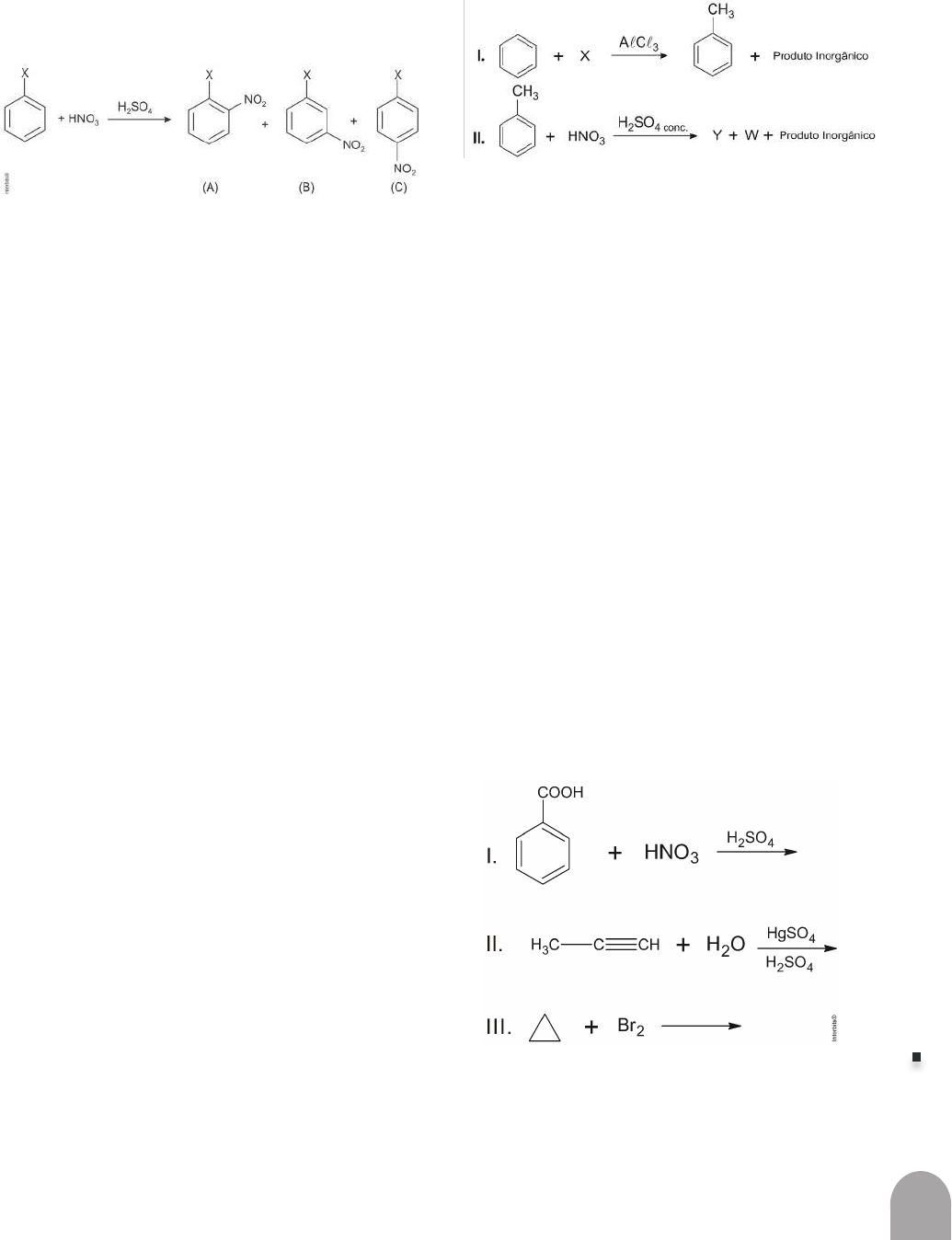 619 VO LU M E 3 C IÊ N CI A S DA N AT U RE ZA e s ua s te cn ol og ia s Considere a mononitração de um composto hipoté- tico de fórmula C6H5X, em presença de ácido sulfú- rico como catalisador. Esta mononitração pode gerar como produtos os compostos A, B e C, cuja reação é representada abaixo: Acerca dessa reação e de seus compostos, são feitas as seguintes afirmativas: I. Trata-se de uma reação de condensação. II. Caso X seja um haleto, os compostos A e C serão os produtos preferencialmente formados na reação. III. Caso X seja o grupo metila (-CH3), o composto B será o produto preferencialmente formado na reação. IV. Caso X seja o grupo nitro (-NO2), o composto B será o produto preferencialmente formado na reação. V. Os compostos A, B e C são isômeros de função. Das afirmativas feitas, estão corretas apenas a) I, II e III. b) I, III e V. c) II, IV e V. d) II e IV. e) III e IV. 10. (Uece) Hidrocarbonetos aromáticos são compostos orgâ- nicos formados exclusivamente por átomos de car- bono e hidrogênio, e apresentam, obrigatoriamente, o núcleo aromático constituído por uma cadeia fechada, ligada por seis átomos de carbono com três ligações duplas alternadas. No hidrocarboneto aro- mático com duas substituições no anel benzênico, a posição relativa dos substituintes pode ser correta- mente indicada por a) aril (ou a), substituintes nas posições 1 e 5. b) orto (ou o), substituintes nas posições 1 e 3. c) meta (ou m), substituintes nas posições 1 e 2. d) para (ou p), substituintes nas posições 1 e 4. 11. (Mackenzie - adaptada)) Durante a síntese química do composto orgânico Z, adotou-se a seguinte rota sintética: Após a realização da síntese, pode-se afirmar que X, Y e W são, a) cloreto de metanoíla, p-nitrotolueno e o-nitroto- lueno. b) cloreto de metila, o-aminotolueno e m-aminoto- lueno c) cloreto de metila, o-aminotolueno e p-aminoto- lueno. d) cloreto de metanoíla, o-nitrotolueno e m-nitroto- lueno. e) cloreto de metila, o-nitrotolueno e p-nitrotolueno. 12. (Fuvest-SP) Fenol (C6H5OH) é encontrado na urina de pessoas expostas a ambientes poluídos por benzeno (C6H6). Na transformação do benzeno em fenol ocorre: a) substituição no anel aromático. b) quebra na cadeia carbônica. c) rearranjo no anel aromático. d) formação de cicloalcano. e) polimerização. 13. (Mackenzie) De acordo com as reações abaixo, que se realizam sob condições adequadas, os produtos orgânicos obtidos em I, II e III, são, respectivamente, a) ácido orto-nitrobenzoico, propan-1-ol e bromo-ci- clopropano b) ácido meta-nitrobenzoico, propanona e 1,3-dibro- mo-propano. 620 VO LU M E 3 C IÊ N CI A S DA N AT U RE ZA e s ua s te cn ol og ia s c) ácido para-nitro-benzoico, propanona e bromo-ci- clopropano. d) ácido meta-aminobenzoico, propan-2-ol e bromo-ci- clopropano. e) ácido meta-aminobenzoico, propanona e 1,3-dibro- mo-propano 14. (Upe) Dissolveu-se 1,0 g de fenol em 1 mL de água, den- tro de um tubo de ensaio. Em seguida, resfriou-se a solução com um banho de gelo. Depois, gota a gota, adicionaram-se 6,0 mL de uma solução gelada de ácido nítrico aquoso (1:1) e transferiu-se a mistura reacional para um erlenmeyer contendo 20,0 mL de água. Os dois produtos isoméricos, de fórmula C6H5NO3, dessa reação foram extraídos com dicloro- metano em um funil de separação e, posteriormente, purificados. Adaptado de IMAMURA, Paulo M.; BAPTISTELLA, Lúcia H. B. Nitração do fenol, um método em escala semimicro para disciplina prática de 4 horas. Quím. Nova, 23, 2, 270-272, 2000. Em relação ao experimento relatado acima, é correto afirmar que a) um dos produtos da reação é um álcool saturado. b) os isômeros produzidos são o o-nitrofenol e p-nitro- fenol. c) os produtos da reação são enantiômeros, contendo anel benzênico. d) dois isômeros geométricos cis-trans são produzidos nessa síntese. e) cada um dos isômeros produzidos possui uma liga- ção amida em sua estrutura. 15. (Ufu) Considere as informações a seguir. Com relação aos benzenos monossubstituídos apre- sentados, as possíveis posições nas quais ocorrerá monocloração em I, II e III são, respectivamente, a) 2 e 4; 2 e 4; 3. b) 3 e 4; 2 e 5; 3. c) 2 e 4; 2 e 5; 4. d) 3 e 4; 2 e 4; 4. 16. Complete as reações a seguir: 17. (Unicamp-SP - adaptada)) Um dos átomos de hidrogênio do anel benzênico pode ser substituído por CH3, OH, Cℓ ou COOH. Escreva as fórmulas e os nomes dos derivados benzê- nicos obtidos por meio dessas substituições. 18. (EEM-SP) Sabendo-se que alguns monoderivados do benzeno dirigem o substituinte principalmente para as posi- ções orto e para, e outros monoderivados do ben- zeno dirigem-no para a posição meta, indique os produtos das seguintes equações de reação: a) tolueno + Br2 → b) nitrobenzeno + Br2 → c) ácido bezeno sulfônico + Cℓ2 → 621 VO LU M E 3 C IÊ N CI A S DA N AT U RE ZA e s ua s te cn ol og ia s 19. Considere a substância orgânica representada pela fórmula estrutural abaixo: a) Quais classes funcionais estão presentes nesta subs- tância. b) Proponha um método para obtê-la a partir do ben- zeno. 20. (FUVEST-SP) A polimerização do acetileno produz um hidrocar- boneto aromático (benzeno), que reage com ácido sulfúrico, fornecendo um ácido. O sal de sódio desse ácido pode ser usado para a produção de fenol. Representar as equações das reações do benzeno com ácido sulfúrico, e o produto dessa reação com NaOH. Gabarito (e.i.) 1. A 2. E 3. C 4. A 5. B 6. C 7. B 8. B 9. D 10. D 11. E 12. A 13. B 14. B 15. A 16. 17.