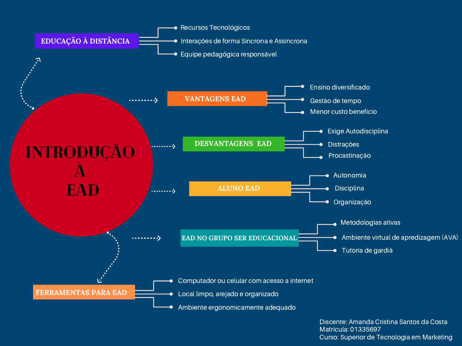 INTRODUÇÃO À EAD Interações de forma Síncrona e Assíncrona Ambiente virtual de apredizagem (AVA) Computador ou celular com acesso a internet Ambiente ergonomicamente adequado FERRAMENTAS PARA EAD Local limpo, arejado e organizado Discente: Amanda Cristina Santos da Costa Matrícula: 01335697 Curso: Superior de Tecnologia em Marketing EDUCAÇÃO À DISTÂNCIA Recursos Tecnológicos Equipe pedagógica responsável ALUNO EAD Autonomia Disciplina Organização VANTAGENS EAD Ensino diversificado Gestão de tempo Menor custo benefício DESVANTAGENS EAD Exige Autodisciplina Distrações EAD NO GRUPO SER EDUCACIONAL Metodologias ativas Tutoria de gardiã Procastinação