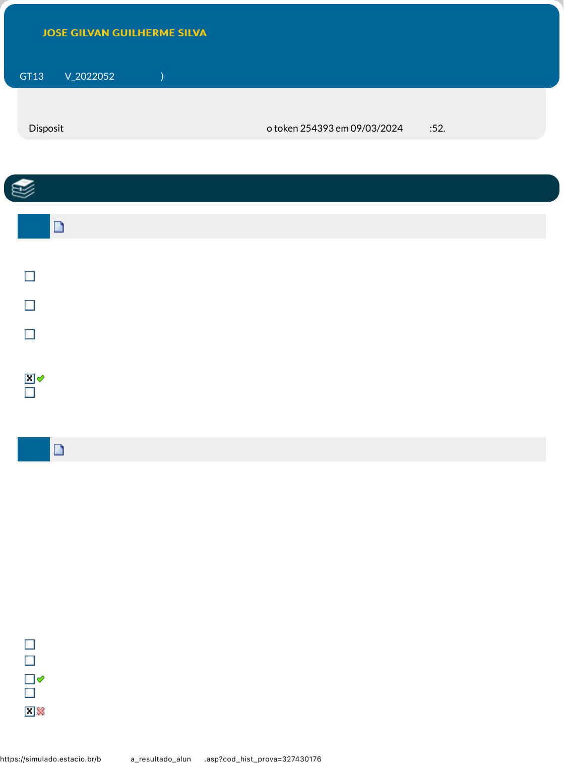 12/03/2024, 08:51EPS Página 1 de 4https://simulado.estacio.br/bdq_prova_resultado_aluno_n.asp?cod_hist_prova=327430176 Disciplina: ARQUITETURA DE SISTEMASARQUITETURA DE SISTEMAS AVAV Aluno: JOSE GILVAN GUILHERME SILVAJOSE GILVAN GUILHERME SILVA 202205236285202205236285 Professor: MAIARA HEIL CANCIANMAIARA HEIL CANCIAN Turma: 90019001 DGT1396_AV_202205236285 (AG) 09/03/2024 09:28:59 (F) Avaliação: 6,006,00 pts Nota SIA: 6,006,00 pts Dispositivo liberado pela Matrícula 202205236285 com o token 254393 em 09/03/2024 09:28:52. ARQUITETURA DE SISTEMASARQUITETURA DE SISTEMAS 1.1. Ref.: 1063276 Pontos: 1,001,00 / 1,001,00 Sobre Componentes de Software, a alternativa INCORRETA é: O conceito de componente de software é definido como uma abstração para construção de sistemas que pode ser adaptada sobre diversos paradigmas diferentes Um componente não é necessariamente uma tecnologia implementada especificamente e nem a aplicação, mas um dispositivo de software que possua uma interface bem definida Componente de software pode ser definido como uma unidade de composição com interfaces bem definidas e dependências de contexto explícitas, além de poder ser independentemente implantado e estar sujeito a composição por terceiros Um componente de software não é um elemento independente, sendo assim não pode ser substituído nenhuma das anteriores 2.2. Ref.: 1055279 Pontos: 0,000,00 / 1,001,00 No contexto de interação entre componentes, considere as seguintes afirmativas: I. A interação de componentes define como cada uma das operações do sistema será alcançada, utilizando a arquitetura de componentes. II. A interação de componentes é o momento em que todos os fatores do sistema são levantados, com uma clara compreensão das dependências entre eles, chegando-se até o nível mais detalhado de operações. III. Usa-se a interação entre os modelos para descobrir as operações nas interfaces de negócios. Quanto mais interações são consideradas, operações e padrões de uso comuns são conseguidos e passam a poder ser reutilizados. Levando-se em conta as afirmações acima, identifique a única alternativa válida. Apenas I e III estão corretas. Apenas II e III estão corretas. I, II e III estão corretas. Apenas I. Apenas I e II estão corretas. javascript:alert('C%C3%B3digo%20da%20quest%C3%A3o:%201063276.'); javascript:alert('C%C3%B3digo%20da%20quest%C3%A3o:%201055279.'); Gilvan Guilherme Gilvan Guilherme Gilvan Guilherme Gilvan Guilherme Gilvan Guilherme 12/03/2024, 08:51EPS Página 2 de 4https://simulado.estacio.br/bdq_prova_resultado_aluno_n.asp?cod_hist_prova=327430176 3.3. Ref.: 965411 Pontos: 0,000,00 / 1,001,00 Na especificação de interface de componentes devemos sempre identificar como os elementos podem utilizar esses componentes. Dentre essas identificações destacamos: I - Como acessá-los, onde definimos na sua assinatura somente o retorno oferecido. II - Quais os atributos que ele manipula. III ¿ Quais as funções disponíveis para uso. I, II e III estão corretas. I, II e III estão incorretas. II e III estão corretas. I e III estão corretas. I e II estão corretas. 4.4. Ref.: 1018166 Pontos: 0,000,00 / 1,001,00 Correlacione à segunda coluna de acordo com a primeira, considerando os quatro grandes grupos do modelo de negócios com os seus respectivos objetivos. ( 1 ) Como ( 2 ) O que ( 3 ) Para Quem ( 4 ) Quanto ( ) Quais os elementos de infraestrutura devem ser utilizados pelo sistema a ser desenvolvido; ( ) Definem os recursos chaves, as atividades chave e os componentes prontos que podem ser utilizados no novo sistema; ( ) Informações sobre criticidade do sistema e quais os benefícios se espera alcançar com o sistema a ser desenvolvido. ( ) Define qual ou quais problemas o sistema deve resolver depois que ficar pronto; A sequência correta correta, de cima para baixo, é: 4 - 1 - 3 - 2 1 - 2 - 4 - 3 4 - 3 - 1 - 2 3 - 1 - 4 - 2 3 - 2 - 4 - 1 javascript:alert('C%C3%B3digo%20da%20quest%C3%A3o:%20965411.'); javascript:alert('C%C3%B3digo%20da%20quest%C3%A3o:%201018166.'); Gilvan Guilherme 12/03/2024, 08:51EPS Página 3 de 4https://simulado.estacio.br/bdq_prova_resultado_aluno_n.asp?cod_hist_prova=327430176 5.5. Ref.: 1018138 Pontos: 1,001,00 / 1,001,00 Em relação à especificação dos componentes: I- Uma das funções do arquiteto de sistemas é garantir o processo de identificação, para que não sejam desenvolvidos componentes desnecessários. II- Se tem um componente que pode ser reutilizado, quanto mais reutilizar mais valor agregado aquele componente terá, gerando melhores resultados para a minha aplicação. III- Para definir quais os componentes já estão prontos e quais deverão ser desenvolvidos, basta realizar somente a identificação das interfaces. Está correto o que se afirma em: III, apenas I e III, apenas II e III, apenas I, II, III I e II, apenas 6.6. Ref.: 3563920 Pontos: 1,001,00 / 1,001,00 O que é gerado pelo ciclo de vida do serviço dentro do artefato de operações de negócios? Funções. Esquemas de Solução. Tarefas de gerenciamento de serviço. Modelos de Administração. Produtos e Tecnologias. 7.7. Ref.: 999639 Pontos: 1,001,00 / 1,001,00 A Arquitetura Orientada a Serviços (SOA) tem algumas características que possibilitam sua definição. Dentre essas características está a de permitir o reuso de seus componentes. não possibilitar a reutilização de seus componentes. não exigir troca de mensagens entre provedores e consumidores de serviços. ter seus componentes fortemente acoplados. ser centralizada em apenas um servidor. 8.8. Ref.: 3564013 Pontos: 1,001,00 / 1,001,00 Durante o processo de especificação de componentes o arquiteto de sistemas é figura fundamental. Das opções a seguir, marque aquela que nãonão representa uma função primordial do Arquiteto neste processo. Definir informações quanto ao escopo do componente. javascript:alert('C%C3%B3digo%20da%20quest%C3%A3o:%201018138.')