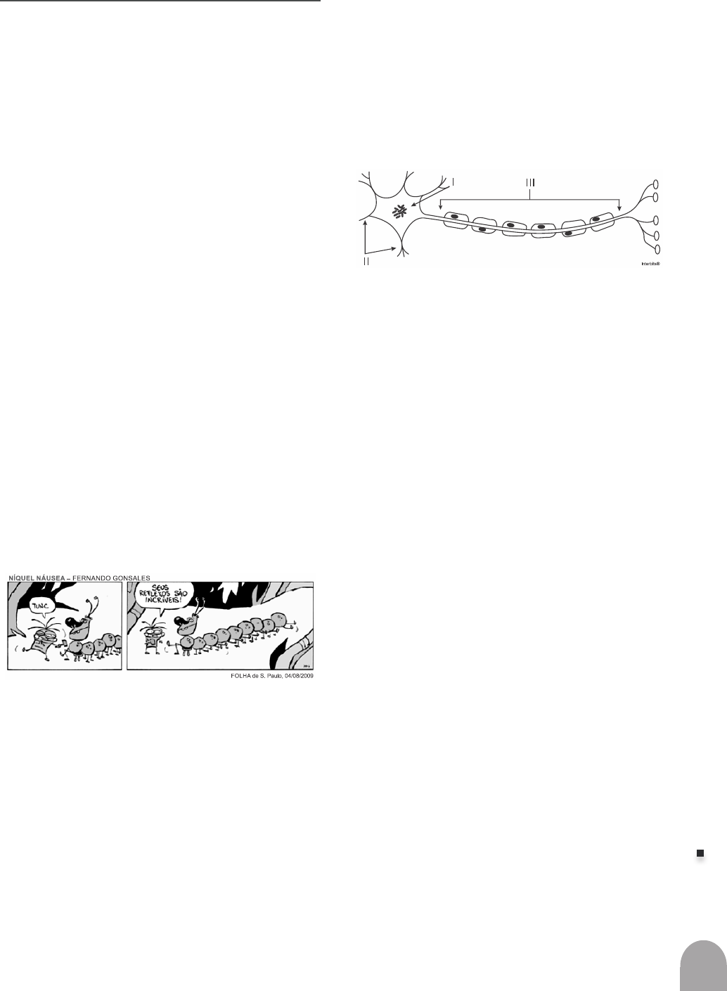 139 VO LU M E 4 C IÊ N CI A S DA N AT U RE ZA e s ua s te cn ol og ia s estudo indiVidualizado (e.i.) 1. (Ifce) As células apresentam formas e estruturas dife- rentes para cada tipo de especialidade celular. Axônio, dendritos e telodendritos são estruturas pertencentes a células do tecido a) muscular. b) epitelial. c) nervoso. d) ósseo. e) adiposo. 2. (Ifsp) Uma garota ganhou de seu namorado um buquê de rosas e sem querer tocou em um “espinho” de uma das flores. Imediatamente, de forma automática, ela recolheu o braço. A respeito dessa reação, pode-se afirmar que a) a medula espinhal, alguns neurônios e músculos foram responsáveis na execução dessa resposta. b) o cérebro, alguns neurônios e músculos foram res- ponsáveis na execução dessa resposta. c) o corpo responde a um estímulo, como o citado, se ocorrer anteriormente uma grande emoção. d) a medula espinhal e o cérebro coordenam simulta- neamente essa resposta de defesa. e) os músculos do braço reagiram involuntariamente independentemente do sistema nervoso. 3. (Pucsp) O que é mostrado na tira, de forma espirituosa, é conhecido em humanos por reflexo patelar, sendo testado por um médico ao bater com um martelo no joelho de uma pessoa. Este reflexo envolve a) um neurônio sensitivo que leva o impulso até a medula espinhal, onde se conecta com um neurônio motor, que conduz o impulso até o órgão efetuador. b) vários neurônios sensitivos, que levam o impulso até a medula espinhal, onde fazem conexão com inúmeros neurônios, que levam o impulso até o órgão efetuador. c) um neurônio sensitivo, que leva o impulso até o lobo frontal do cérebro, onde faz conexão com um neurônio motor, que conduz o impulso até o órgão efetuador. d) um neurônio sensitivo, vários neurônios medulares e um neurônio motor localizado no lobo frontal do cérebro. e) vários neurônios sensitivos localizados na medula espinhal, onde se conectam com neurônios motores, que levam o impulso nervoso ao cérebro e, poste- riormente, até o órgão efetuador. 4. (Cftmg) A questão refere-se ao neurônio a seguir. A sequência que apresenta o sentido correto de pro- pagação do impulso nervoso em um neurônio é a) I II III→ → b) I III II→ → c) II I III→ → d) III II I→ → 5. (Uece) Na cadeia de propagação do impulso nervoso, na ordem de passagem do impulso pelo neurônio, podemos afirmar corretamente que o corpo celular é a estrutura neuronal que o recebe a) por último, passando-o para um novo neurônio. b) intermediariamente, passando-o para o dendrito. c) primeiro, passando-o para o axônio. d) intermediariamente, passando-o para o axônio. 6. (Mackenzie 2023) Leia o texto abaixo: “A memória é dividida de duas grandes formas: explícita e implícita. O hipocampo é necessário para a formação das memórias explícitas, ao passo que várias outras regiões do cérebro, incluindo o estriado, a amígdala e o núcleo accumbens, estão envolvidos na formação das memórias implícitas. A formação de todas as memórias requer alterações morfológicas nas sinapses: novas sinapses devem ser formadas ou antigas precisam ser fortalecidas. Considera-se que essas alterações reflitam a base celular subjacente das memórias persistentes.” LOMBROSO, PAULO. Braz. J. Psychiatry 26 (3). Set 2004 Com relação às sinapses, é correto afirmar: a) Dependem do impulso elétrico, e os neurotransmis- sores apenas mantêm a sinapse unida. 140 VO LU M E 4 C IÊ N CI A S DA N AT U RE ZA e s ua s te cn ol og ia s b) São bidirecionais, ambos os neurônios pré e pós- -sinápticos liberam neurotransmissores e possuem neurorreceptores. c) São unidirecionais, a membrana pré-sináptica libera neurotransmissores e a pós-sináptica possui neuror- receptores. d) São unidirecionais, a membrana pré-sináptica pos- sui neurorreceptores e a pós-sináptica libera neuro- transmissores. e) Um adulto apresenta sinapses elétricas. 7. (Uea 2021) A propagação do impulso elétrico pelos neurônios que formam os sistemas nervosos central e periférico ocorre em função da geração de uma diferença de potencial entre os meios intra e extracelular. Tendo em vista os estímulos ambientais que são captados pelas estruturas sensoriais, o início da propagação do impulso nervoso ocorre a) nos dendritos dos neurônios que formam os recep- tores dos sentidos. b) nos neurotransmissores liberados na fenda sináptica entre os neurônios. c) na bainha de mielina que reveste os axônios dos neurônios sensitivos. d) nas células responsáveis pelo suporte nutricional dos neurônios. e) nos corpos celulares dos neurônios efetuadores. 8. (Uel 2021) Considerando o sistema nervoso dos seres humanos, percebe-se que essa estrutura ora apresenta fronteiras bem delimitadas entre os seus constituintes, ora se apresenta difundida pelos demais sistemas corpóreos. Esse arcabouço tem por função o controle da relação entre o organismo e o meio em que vive na tentativa de estabelecer uma condição de homeostase interna. Com base nos conhecimentos sobre o sistema ner- voso, assinale a alternativa correta. a) O Sistema Nervoso Parassimpático estimula o cere- belo a produzir neurotransmissores que preparam um animal, por exemplo, para enfrentar um perigo, deixando-o pronto para lutar ou fugir. b) O coração é estimulado pelo Sistema Nervoso Autô- nomo Simpático e inibido pelo Sistema Nervoso Autônomo Parassimpático, enquanto que, na mus- culatura do tubo digestório, ocorre o inverso. c) O Sistema Nervoso Central Somático, formado pelo encéfalo e por glândulas, tem por funções receber, integrar e relacionar os impulsos elétricos prove- nientes do ambiente externo. d) O hipotálamo é uma região da medula que tem por função ajustar os impulsos elétricos produzidos pelo cérebro, de forma a coordenar os movimentos, a postura, o equilíbrio e o tônus muscular do corpo. e) Os nervos que conduzem os impulsos elétricos p