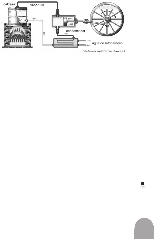 373 VO LU M E 4 C IÊ N CI AS D A N AT U RE ZA e s ua s te cn ol og ia s Nesse contexto, assinale o que for correto. 01) O rendimento de uma máquina térmica poderá ter um valor igual a 1,2, dependendo do gás utilizado nas transformações envolvidas. 02) Desde que os novos maiôs confeccionados com poliu- retano (grupo de polímeros termoplásticos sob forma de esponjas, resinas ou borrachas) foram desenvolvi- dos, recordes têm sido quebrados em várias modalida- des esportivas. O estudo da Hidrostática nos permite entender como funcionam esses “supermaiôs”, pois além de atuarem comonisolantes térmicos e acústicos, podem ajudar na flutuação do atleta. 04) Uma força é aplicada sobre uma superfície, for- mando 90° com ela. Se a força aplicada mudar sua direção, formando 30° com a superfície, a pressão exercida sobre ela cairá pela metade. 08) Uma máquina térmica transforma em energia útil 20% do calor retirado de sua fonte quente. Então, se a potência útil dessa máquina for de 600 kW, a quantidade de calor rejeitado para a fonte fria, em um segundo, será igual a 2,4 MJ. 13. (Uem-pas 2022) Sobre termodinâmica, assinale o que for correto. 01) A variação da energia interna de um sistema é dada pela soma da quantidade de calor trocado com o meio externo e com o trabalho realizado no pro- cesso termodinâmico. 02) A temperatura de um gás está diretamente relacio- nada com a energia cinética das moléculas. 04) É impossível converter totalmente calor em outra forma de energia em um ciclo termodinâmico. 08) A entropia do universo sempre diminui. 16) A eficiência de um motor a combustão é sempre menor que 100% ou igual a 100%. 14. (Uepg-pss 2 2023) A Termologia é um dos ramos da Física que estuda fenômenos presentes em nosso dia a dia. Nesse âmbito, assinale o que for correto. Dado: 1 atm = 760 mmHg 01) O calor específico das substâncias é uma caracterís- tica delas e varia com a temperatura. 02) Um recipiente contém 400 g de oxigênio a 0 °C à pressão de 76 cmHg. Essa massa de gás é aquecida até 102 °C, a volume constante. Considerando que o comportamento é de um gás ideal, sua pressão passará a ser menor do que 1,3 atm. 04) A 2ª Lei da Termodinâmica, muitas vezes, é também denominada Princípio da Degradação da Energia, pelo fato de que é impossível converter integral- mente calor em outra forma de energia. 08) No processo de propagação por condução de calor, sempre haverá transporte de matéria. 15. (Pucrs) Em uma máquina térmica ideal que opere em ciclos, todos os processos termodinâmicos, além de rever- síveis, não apresentariam dissipação de energia causada por possíveis efeitos dos atritos internos nos mecanismos ou turbulências no fluido operador da máquina. O ciclo de Carnot é um bom exemplo de processo termodinâmico idealizado, que apresen- taria a maior eficiência possível na transformação de calor em trabalho útil. A eficiência para uma máquina de Carnot operando entre as temperaturas absolutas de 300 K e 900 K seria de aproximada- mente __________, e a entropia do sistema ficaria __________ durante o processo. a) 66% – maior b) 66% – igual c) 33% – menor d) 33% – maior e) 100% – igual 16. (Unesp) A figura mostra uma máquina térmica em que a cal- deira funciona como a fonte quente e o condensador como a fonte fria. a) Considerando que, a cada minuto, a caldeira for- nece, por meio do vapor, uma quantidade de calor igual a 1,6 . 109 J e que o condensador recebe uma quantidade de calor igual a 1,2 . 109 J, calcule o rendimento dessa máquina térmica. b) Considerando que 6,0 . 103 kg de água de refrigeração fluem pelo condensador a cada minuto, que essa água sai do condensador com temperatura 20 °C acima da temperatura de entrada e que o calor específico da água é igual a 4,0 . 103 J/(kg⋅ °C), calcule a razão entre a quantidade de calor retirada pela água de refrigeração e a quantidade de calor recebida pelo condensador. 17. (Famerp) A figura representa o diagrama de fluxo de ener- gia de uma máquina térmica que, trabalhando em ciclos, retira calor (Q1) de uma fonte quente. Parte dessa quantidade de calor é transformada em traba- lho mecânico τ e a outra parte (Q2) transfere-se para uma fonte fria. A cada ciclo da máquina, Q1e Q2são iguais, em módulo, respectivamente, a 4 . 103 J e 2,8 . 103 J. 374 VO LU M E 4 C IÊ N CI AS D A N AT U RE ZA e s ua s te cn ol og ia s Sabendo que essa máquina executa 3.000 ciclos por minuto, calcule: a) o rendimento dessa máquina. b) a potência, em watts, com que essa máquina opera. 18. (Ufpr 2017) Uma máquina térmica teórica ideal teve um dimen- sionamento tal que, a cada ciclo, ela realizaria tra- balho de 50 cal e cederia 150 cal para a fonte fria. A temperatura prevista para a fonte quente seria de 127 °C. Determine: a) O rendimento dessa máquina térmica. b) A temperatura prevista para a fonte fria, em graus Celsius. 19. (Uema 2016) Eis o funcionamento de uma máquina frigorífica: Em uma máquina frigorífica, em cada ciclo da subs- tância trabalhante, é retirada uma quantidade de calor “Q2” da fonte fria (o congelador em uma gela- deira) que, juntamente com o trabalho externo " "ô (trabalho do compressor nas geladeiras), é rejeitado para a fonte quente (ar atmosférico), na forma de quantidade de calor “Q1”. |CALÇADA, Caio Sérgio, SAMPAIO, José Luís. Física Clássica. Termolo- gia, Óptica e Ondas. São Paulo: Atual Editora LTDA. a) Analise que tipo de conversão ocorre numa máquina frigorífica. b) Justifique qual a lei natural que sustenta o funcio- namento da mesma. c) Demonstre, considerando as informações fornecidas no comando da questão, qual a expressão que cal- cula a eficiência “e” de uma máquina frigorífica. d) Se Q2 = 200J e τ = 400 J quanto vale a eficiência d2a mesma? 20. (Ufsc 2014) A Petrobras é uma empresa que nasceu 100% nacio- nal, em 1953, como resultado da