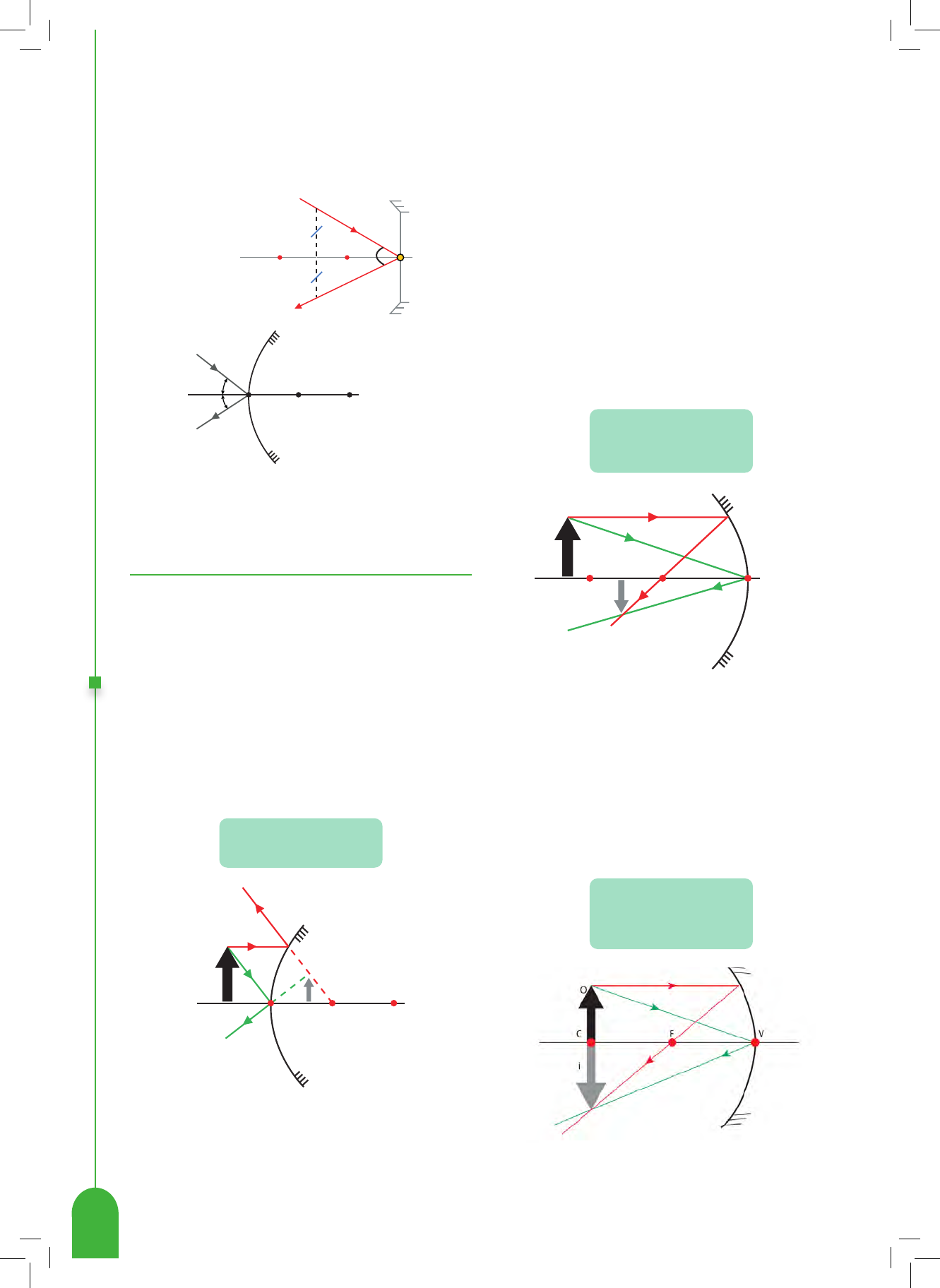 Física 82 4.2. Espelho côncavo Utilizaremos a mesma técnica para formar a imagem, sendo que existem cinco possibilidades de formação de ima- gem, a depender da posição relativa entre o objeto e o es- pelho. 4.2.1. Caso I: Objeto antes do centro de curvatura Ao posicionar o objeto antes do centro de curvatura, o espelho conjugará uma imagem entre o centro de curvatura e o foco, com as características: FC 0 i V 4.2.2. Caso II: Objeto sobre o centro de curvatura Ao posicionar o objeto sobre o centro de curvatura, o espelho conjugará uma imagem também no centro de curva- tura, com as características: 4. Raios que incidem pelo vértice do espelho refletem simetricamente em relação ao eixo principal. VFC Vi r F C 4. Imagens em um espelho esférico 4.1. Espelho convexo Os espelhos convexos são mais simples que os cônca- vos, pois só há uma configuração de imagens. Em qualquer posição que nosso objeto for colocado, sobre o eixo principal do espelho, teremos a configuração apresentada na figura a seguir. Para avaliar o caso, escolhemos dois raios notáveis que partem do topo do objeto. Escolhemos sempre o raio que incide paralelo ao eixo principal do espelho. A sua imagem conjugada tem as seguintes características: Virtual, Direita e Menor F V 0 i C Real, Invertida e Menor que o objeto Real, Invertida e Igual ao tamanho do objeto i r VOLUME 1 | Ciências da natureza e suas tecnologias 83 4.2.3. Caso III: Objeto entre o centro de curvatura e o foco Ao posicionar o objeto entre o centro de curvatura e o foco, o espelho conjugará uma imagem que se forma antes do centro de curvatura, com as características: Real, Invertida e Maior que o objeto Virtual, Direita e Maior que o objeto Imprópria (ou que se forma no infinito) Observação: Toda imagem real pode ser projetada num anteparo. Nunca uma imagem virtual pode ser projetada num anteparo. FC 0 i V 4.2.4. Caso lV: objeto sobre o foco Ao posicionar o objeto sobre o foco, o espelho NÃO con- jugará uma imagem, porque os raios refletidos são paralelos e, se não se cruzam, não há formação de imagem. Dizemos então que a imagem é: 0 FC V 4.2.5. Caso V: Objeto entre o foco e o vértice Ao posicionar o objeto entre o foco e o vértice, o espelho conjugará uma imagem "atrás" do espelho, com as caracte- rísticas: FC 0 i V Multiplataformas: Vídeo Experimento - Formando objetos fantasmas Multiplataformas: Site Simulador de Formação de Imagens nos Espelhos Esféricos (Phet Colorado) Física 84 Aplicações Práticas 1. (Uece 2023) Espelhos esféricos são amplamente utilizados em nosso cotidiano. Como exemplo, é possível citar o espelho retrovisor de um carro ou, mesmo, o espelho utilizado pelo dentista ao examinar os dentes de um paciente. Um estudante deseja montar um sistema óptico para uma feira de ciências. Tal sistema consiste em dois cilindros metálicos idênticos (objetos), porém de cores diferentes sendo um deles preto, e o outro branco, que serão colocados um sobre o outro perpendicularmente ao eixo principal de um espelho esférico côncavo, em uma sala iluminada apenas com luz monocromática verde. Sobre a imagem dos cilindros formada pelo espelho côncavo, podemos afirmar que a) pode ser direita, menor que a soma das alturas dos cilindros e vista nas cores verde e branco. b) caso os cilindros estejam posicionados no centro de curvatura do espelho, a imagem também estará posicionada no centro de curvatura, mas será invertida em relação ao objeto e vista nas cores preto e branco. c) pode ser invertida, menor que a soma das alturas dos cilindros e observada nas cores preto e verde. d) existe a possibilidade de a imagem ser virtual e menor que a soma das alturas dos cilindros. Resposta: C Iluminados por luz monocromática verde, o cilindro branco é visto na cor verde e o cilindro preto continua sendo visto na cor preta. Quanto à imagem: • Pode ser virtual, direita e maior se os cilindros estiverem entre o foco e o vértice; • Pode ser real, invertida e maior se os cilindros estiverem entre o foco e o centro; • Pode ser real, invertida e igual se os cilindros estiverem sobre o centro de curvatura; • Pode ser real, invertida e menor se os cilindros estiverem antes do centro de curvatura; 2. (Ufjf-pism 2 2022) No dia de seu aniversário de 12 anos, Maria Rita percebeu que havia aparecido uma espinha em seu rosto. Incomodada com essa situação, entrou em contato com sua tia que era proprietária de uma loja de variedades e que vendia vários tipos de espelhos, tanto planos quanto esféricos. Sua tia lhe trouxe então um espelho esférico que, se colocado bem próximo ao rosto, lhe permitia ver a imagem desejada da espinha, que ela queria direita e ampliada. O espelho trazido: a) Era um espelho côncavo, que fornece uma imagem maior e direita sempre que o objeto é colocado bem próxi- mo ao espelho. b) Era côncavo ou convexo, pois tanto um quanto outro poderia fornecer a imagem desejada, dependendo da distância do rosto ao espelho. c) Era convexo, que sempre fornece uma imagem maior e bem nítidas, mas somente se o objeto é colocado bem próximo ao espelho. d) Certamente era um espelho côncavo, que sempre oferece uma imagem direita e bem nítida, qualquer que seja a distância do objeto ao espelho. e) Com certeza era um daqueles espelhos convexos, colocados em lojas, no interior de coletivos urbanos e em retrovisores de automóveis.