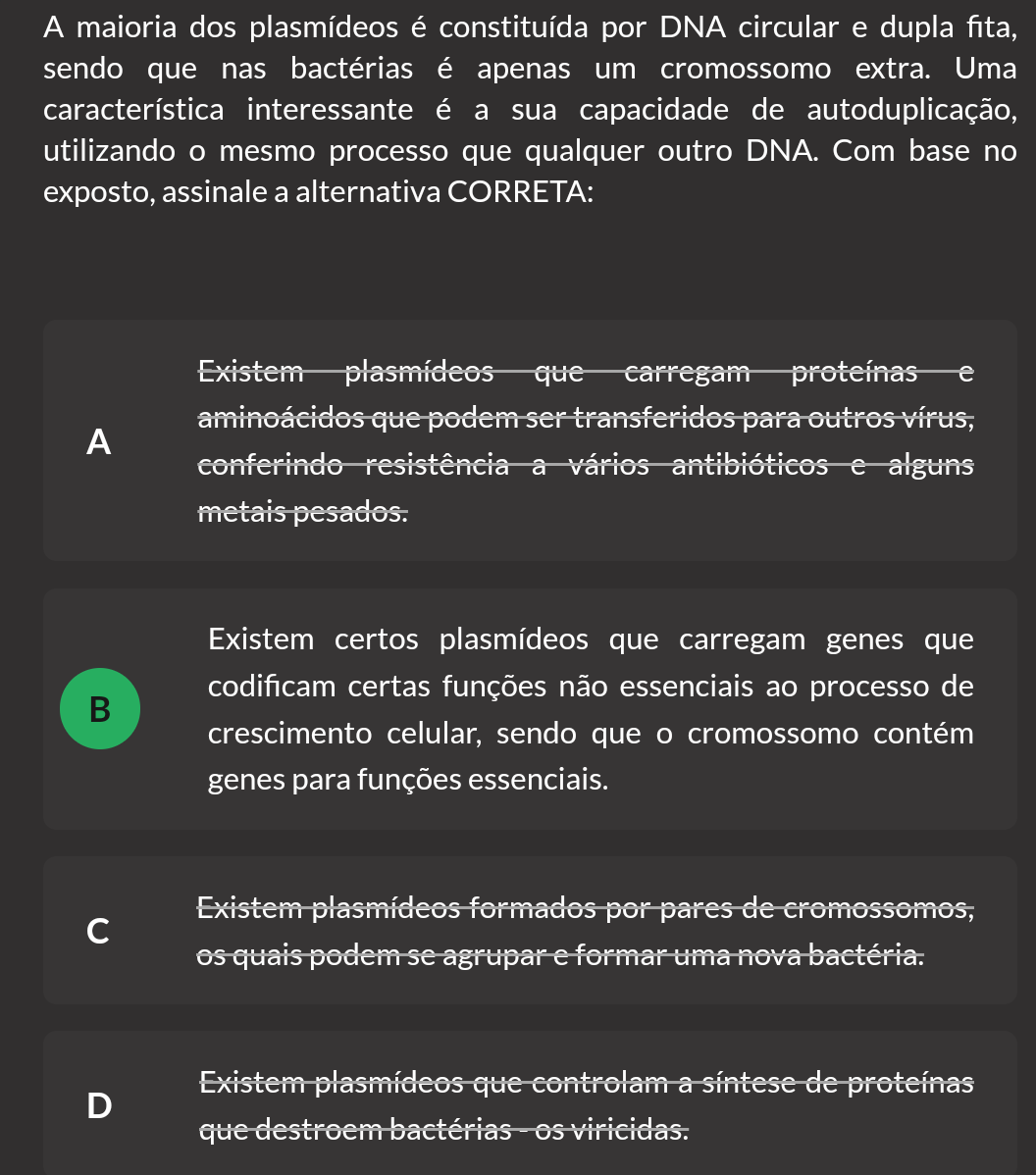 A maioria dos plasmídeos é constituída por DNA circular e dupla fita, sendo que nas bactérias é apenas um cromossomo extra. Uma característica interessante é a sua capacidade de autoduplicação, utilizando o mesmo processo que qualquer outro DNA. Com base no exposto, assinale a alternativa CORRETA: Existem plasmídeos que carregam proteínas e aminoácidos que podem ser transferidos para outros conferindo resistência a vários antibióticos e alguns metais pesados. Existem certos plasmídeos que carregam genes que codificam certas funções não essenciais ao processo de crescimento celular, sendo que o cromossomo contém genes para funções essenciais. Existem plasmídeos formados por pares de cromossomos, os quais podem se agrupar e formar uma nova bactéria. Existem plasmídeos que controlam a síntese de proteínas e destroem bactérias.