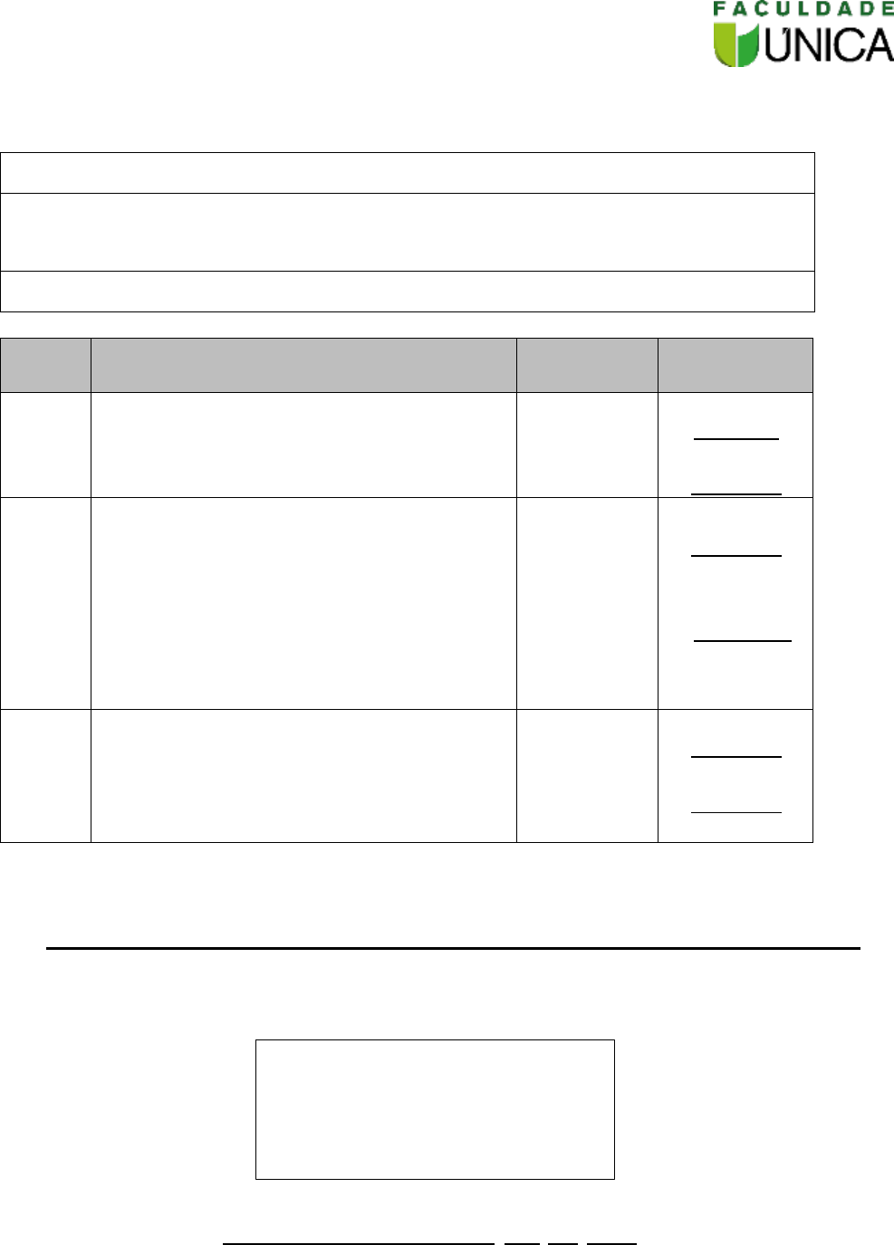 Carimbo da Instituição FICHA DE ACOMPANHAMENTO DO/A ESTAGIÁRIO/A ESTÁGIO CURRICULAR OBRIGATÓRIO III: Treinamento Desportivo ESTAGIÁRIO(A): RODRIGO DE SOUSA ARAUJO SUPERVISOR/A DE ESTÁGIO DA INSTITUIÇÃO CONCEDENTE: INSTITUIÇÃO: ORDEM DESCRIÇÃO DA ATIVIDADE HORAS REALIZADAS DATA 1º - Observar o público alvo (sexo, idade). 10 De 04/ 04 / 2024 a 05 / 04 / 2024 2º - Observar e auxiliar o professor na elaboração de projetos, elaboração de coreografias e aulas (Tipos de projetos; temas de coreografias; descrever as aulas). - Observar e auxiliar na elaboração, planejamento e acompanhamento das atividades e seleção de materiais (como são feitos os planejamentos). 50 De 08 / 04 / 2024 a 19 / 04 / 2024 3º - Auxiliar o acompanhamento dos alunos com dificuldades na execução das atividades. - Acompanhamento e prática supervisionada na preparação física de modalidades esportivas. 40 De 22 / 04 / 2024 a 29 / 04 / 2024 Assinatura do (a) Supervisor (a) de Estágio (Inst. Concedente) Assinatura do (a) Estagiário (a) Ibotirama-Ba , 29 / 04 / 2024. CIDADE DATA Espaço para outras informações sobre o (a) estagiário (a). Caso julgue necessário, utilize o verso da folha. Carimbo da Instituição e Assinatura e Identificação do (a) avaliador AVALIAÇÃO DO/A ESTAGIÁRIO/A ESTÁGIO CURRICULAR OBRIGATÓRIO III: Treinamento Desportivo Estagiário/a: RODRIGO DE SOUSA ARAÚJO Instituição: Atenção: O/a avaliador/a deverá preencher o quadro considerando a legenda abaixo: DESEMPENHO ACADÊMICO (COMPETÊNCIAS E HABILIDADES) SIM NÃO 1- Capacidade de correlacionar teoria e prática. X 2- Iniciativa para decidir e independência para agir em situações práticas? X 3- Demonstrou comprometimento com as atividades de estágio? X 4- Uso adequado dos instrumentos, materiais e/ou equipamentos. X 5- Desenvolvimento do plano de atividades de estágio. X DESENVOLVIMENTO PESSOAL Ótimo Satisfatório Ruim 1- Pontualidade. X 2- Assiduidade. X 3- Comunicação e relações interpessoais. X 4- Motivação. X 5- Conduta ética. X 6- Apresentação Pessoal. X 7- Criatividade. X NOTA GERAL DO/A ALUNO/A. (De 0 a 100) 100 NOTA Ibotirama, 29 de abril de 2024. Supervisor de estágio (Empresa): Estagiário: (Carimbo e Assinatura) (Assinatura)