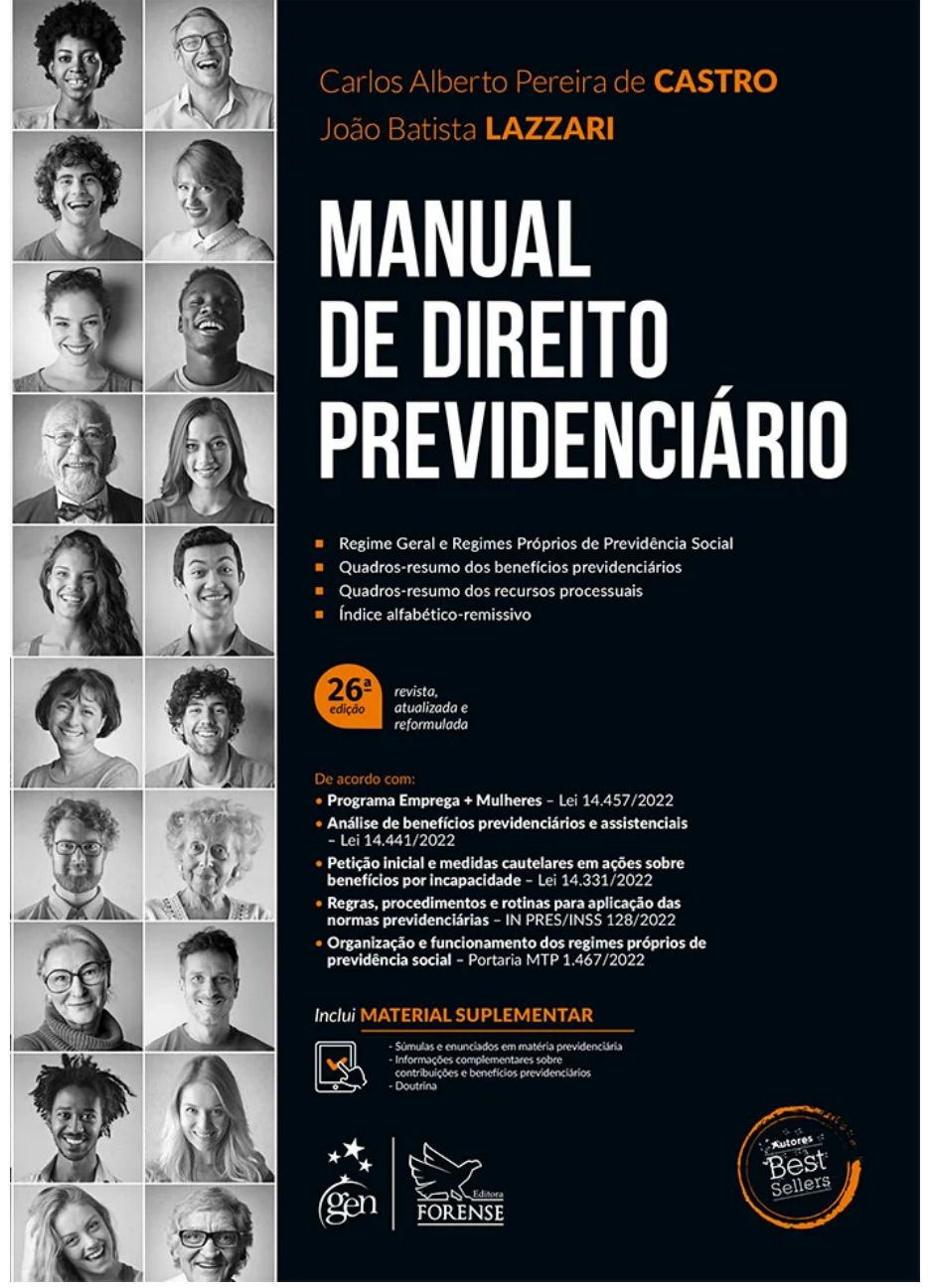 ■ ■ ■ ■ ■ ■ O autor deste livro e a editora empenharam seus melhores esforços para assegurar que as informações e os procedimentos apresentados no texto estejam em acordo com os padrões aceitos à época da publicação, e todos os dados foram atualizados pelo autor até a data de fechamento do livro. Entretanto, tendo em conta a evolução das ciências, as atualizações legislativas, as mudanças regulamentares governamentais e o constante fluxo de novas informações sobre os temas que constam do livro, recomendamos enfaticamente que os leitores consultem sempre outras fontes fidedignas, de modo a se certificarem de que as informações contidas no texto estão corretas e de que não houve alterações nas recomendações ou na legislação regulamentadora. Fechamento desta edição: 11.10.2022 O Autor e a editora se empenharam para citar adequadamente e dar o devido crédito a todos os detentores de direitos autorais de qualquer material utilizado neste livro, dispondo-se a possíveis acertos posteriores caso, inadvertida e involuntariamente, a identificação de algum deles tenha sido omitida. Atendimento ao cliente: (11) 5080-0751 | faleconosco@grupogen.com.br Direitos exclusivos para a língua portuguesa Copyright © 2023 by Editora Forense Ltda. Uma editora integrante do GEN | Grupo Editorial Nacional Travessa do Ouvidor, 11 – Térreo e 6º andar Rio de Janeiro – RJ – 20040-040 www.grupogen.com.br Reservados todos os direitos. É proibida a duplicação ou reprodução deste volume, no todo ou em parte, em quaisquer mailto:faleconosco@grupogen.com.br http://www.grupogen.com.br/ ■ ■ formas ou por quaisquer meios (eletrônico, mecânico, gravação, fotocópia, distribuição pela Internet ou outros), sem permissão, por escrito, da Editora Forense Ltda. Capa: Fabricio Vale CIP – BRASIL. CATALOGAÇÃO NA FONTE. SINDICATO NACIONAL DOS EDITORES DE LIVROS, RJ. C35m Castro, Carlos Alberto Pereira de Manual de direito previdenciário / Carlos Alberto Pereira de Castro, João Batista Lazzari. – 26. ed. – Rio de Janeiro: Forense, 2023. Inclui bibliografia e índice ISBN 978-65-596-4654-8 1. Seguridade social - Legislação - Brasil. 2. Previdência social - Legislação - Brasil. I. Lazzari, João Batista. II. Título. 22-80520 CDU: 349.3(81) Meri Gleice Rodrigues de Souza – Bibliotecária – CRB-7/6439 1.1 1.2 1.3 1.4 1.5 1.6 2.1 2.2 2.3 Abreviaturas PARTE I INTRODUÇÃO AO DIREITO PREVIDENCIÁRIO Capítulo 1 – O Estado e a Proteção Social ao Trabalhador Prólogo O surgimento da noção de proteção social A mútua assistência e a caridade A assistência social estatal A formação do conceito de bem-estar social Evolução da previdência social – Do modelo de Bismarck ao modelo de Beveridge Capítulo 2 – Fundamentos da Previdência Social A intervenção do Estado e a dignidade da pessoa humana A solidariedade social A compulsoriedade da filiação https://jigsaw.vitalsource.com/books/9786559646548/epub/OEBPS/Text/fm08.xhtml https://jigsaw.vitalsource.com/books/9786559646548/epub/OEBPS/Text/part01.xhtml https://jigsaw.vitalsource.com/books/9786559646548/epub/OEBPS/Text/part01.xhtml https://jigsaw.vitalsource.com/books/9786559646548/epub/OEBPS/Text/chapter01.xhtml https://jigsaw.vitalsource.com/books/9786559646548/epub/OEBPS/Text/chapter01.xhtml#sec1-1 https://jigsaw.vitalsource.com/books/9786559646548/epub/OEBPS/Text/chapter01.xhtml#sec1-2 https://jigsaw.vitalsource.com/books/9786559646548/epub/OEBPS/Text/chapter01.xhtml#sec1-3 https://jigsaw.vitalsource.com/books/9786559646548/epub/OEBPS/Text/chapter01.xhtml#sec1-4 https://jigsaw.vitalsource.com/books/9786559646548/epub/OEBPS/Text/chapter01.xhtml#sec1-5 https://jigsaw.vitalsource.com/books/9786559646548/epub/OEBPS/Text/chapter01.xhtml#sec1-6 https://jigsaw.vitalsource.com/books/9786559646548/epub/OEBPS/Text/chapter02.xhtml https://jigsaw.vitalsource.com/books/9786559646548/epub/OEBPS/Text/chapter02.xhtml#sec2-1 https://jigsaw.vitalsource.com/books/9786559646548/epub/OEBPS/Text/chapter02.xhtml#sec2-2 https://jigsaw.vitalsource.com/books/9786559646548/epub/OEBPS/Text/chapter02.xhtml#sec2-3 2.4 2.5 2.6 2.7 3.1 3.2 3.3 3.4 4.1 4.2 4.3 4.4 4.5 4.6 4.7 4.8 4.9 5.1 5.2 5.3 5.4 A proteção aos previdentes A redistribuição de renda O risco social Da previdência à segurança social Capítulo 3 – Modelos de Previdência Social Sistemas contributivos e não contributivos Sistemas contributivos de repartição e capitalização Sistemas privados de previdência O sistema de pilares Capítulo 4 – A Evolução da Proteção Social no Brasil Primeiras regras de proteção A Lei Eloy Chaves Os institutos de classe Da criação do INPS à Constituição de 1988 A Constituição de 1988 e a Seguridade Social A criação do INSS e as primeiras reformas A Emenda Constitucional n. 20, de 1998 As Emendas Constitucionais ns. 41 e 47 A Emenda Constitucional n. 103, de 2019 Capítulo 5 – O Direito Previdenciário Conceito e objeto de estudo Autonomia científica Classificação perante a divisão didático-enciclopédica do Direito Relação do Direito Previdenciário com outros ramos do Direito https://jigsaw.vitalsource.com/books/9786559646548/epub/OEBPS/Text/chapter02.xhtml#sec2-4 https://jigsaw.vitalsource.com/books/9786559646548/epub/OEBPS/Text/chapter02.xhtml#sec2-5 https://jigsaw.vitalsource.com/books/9786559646548/epub/OEBPS/Text/chapter02.xhtml#sec2-6 https://jigsaw.vitalsource.com/books/9786559646548/epub/OEBPS/Text/chapter02.xhtml#sec2-7 https://jigsaw.vitalsource.com/books/9786559646548/epub/OEBPS/Text/chapter03.xhtml https://jigsaw.vitalsource.com/books/9786559646548/epub/OEBPS/Text/chapter03.xhtml#sec3-1 https://jigsaw.vitalsource.com/books/9786559646548/epub/OEBPS/Text/chapter03.xhtml#sec3-2 https://jigsaw.vitalsource.com/books/9786559646548/epub/OEBPS/Text/chapter03.xhtml#sec3-3 https://jigsaw.vitalsource.com/books/9786559646548/epub/OEBPS/Text/chapter03.xhtml#sec3-4 https://jigsaw.vitals