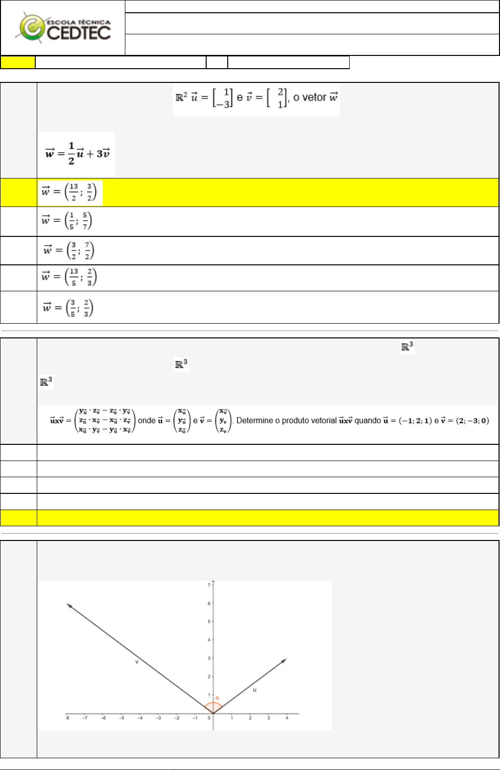 12/03/2024 08:38:23 1/3 REVISÃO DE SIMULADO Nome: CAIO MATOS VELOSO Disciplina: Geometria Analítica e Sistemas Lineares Respostas corretas são marcadas em amarelo X Respostas marcardas por você. Questão 001 Sendo dados os vetores do que é resultante da combinação linear abaixo: X A) B) C) D) E) Questão 002 Sabemos que o produto vetorial é aqule em que tomados dois vetores do , iremos obter um outro vetor também do . Importante afirmar que essa operção é exclusiva do espaço . Sendo dessa operação dada, e lembrando que a obtenção do vetor resultante é dado por: X A) (3;0; -1) B) (3; -1;0) C) (0; 2; 1) D) (3; -2; -1) E) (3; 2; -1) Questão 003 Dois animais estão amarrados a cordas distintas e irão realizar um trabalho, onde vão aparecer tensões em tais cordas. Estas tensões estão sendo representadas no plano cartesiano abaixo: Determine qual é então a medida do ângulo, que é na verdade o ângulo existente entre os vetores que estão representando as tensões nas cordas: 12/03/2024 08:38:23 2/3 X A) 106,3º B) 12,7º C) 85,2º D) 92,8º E) 100,1º Questão 004 Revendo o conceito de combinação linear e sabendo que alguns vetores podem ser obtidos através de algumas operações envolvendo outrosvetores, considere: do plano cartesiano e então determine os valores das constantes que fazem com que a combinação linear abaixo realmente exista A) X B) C) D) E) Questão 005 Um menino possui 29 moedas de 10 centavos e 15 moedas de 25 centavos. O número de maneiras diferentes que ele tem para formar 5 reais é igual a: A) 5 B) 4 X C) 2 D) 6 E) 3 Questão 006 A) B) X C) D) E) 12/03/2024 08:38:23 3/3 Questão 007 Dois vetores representam graficamente, no plano cartesiano, com suas extremidades os deslocamentos de dois corpos (deslocamento na unidade km) feitos a partir de um ponto em comum (origem do sistema de coordenadas cartesianas). Veja: Podemos então afirmar que a distância entre esses dois corpos após o deslocamento será de: A) B) X C) D) E) Questão 008 Um grupo de vetores em pode ser apresentado sem necessariamente ter a origem coincidindo com a origem do plano de coordenadas cartesianas, o que pode acontecer quando, por exemplo estivermos representado vetores que são na prática um grupo de grandezas estudadas em certas situações. Considere o diagrama vetorial abaixo, onde temos relaconadas três grandezas coplanares: A única igualdade correta a seu respeito será: A) B) X C) D) E)