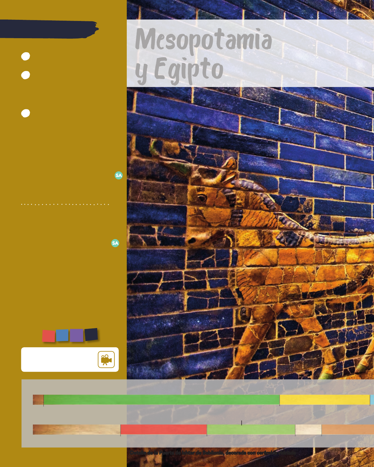 Mesopotamia y Egipto Mesopotamia y Egipto UNIDAD 9 ZQ U I Mesopotamia Egipto 3500 a. C. 2271 a. C. 539 a. C. 331 a. C. 30 a. C. 1800 a. C. 1375 a. C. 612 a. C. SUMERIOS ACADIOS BABILONIOS ASIRIOS NEOBABILONIOS PERSAS 3100 a. C. 2650 a. C. 2190 a. C. 2052 a. C. 1570 a. C.1610 a. C. 1069 a. C. 715 a. C. ÉPOCA TINITA REINO ANTIGUO PRIMER PERÍODOINTERMEDIO TERCER PERÍODO INTERMEDIO SEGUNDO PERÍODO INTERMEDIO REINO MEDIO REINO NUEVO BAJA ÉPOCA Código de Hammurabi 1750 a. C. Gran Biblioteca de Nínive 700 a. C. Puerta de Ishtar 575 a. C. Pirámides de Egipto 2500 a. C. Invasión de los hicsos 1650 a. C. Batalla de Qadesh 1275 a. C. Nubios 715 a. C. Asirios 662 a. C.Persas 525 a. C. Griegos 332 a. C. Romanos 30 a. C. AULA DE CINE Tutankhamón Detalle de la Puerta de Ishtar de Babilonia, decorada con cerámica vidriada 1 Las primeras civilizaciones urbanas 2 Mesopotamia CÓMO SE VIVÍA EN Mesopotamia 3 El antiguo Egipto CÓMO SE VIVÍA EN El antiguo Egipto EN PORTADA El pueblo hebreo PROCEDIMIENTOS Y ESTRATEGIAS Analizar y comentar textos históricos ACTIVIDADES DE SÍNTESIS CONOCIMIENTOS BÁSICOS DESARROLLO DE COMPETENCIAS Una antología de cuentos de terror Referencia fotos de inicio unidad. Comunicación oral y escrita La reina-faraón — Lo del templo de Hatshepsut me suena —dije—. Es uno de esos sitios que siempre visitan los turistas cuando van a Egipto, ¿no? — Así es —confirmó el abuelo—. Y resulta comprensible. Es espectacular, y se conserva muy bien. Hatshepsut supo dejar huella en la historia, aunque otros, después, intentasen borrarla. — ¿Fue un faraón muy poderoso? Mi padre me miró con incredulidad. Mi abuelo, con reprobación. — ¿No sabes quién fue Hatshepsut? —preguntó, escandalizado—. De verdad, a veces no sé para qué vas al instituto. ¡No fue un faraón! Fue una faraón. — Una faraona, querrás decir —le espeté, picada. — Bueno… Ese término no existía para los antiguos egipcios. Lo de que una mujer ocupase el trono de las dos Tierras fue algo bastante excepcional. Imagínate si lo era, que la propia Hatshepsut se hacía retratar con barba y ataviada como un hombre, para que nadie pusiese en duda que ostentaba el poder, pese a ser una mujer. — Qué triste —opiné—. ¿No podía mandar y ser mujer al mismo tiempo? — Lo hizo —intervino mi padre—. Pero no se lo pusieron fácil. Ana Alonso Luna y los incorpóreos. La tumba pintada Oxford University Press Templo de la reina Hatshepsut en Luxor (Tebas, Egipto). Después de leer… 1 ¿Quién fue Hatshepsut? ¿Qué cargo ocupó? 2 ¿Con qué dificultades se encontró? ¿Por qué crees que fue así? 3 ¿Consideras que en la actualidad se ha logrado la plena igualdad entre hombres y mujeres? 4 ¿Qué acciones se pueden llevar a cabo para alcanzar las metas del ODS 5 (Igualdad de género)? Plantead propuestas en grupo. Mesopotamia Egipto 3500 a. C. 2271 a. C. 539 a. C. 331 a. C. 30 a. C. 1800 a. C. 1375 a. C. 612 a. C. SUMERIOS ACADIOS BABILONIOS ASIRIOS NEOBABILONIOS PERSAS 3100 a. C. 2650 a. C. 2190 a. C. 2052 a. C. 1570 a. C.1610 a. C. 1069 a. C. 715 a. C. ÉPOCA TINITA REINO ANTIGUO PRIMER PERÍODOINTERMEDIO TERCER PERÍODO INTERMEDIO SEGUNDO PERÍODO INTERMEDIO REINO MEDIO REINO NUEVO BAJA ÉPOCA Código de Hammurabi 1750 a. C. Gran Biblioteca de Nínive 700 a. C. Puerta de Ishtar 575 a. C. Pirámides de Egipto 2500 a. C. Invasión de los hicsos 1650 a. C. Batalla de Qadesh 1275 a. C. Nubios 715 a. C. Asirios 662 a. C.Persas 525 a. C. Griegos 332 a. C. Romanos 30 a. C. Detalle de la Puerta de Ishtar de Babilonia, decorada con cerámica vidriada 216 BLOQUE. DE LA PREHISTORIA A LAS PRIMERAS CIVILIZACIONES Las primeras civilizaciones urbanas En el IV milenio a. C., los avances tecnológicos permitieron a las poblaciones que vivían cerca de grandes ríos controlar las crecidas, con la construcción de canales y diques, y aprovechar la fertilidad de sus orillas, gracias a los limos1 que se depositaban durante las inundaciones. Los primeros poblados crecieron hasta convertirse en prósperas ciudades, en las que, junto a la riqueza agrícola, se desarrolló la artesanía y el comercio. Sur- gieron así las primeras civilizaciones urbanas. En ellas se levantaron grandes construcciones y se produjeron importantes transformaciones en la política, la economía y la cultura. Estas civilizaciones fluviales fueron: Mesopotamia. La primera en el tiempo, se formó en torno a los ríos Tigris y Éufrates alrededor del año 3200 a. C. Egipto. Surgió a orillas del río Nilo en el 2850 a. C. Tanto Mesopotamia como Egipto estaban dentro del Creciente Fértil, región en la que nació el Neolítico, y establecieron relaciones entre ellas. En la India, alrededor del río Indo, se desarrolló la civilización Harappa a partir del 2500 a. C. En China, junto al río Amarillo, surgió una civilización a partir de las dinas- tias Xia (2000 a. C.) y Shang (1500 a. C.). 1 1 Responde a estas preguntas: a. ¿Qué tenían en común las regiones donde se formaron las primeras civilizaciones? b. ¿Qué importancia tenía para estas civilizaciones la crecida de los ríos? c. Localiza en un mapa los ríos que dieron origen a las primeras civilizaciones. ¿En qué continentes están? 2 Elabora un esquema con las diferentes formas de escritura que surgieron en la Antigüedad. ¿Qué be- neficios pudo traer la escritura a las sociedades que las desarrollaron? 3 Con el desarrollo de la escritura, ¿qué tipo de fuente histórica aparece? 4 Imagina que no sabes escribir y tienes que registrar los productos que han llegado a bordo de un barco: cinco piezas de pescado y tres gallinas. Representa esta información con dibujos. A continuación, simplifica los dibujos todo lo posi- ble y conviértelos en signos. Enseña a tus compañeros la versión simplificada, explicándoles qué significa cada signo. ¿Cómo se llama el tipo de escritura que has empleado? Actividades 1 limo: barro formado por los sedimentos que arr