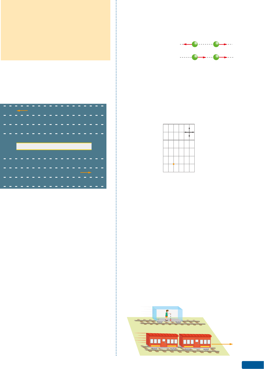 Introdução à Mecânica 47 III. Verdadeira. Por definição, o ponto material está em repouso em relação a um sistema de eixos cartesianos triortogonal, quando todas as três coordenadas, x, y e z, não variam com o tempo. IV. Falsa. Basta que uma das coordenadas de P varie com o tempo para que ele saia do repou- so e fique em movimento. 2. Uma grande avenida apresenta oito pistas de rola- mento para o tráfego de veículos, havendo um can- teiro de separação no meio delas. Em quatro pistas os carros andam da zona leste para a zona oeste e, nas outras quatro, da zona oeste para leste. 2 1 4 3 5 zona oeste zona leste 7 6 8 Com base na figura, podemos afirmar que: I. as oito pistas têm a mesma direção. II. as pistas 2 e 4 têm o mesmo sentido. III. as pistas 3 e 7 têm direções opostas. IV. as pistas 4 e 5 têm a mesma direção e senti- dos opostos. Estão corretas as afirmativas: a) I, II, III e IV. d) II e IV, apenas. b) I e II, apenas. e) II, III e IV, apenas. c) I, II e IV, apenas. 3. Imaginemo-nos fazendo uma viagem numa aero- nave que voa a 10 km de altura em movimento retilíneo e horizontal, a uma velocidade de 864 km/h em relação ao solo (Terra). a) Fixe um referencial no avião e responda: Qual é o estado cinemático dos demais passageiros sentados em suas poltronas? b) Para um referencial fixo no solo (na Terra), qual é a velocidade dos demais passageiros? c) Se a aeromoça, parada ao seu lado, deixar cair uma laranja, qual é a trajetória para um referencial fixo no avião? 4. Na figura temos quatro pontos materiais, A, B, C e D, que se movimentam em relação ao solo com velocidade de módulo v e sentido indicado por uma seta. Responda em cada caso qual é o estado cinemático do ponto material. a) A em relação a C. b) C em relação a D. c) B em relação a C. A v B C D v v v 5. No mapa de uma cidade observamos que seus quarteirões são retangulares e idênticos, medin- do 60 m × 80 m cada um. Um carteiro precisa entregar algumas correspondências e vai partir da posição P seguindo o seguinte roteiro: 60 m para oeste; 160 m para o norte; 120 m para o leste; 80 m para o sul; 120 m para o leste e, finalmente, 160 m para o norte. P80 m 60 m O L N S z A P t Traçando no mapa um segmento retilíneo de sua posição final até a posição inicial P, encontramos a distância: a) 360 m c) 280 m e) 180 m b) 300 m d) 240 m 6. Um vagão de trem, todo construído em acrílico transparente, estava parado numa estação. No interior desse vagão, um estudante estava rea- lizando um experimento com uma bolinha de chumbo que consistia em abandoná-la em queda livre e fotografá-la com flash estroboscópico obtendo fotos sucessivas de sua trajetória. Nesse mesmo intervalo de tempo, passou ao lado desse vagão um trem com velocidade constante e na janelinha de um dos vagões havia um físico que observava o experimento do estudante no inte- rior do vagão de acrílico. movimento l u Iz A u g u S t o r Ib E Ir o z A P t z A P t Capítulo 248 Como o experimento foi feito com uma bolinha de chumbo, no interior do vagão, a resistência do ar em nada interferiu. A figura que indica a trajetória da bolinha, como foi observada pelo físico do trem em movimento, é: a) b) c) d) e) Il u St r A ç õ ES z A Pt Exercícios de Aprofundamento 7. Um helicóptero em movimento retilíneo encon- tra-se sobre um carro conversível que viaja à mesma velocidade que aquele. Num dado ins- tante, uma bolinha de aço despenca do trem de pouso do helicóptero, caindo na direção do banco de passageiros do carro, que se encontra vazio. Desprezando a resistência do ar, analise cada afirmativa e responda verdadeiro ou falso. lu Iz A u g u St o r Ib EI r o I. Durante a queda, a bolinha permaneceu em repouso em relação ao carro. II. A trajetória da bolinha, relativamente ao heli- cóptero, é uma reta vertical. III. A trajetória da bolinha, relativamente ao heli- cóptero, é um arco de parábola. IV. O helicóptero está em repouso relativamente ao carro. São verdadeiras: a) todas as quatro alternativas. b) I e III apenas. c) II e IV apenas. d) I, II e III. e) II, III e IV. 8. Numa rodovia retilínea, com duas pistas parale- las, viajam dois carros com a mesma velocidade, estando um ao lado do outro. Os carros são con- versíveis e um passageiro do carro da esquerda e outro do carro da direita resolvem trocar entre si latinhas de refrigerante, fechadas e cheias. Como a velocidade dos carros é pequena, a resistência do ar pode ser desprezada. Muitas latinhas são lançadas com sucesso de um carro para o outro. Assinale a alternativa correta. a) O sucesso da troca se deu pelo fato de que os carros estavam em repouso absoluto e as lati- nhas foram lançadas facilmente de um carro para o outro. b) O sucesso da troca se deu pelo fato de que os carros estavam em repouso relativo, isto é, um em relação ao outro e as latinhas foram lançadas em movimento uniforme, adquirindo trajetórias retilíneas. c) O carro da esquerda estava em movimento relativo ao da direita, mas a perícia dos lan- çadores colaborou para o sucesso do evento. d) O carro da esquerda estava em repouso em relação ao da direita e vice-versa e isso faci- litou a troca de latinhas, que foram lançadas como se o carro vizinho estivesse parado ao seu lado. e) Para compensar o movimento dos carros, o lançador atirava um pouco mais à frente do outro veículo para que as latinhas caíssem exatamente no banco do outro carro. Capítulo 248 cAPÍTuLO 3Velocidade escalar Velocidade escalar 49 1. Velocidade escalar média Na grande maioria dos casos do cotidiano, os movimentos ocorrem num único sentido. Desse modo, vamos apresentar uma defi nição particular de velocidade es- calar média que atenda a esses casos. Consideremos uma partícula percorrendo uma trajetória que pode ser retilínea ou cheia de curvas. Durante o seu movimento, a partícula poderá percorrer alguns trechos com maior rapidez e outros com menor rapide