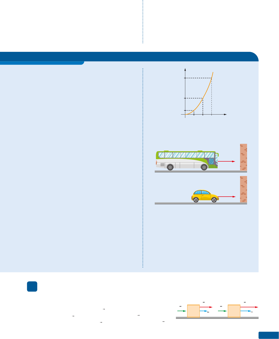 Quantidade de movimento e impulso 401 8. Um automóvel tem movimento retilíneo e unifor- me. Se sua velocidade dobrar, podemos afirmar que: a) sua energia cinética se reduzirá à metade. b) o módulo da quantidade de movimento se tornará o dobro do anterior. c) sua energia cinética se tornará o dobro da anterior. d) o módulo da quantidade de movimento se tornará o quádruplo do anterior. e) o módulo da quantidade de movimento não se alterará. 9. Apresente a equação dimensional da quantidade de movimento. Exercícios de Reforço 10. (UF-PE) Pai e filho são aconselhados a correr para perder peso. Para que ambos percam calorias na mesma proporção, o instrutor da academia sugeriu que ambos desenvolvessem a mesma quantidade de movimento. Se o pai tem 90 kg e corre a uma velocidade de 2,0 m/s, o filho, que tem 60 kg, deverá correr a: a) 1,0 m/s d) 4,0 m/s b) 2,0 m/s e) 5,0 m/s c) 3,0 m/s 11. (UF-AM) Um menino faz girar uma pedra presa a uma haste rígida e de massa desprezível de maneira que ela descreva um movimento circular uniforme num plano vertical, num local em que a aceleração da gravidade é constante. Sobre esse movimento considere as seguintes grandezas relacionadas com a pedra: I. Quantidade de movimento. II. Energia potencial gravitacional. III. Energia cinética. IV. Peso. Dentre essas grandezas, as que variam enquanto a pedra realiza seu movimento são: a) apenas I e IV. d) apenas III e IV. b) apenas I e II. e) apenas I e III. c) apenas II e III. 12. (UE-RJ) Em uma aula de Física os alunos relacio- nam os valores da energia cinética de um corpo aos de sua velocidade. O gráfico indica os resul- tados encontrados. Determine em kg · m/s, o módulo da quantidade de movimento desse corpo quando atinge a velocidade de 5,0 m/s. 1,0 2,0 3,0 v (m/s) E C (J) 9,0 4,0 1,0 13. A figura representa um experimento em que um ônibus de massa 8 000 kg e um automóvel de massa 800 kg colidiram com muros idênticos. 10 km/h 8 000 kg 100 km/h 800 kg Antes das colisões a velocidade do ônibus era 10 km/h, e a velocidade do automóvel era 100 km/h. Podemos observar que, antes das coli- sões, os dois veículos tinham a mesma quantidade de movimento. No entanto, o experimento mos- trou que o dano no muro, causado pelo automóvel, foi maior que o causado pelo ônibus. Por quê? 14. Uma partícula tem energia cinética de 60 J e momento linear de módulo 15 kg · m/s. Determine o módulo da velocidade dessa partícula. 2. Impulso de uma força constante Consideremos uma situação particular em que a força resultante sobre um corpo é constante. Na figura 4 temos um bloco de massa m em movi- mento uniformemente variado, sendo F a força resultante. No instante t 1 o bloco tem velocidade v 1 e quantidade de movimento Q 1 . No instante t 2 (com t 2 > t 1 ) o bloco tem velocidade v 2 e quantidade de movimento Q 2 . Figura 4. t 1 F Q 1 v 1 t 2 F Q 2 v 2 Z a p t Lu iZ a u g u s t o R ib e iR o Capítulo 20402 Usando a Segunda Lei de Newton: F = m · a ⇒ F = m Δv Δt ⇒ F · (Δt) = m · (Δv) ⇒ F · (Δt) = m · (v 2 – v 1 ) ⇒ ⇒ F · (Δt) = mv 2 Q 2 – mv 1 Q 1 ⇒ F · (Δt) = Q 2 – Q 1 ΔQ ⇒ F · (Δt) = ΔQ 1 A equação 1 nos diz que o produto F · (Δt) é igual à variação da quantidade de movimento (ΔQ) no intervalo de tempo Δt. Devido à grande utilidade do conceito da quantidade de movimento, os físicos resolveram dar um nome ao produto F · (Δt): F · (Δt) = impulso de F no intervalo de tempo Δt Representando o impulso por I , temos: I = F · Δt 2 Sendo Δt > 0, os vetores F e I têm a mesma direção e o mesmo sentido (fig. 5). Se Δt = 0, teremos I = 0. Usando essa definição, a equação 1 pode ser escrita do seguinte modo: I = ΔQ 3 A equação 3 traduz o chamado Teorema do Impulso. No Sistema Internacional, a unidade de |F| é o newton (N), e a unidade de tempo é o segundo (s). Assim, a partir de: |I | = |F| · Δt temos: unidade de |I | = N · s Essa unidade não tem nome especial. A partir da equação 3 percebemos que as unidades de impulso e quantidade de movimento são equivalentes: N · s = kg · m/s Um bloco de massa m = 2,0 kg desliza sobre uma superfície horizontal sob a ação de forças cuja resultante F é constante (como mostra a fig. 6) e tem módulo F = 12 N. No instante t i = 0, a velocidade do bloco tem mó- dulo v i = 4,0 m/s. Vamos determinar o impulso de F no intervalo de tempo que vai de t i = 0 a t f = 3,0 s e a velocidade do bloco no instante t f = 3,0 s. O impulso (I ) da força F é dado por: I = F · Δt O vetor I tem a mesma direção e o mesmo sentido da força F (fig. 7) e seu módulo é: I = F · Δt = (12 N)(3,0 s) = 36 N · s |I | = 36 N · s Podemos calcular a velocidade final usando o Teorema do Impulso: I = ΔQ = Q f – Q i Exemplo 2 Figura 5. F I Figura 6. t i = 0 t f = 3,0 s F vi F vf Figura 7. I F Figura 8. Q f Q i v i v f Figura 9. Q f Q i I IL U St R A ç õ ES : ZA pt Quantidade de movimento e impulso 403 Como os vetores têm a mesma direção e o mesmo sentido (figs. 8 e 9), podemos usar os módulos: I = Q f – Q i = mv f – mv i 36 = (2,0) · v f – (2,0)(4,0) ⇒ v f = 22 m/s Você pode observar que, para calcular v f , não há necessidade de usar o Teorema do Impulso. Com os valores da força (F) e da massa (m), poderíamos usar a Segunda Lei de Newton (F = m · a), obtendo a aceleração. A seguir, usando a equação ho- rária da velocidade escalar do MUV (v = v 0 + at), poderíamos calcular a velocidade final. Usamos aqui o Teorema do Impulso para adquirirmos familiaridade com esse teorema, que será útil mais adiante. Numa região onde g = 10 m/s2, um garoto lança verticalmente para cima uma bola de massa m = 0,20 kg, com velocidade inicial de módulo v 0 = 30 m/s (fig. 10). Depois de um intervalo de tempo Δt, a bola está des- cendo com velocidade de módulo v 1 = 15 m/s. Desprezando a resistência do ar, vamos calcular a variação da quantidade de movimento da bola, no intervalo de