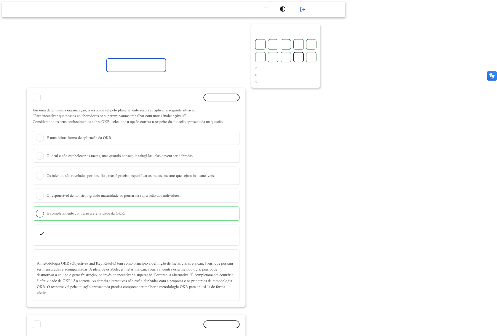 Você acertou 9 de 10 questões Verifique o seu desempenho e continue treinando! Você pode refazer o exercício quantas vezes quiser. Verificar Desempenho A B C D E 1 Marcar para revisão Em uma determinada organização, o responsável pelo planejamento resolveu aplicar a seguinte situação: "Para incentivar que nossos colaboradores se superem, vamos trabalhar com metas inalcançáveis". Considerando os seus conhecimentos sobre OKR, selecione a opção correta a respeito da situação apresentada na questão. É uma ótima forma de aplicação da OKR. O ideal é não estabelecer as metas, mas quando conseguir atingi-las, elas devem ser dobradas. Os talentos são revelados por desafios, mas é preciso especificar as metas, mesmo que sejam inalcançáveis. O responsável demonstrou grande maturidade ao pensar na superação dos indivíduos. É completamente contrário à efetividade da OKR. Resposta correta Parabéns, você selecionou a alternativa correta. Confira o gabarito comentado! Gabarito Comentado A metodologia OKR (Objectives and Key Results) tem como princípio a definição de metas claras e alcançáveis, que possam ser mensuradas e acompanhadas. A ideia de estabelecer metas inalcançáveis vai contra essa metodologia, pois pode desmotivar a equipe e gerar frustração, ao invés de incentivar a superação. Portanto, a alternativa "É completamente contrário à efetividade da OKR" é a correta. As demais alternativas não estão alinhadas com a proposta e os princípios da metodologia OKR. O responsável pela situação apresentada precisa compreender melhor a metodologia OKR para aplicá-la de forma efetiva. 2 Marcar para revisão Questão 9 de 10 Corretas (9) Incorretas (1) Em branco (0) 1 2 3 4 5 6 7 8 9 10 Exercicio O Uso Do Okr Para Alcançar Os Objetivos Estratégicos Sair A B C D E A B C Considere o seguinte exemplo de resultado-chave: "Vender 5.000 licenças de um determinado software até o final do primeiro semestre do ano XZ" Agora, selecione a opção correta a respeito desse resultado-chave. O exemplo está correto, pois se refere a um produto de tecnologia. O exemplo está errado, pois não descreve o produto que deve ser vendido. Está errado, pois não está claro a que ano o resultado-chave se refere. Está correto, pois apresenta o que deve ser medido e o prazo. O exemplo está errado, pois não associa responsáveis às vendas. Resposta correta Parabéns, você selecionou a alternativa correta. Confira o gabarito comentado! Gabarito Comentado Um resultado-chave eficaz deve apresentar um objetivo específico e um prazo para alcançá-lo. No exemplo dado, o objetivo é vender 5.000 licenças de um software específico e o prazo é até o final do primeiro semestre do ano XZ. Portanto, a alternativa D está correta. As demais alternativas estão incorretas por diversos motivos. A alternativa A sugere que o exemplo é correto apenas porque se refere a um produto de tecnologia, o que não é um requisito para um resultado-chave. A alternativa B está errada porque o produto a ser vendido está claramente descrito como "licenças de um determinado software". A alternativa C está incorreta porque o ano é especificado como "ano XZ". Por fim, a alternativa E está errada porque a associação de responsáveis não é um requisito para um resultado-chave. A atribuição de responsabilidades ocorre durante o detalhamento do planejamento. 3 Marcar para revisão Considere a metodologia OKR e seus componentes fundamentais. Agora, selecione a opção que apresenta um exemplo de resultado-chave. Contratar um desenvolvedor de C#. Garantir que os slides para apresentação estejam ótimos. Tornar-se a melhor empresa na área de marketing digital. D E A B C D E Aumentar a produção de equipamentos em 30% no primeiro trimestre do ano. Aprender a conversar em inglês. Resposta correta Parabéns, você selecionou a alternativa correta. Confira o gabarito comentado! Gabarito Comentado Na metodologia OKR, um componente fundamental é o resultado-chave. Este deve conter uma descrição clara de como um objetivo será medido e o prazo esperado para sua realização. Nesse contexto, a alternativa D, que propõe "aumentar a produção de equipamentos em 30% no primeiro trimestre do ano", é a única que se enquadra como um resultado-chave. Ela estabelece um objetivo mensurável e um prazo específico para sua realização. As demais alternativas apresentam descrições genéricas de objetivos, que não se enquadram como resultados-chave na metodologia OKR. 4 Marcar para revisão A metodologia OKR se baseia em três pilares essenciais. Acerca de seus conceitos, considere a frase abaixo: "Aprender OKR em 7 dias" Agora, selecione a opção correta que apresenta o componente a que ela se refere. Objetivo. Resultado-chave. Iniciativa. Esforço. Demanda. Resposta correta Parabéns, você selecionou a alternativa correta. Confira o gabarito comentado! Gabarito Comentado A frase "Aprender OKR em 7 dias" é um exemplo de um resultado-chave na metodologia OKR. Isso porque ela estabelece uma meta mensurável que ajuda a alcançar um objetivo maior. Nesse caso, o objetivo poderia ser, por exemplo, "Implementar a metodologia OKR na empresa". O resultado-chave, então, seria aprender a metodologia em um período específico de tempo. Portanto, a frase não se refere a um objetivo ou a uma iniciativa, que são outros componentes da metodologia OKR. Além disso, as opções "esforço" e "demanda" não são componentes da metodologia OKR, tornando a alternativa B a resposta correta. A B C D E A B C 5 Marcar para revisão Sobre o atributo REPRESENTABILIDADE, pode-se afirmar que: Possibilitam a identificação da origem e da forma como foram registrados. Mantêm uma linha lógica de evolução onde os mesmos parâmetros servem de base. Abordam suas relevâncias e permitem a indicação de métricas válidas para a avaliação do processo. Permitem coletar os dados sempre que seja necessário. Pode