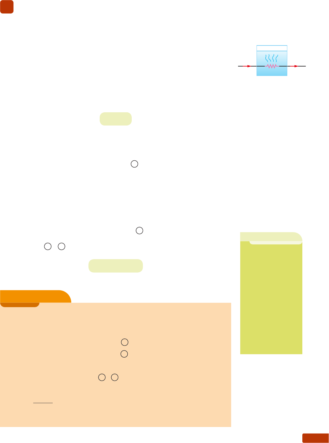 Energia e potência elétrica 131 5. O resistor usado como elemento aquecedor de água Nos chuveiros elétricos, nas torneiras elétricas, nos reservatórios de água de aqueci- mento central, o elemento usado para aquecer a água é o resistor. No nosso estudo, vamos usar o reservatório de água da figura 8, em que a água será aquecida por um resistor. Vamos supor um caso ideal: que esse reservatório possua paredes adiabáticas, por- tanto: não perderá calor para o ambiente. Sua capacidade térmica é desprezível. Assim, podemos dizer que a energia elétrica dissipada pelo resistor será convertida em energia térmica, a qual será totalmente absorvida pela água sob a forma de calor: E el = Q Mantendo-se o sistema ligado durante um certo intervalo de tempo Δt, a energia elétrica dissipada pelo resistor é dada por: E el = P ∙ Δt 1 A quantidade de calor transferida à água faz com que ela sofra um aquecimento e eleve a sua temperatura de um valor Δθ. Vamos admitir, por hipótese, que a água não entre em ebulição. Deste modo, sendo c o calor específico da água e m a massa de água do reservató- rio, poderemos escrever: Q = m ∙ c ∙ Δθ 2 As equações 1 e 2 podem ser igualadas, conforme a nossa hipótese inicial: P ∙ Δt = m ∙ c ∙ Δθ Vamos usar um resistor elétrico de potência 800 W, durante 30 s, aquecendo uma massa de 500 g de água. Calculemos a elevação de temperatura da água. Adotemos o calor específico da água como sendo c = 4 000 J/(kg ∙ ºC). E el = P ∙ Δt ⇒ E el = 800 ∙ 30 = 24 000 J 1 Q = m ∙ c ∙ Δθ ⇒ Q = 0,5 ∙ 4 000 ∙ Δθ 2 Sabemos que: E el = Q o que nos permite igualar as equações 1 e 2 : 0,5 ∙ 4 000 ∙ Δθ = 24 000 Δθ = 24 000 2 000 ⇒ Δθ = 12 °C A elevação da temperatura da água foi de 12 °C nesses 30 s de aquecimento. exemplo 3 i i Figura 8. Resistor imerso na água. ObseRvaçãO Para o uso desta equação, devemos ter muito cuidado com as unidades. O ideal é usar todas as unidades no SI. Na calorimetria é muito comum o uso da caloria, que deverá ser convertida em joule. Z A P t Capítulo 7132 exercícios de aplicação 37. Em um recipiente ideal, temos 600 g de água, inicialmente a 10 °C. Um resistor imerso na água vai aquecê-la até a temperatura de 60 °C e, para tanto, ele deverá permanecer ligado durante 4 minutos. Sendo dado o calor específico da água c = 4 000 J/(kg ∙ ºC), determine a potência elé- trica dissipada pelo resistor. Resolução: Inicialmente, vamos calcular a quantidade de calor absorvida pela água. A variação de temperatura foi de: Δθ = 60 ºC – 10 ºC = 50 ºC Q = m ∙ c ∙ Δθ Q = 0,6 ∙ 4 000 ∙ 50 = 120 000 J Como o recipiente é ideal, toda energia elétrica dissipada pelo resistor, sob a forma de energia térmica, será absorvida pela água. Podemos, pois, escrever: E el = Q ⇒ P ∙ Δt = Q Devemos tomar cuidado sempre com a unidade de tempo, convertendo minutos em segundos: 4 minutos = 4 ∙ 60 s = 240 s P ∙ 240 = 120 000 ⇒ P = 500 W Determinemos: a) a potência elétrica dissipada pelo resistor; b) o intervalo de tempo necessário para aquecer a água do reservatório. Resolução: a) Temos os seguintes dados: U = 120 V e R = 14,4 Ω A potência dissipada no resistor se calcula por: P = U2 R ⇒ P = (120)2 14,4 = 14 400 14,4 ⇒ ⇒ P = 1 000 W b) Sendo as paredes adiabáticas, não haverá perda de calor para o meio ambiente. Como é desprezível o calor absorvido pelas paredes, toda energia elétrica dissipada pelo resistor, sob a forma de energia térmica, será absorvi- da pela água. Podemos, pois, escrever: E el = Q ⇒ P ∙ Δt = m ∙ c ∙ Δθ 1 Temos, no reservatório, 18 litros de água cuja massa é m = 18 kg, pois cada 1 litro tem massa de 1 kg. A variação de temperatura é: Δθ = 70 ºC – 20 ºC = 50 ºC Substituindo-se esses valores na equação 1 , vem: 1 000 ∙ Δt = 18 ∙ 4,0 ∙ 103 ∙ 50 ⇒ ⇒ Δt = 18 ∙ 4,0 ∙ 50 ⇒ ⇒ Δt = 3 600 s = 1,0 h 38. Em um recipiente ideal, temos 0,5 L de água, inicialmente a 25 °C. Um resistor imerso na água deverá aquecê-la até a temperatura de 55 °C. O aquecimento durou 21 minutos. Sendo dado o calor específico da água, c = 4,2 ∙ 103 J/(kg ∙ ºC), determine a potência elétrica dissipada pelo resistor. 39. Um resistor de resistência R = 14,4 Ω foi imerso num reservatório contendo 18 L de água a 20 °C, com a finalidade de aquecê-la até a temperatu- ra de 70 °C. Ligou-se o resistor a uma fonte de tensão de 120 V. Sabemos que 1,0 litro de água tem massa de 1,0 kg e que o calor específico da água é c = 4,0 ∙ 103 J/(kg ∙ ºC). Despreza-se a capacidade térmica do reservatório. R ii 40. Com um resistor de resistência elétrica R vamos aquecer 1,0 litro de água, inicialmente à tempe- ratura de 19 °C. Pretendemos elevar a temperatu- ra até 100 °C, mas vamos desligar antes de entrar em ebulição. O aquecimento demorou 8 minutos. Adotemos para o calor específico da água o valor de 4,0 ∙ 103 J/(kg ∙ ºC). Determine: a) a potência do resistor; b) a resistência R, sabendo que a tensão elétrica é de 75 V. Z A P t Energia e potência elétrica 133 41. Em um recipiente termicamente isolado, coloca- mos água com gelo fundente (0 °C). No seu inte- rior temos ainda um resistor que, ao ser ligado, passará a fornecer energia térmica ao sistema. A capacidade térmica das paredes do recipiente é desprezível. O resistor é mantido ligado por 10 minutos e ao ser desligado ainda há gelo boiando na superfície da água. São conhecidos os valores: resistência do resistor: R = 10 Ω; tensão elétrica no resistor: U = 40 V; calor de fusão do gelo: L fu = 320 J/g. i i Determinemos: a) a potência elétrica dissipada no resistor; b) a massa de gelo que se fundiu durante os 10 minutos. Resolução: a) A potência do resistor pode ser calculada por: P = U2 R ⇒ P = 402 10 ⇒ P = 160 W b) A quantidade de calor para fundir a massa de gelo 